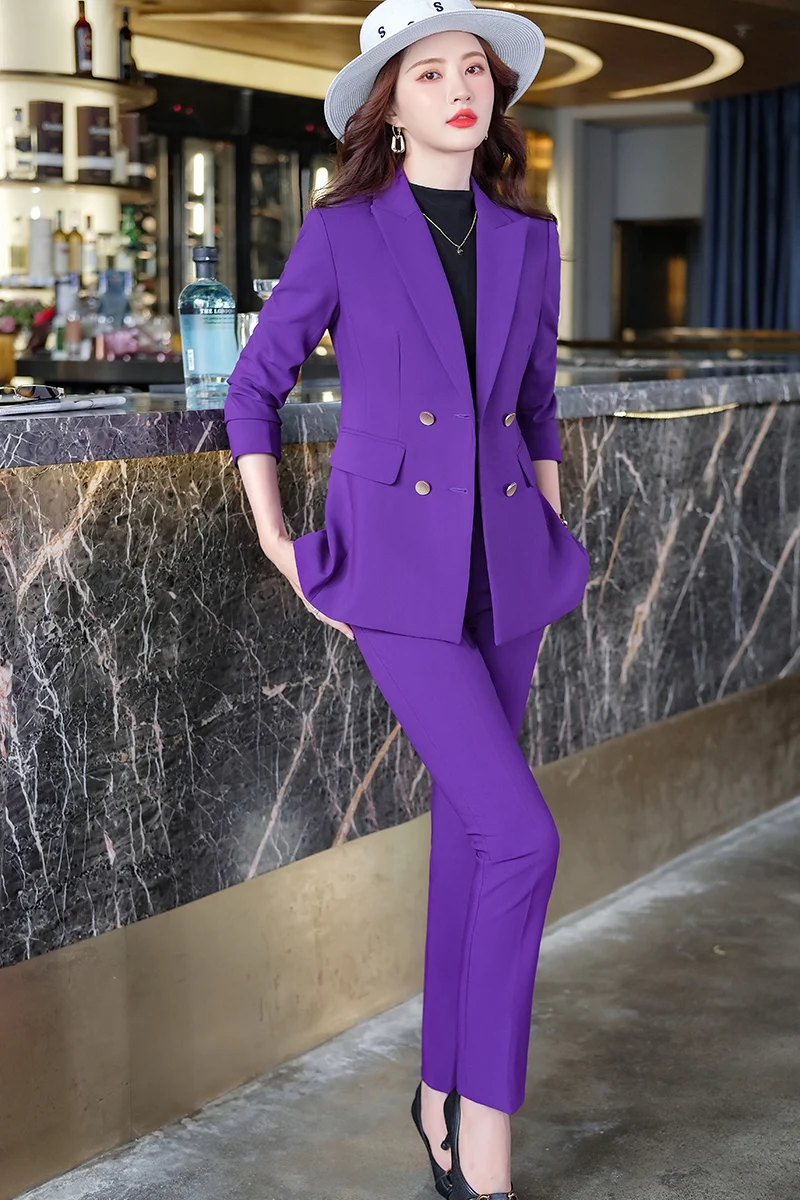 China Factory 2 Piece Set Less is More Simple Pant Suit Blazer Office Lady Design Women Purple Double Breasted Jacket Trouser