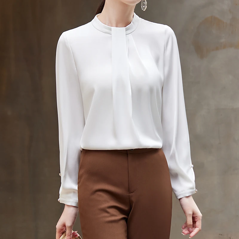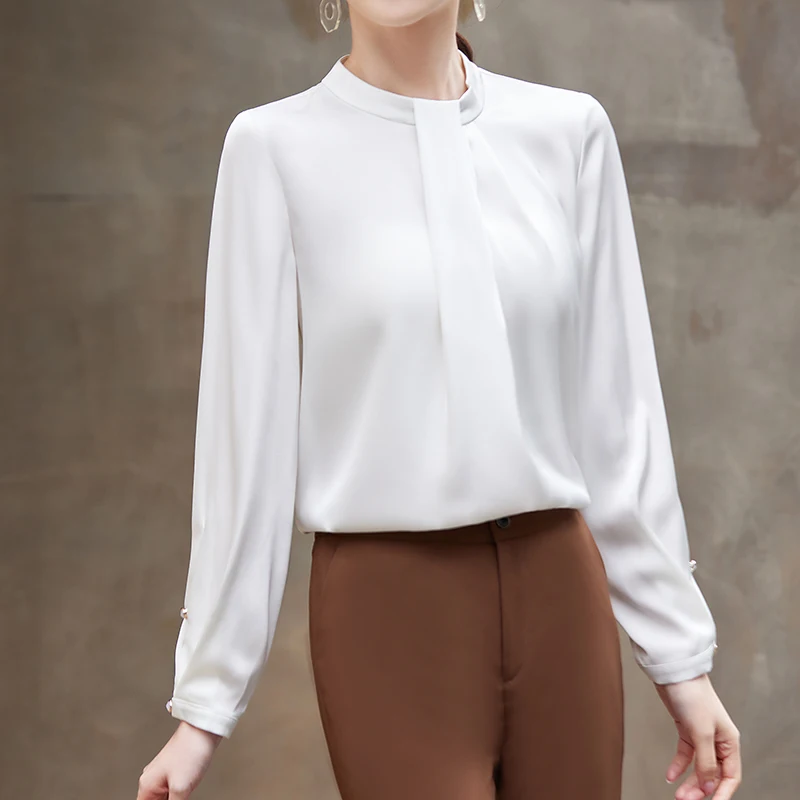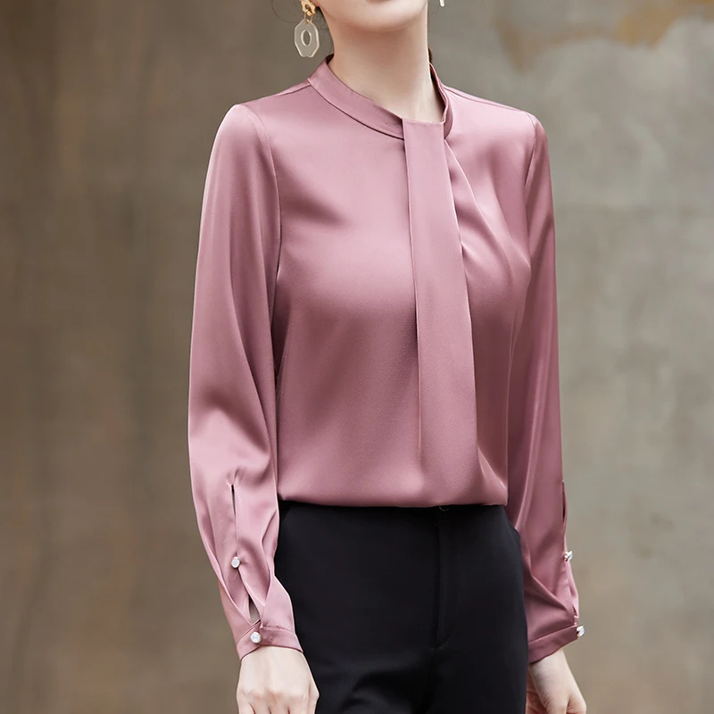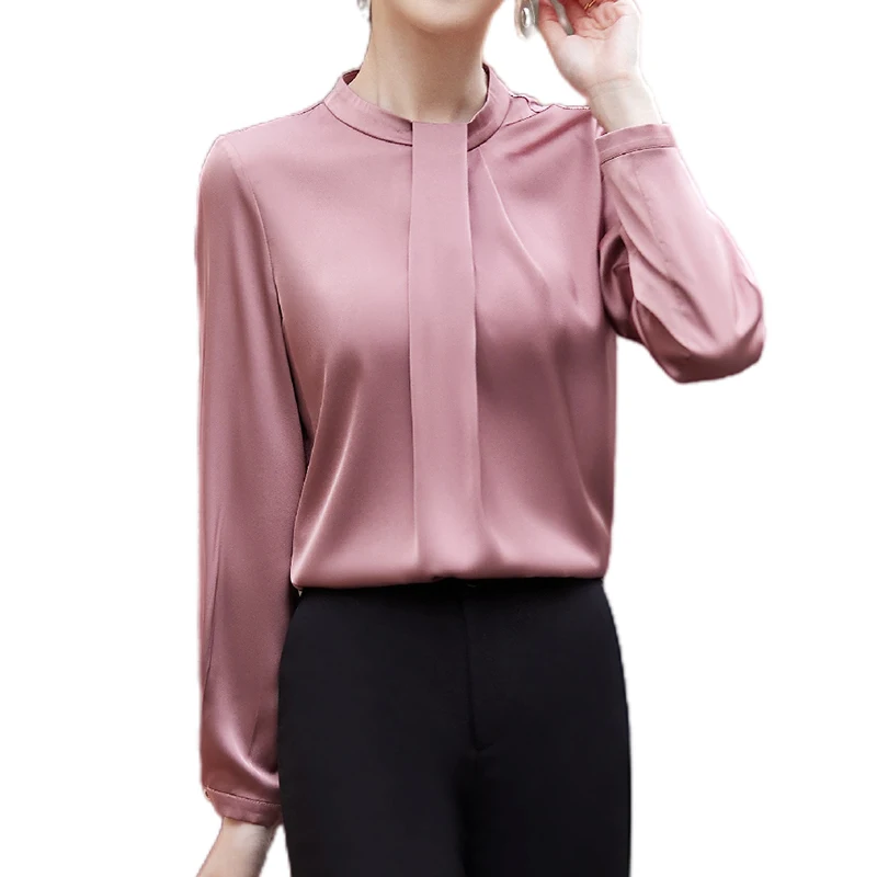 China Factory Women Shiny Fabric Soft Shirts High-quality Blouse Work Office Lady Female Tops Chemise Loose style Stand Colla