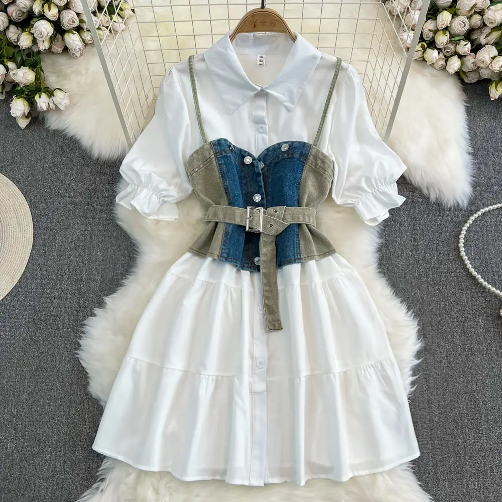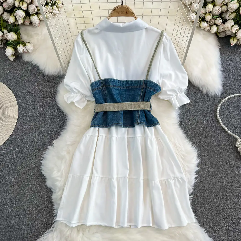 Clashing Denim Vest Vest Women Two Piece Long Sleeve Lapel A-Line White Shirt Dresses