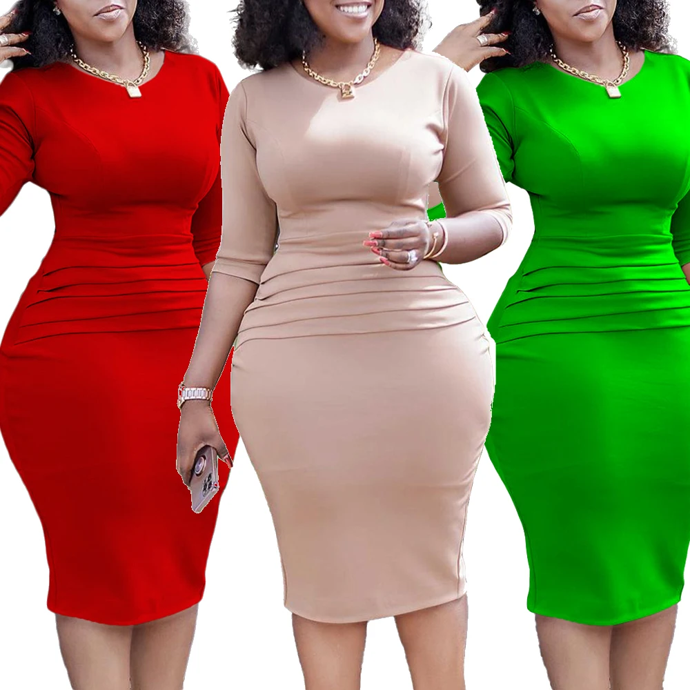 Classic Women Elegant Church Dresses Modest 3/4 Sleeve O Neck Ruched Waist Office Ladies Work Knee Length Pencil Skirts Dress