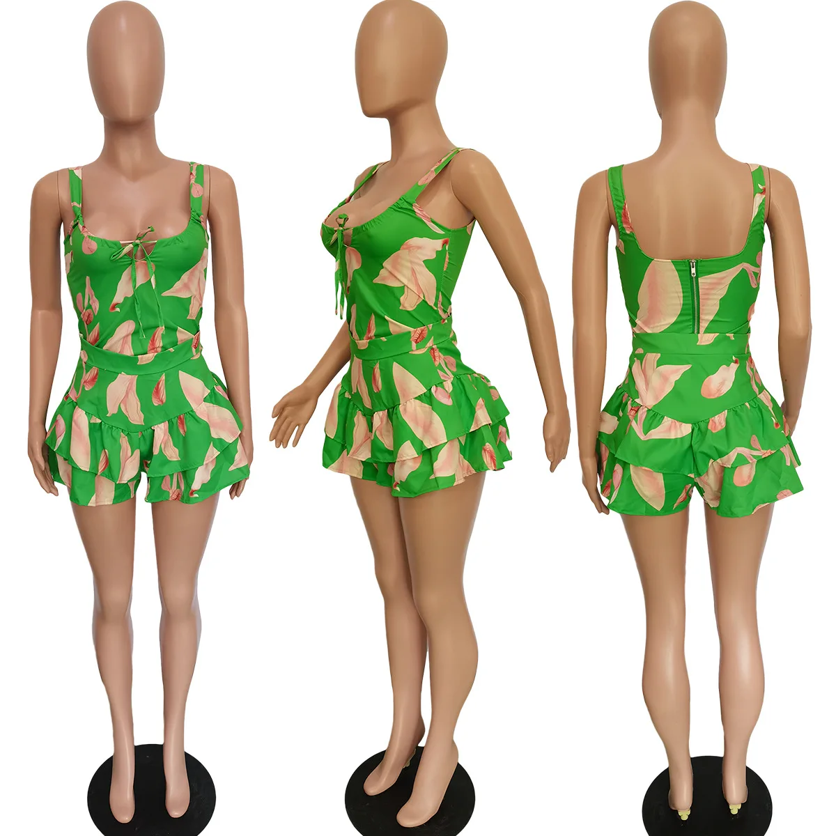 CM.YAYA Elegant Beach Printed Women's Set 2022 Summer Sleeveless Ruffles Hem Tank Crop Tops Shorts Matching Two 2 Piece Set