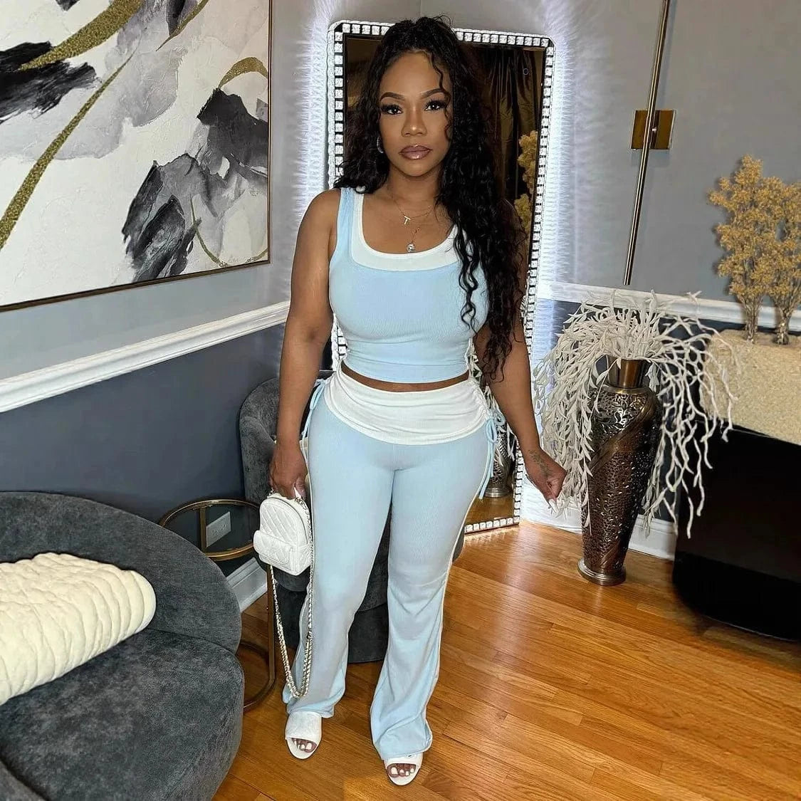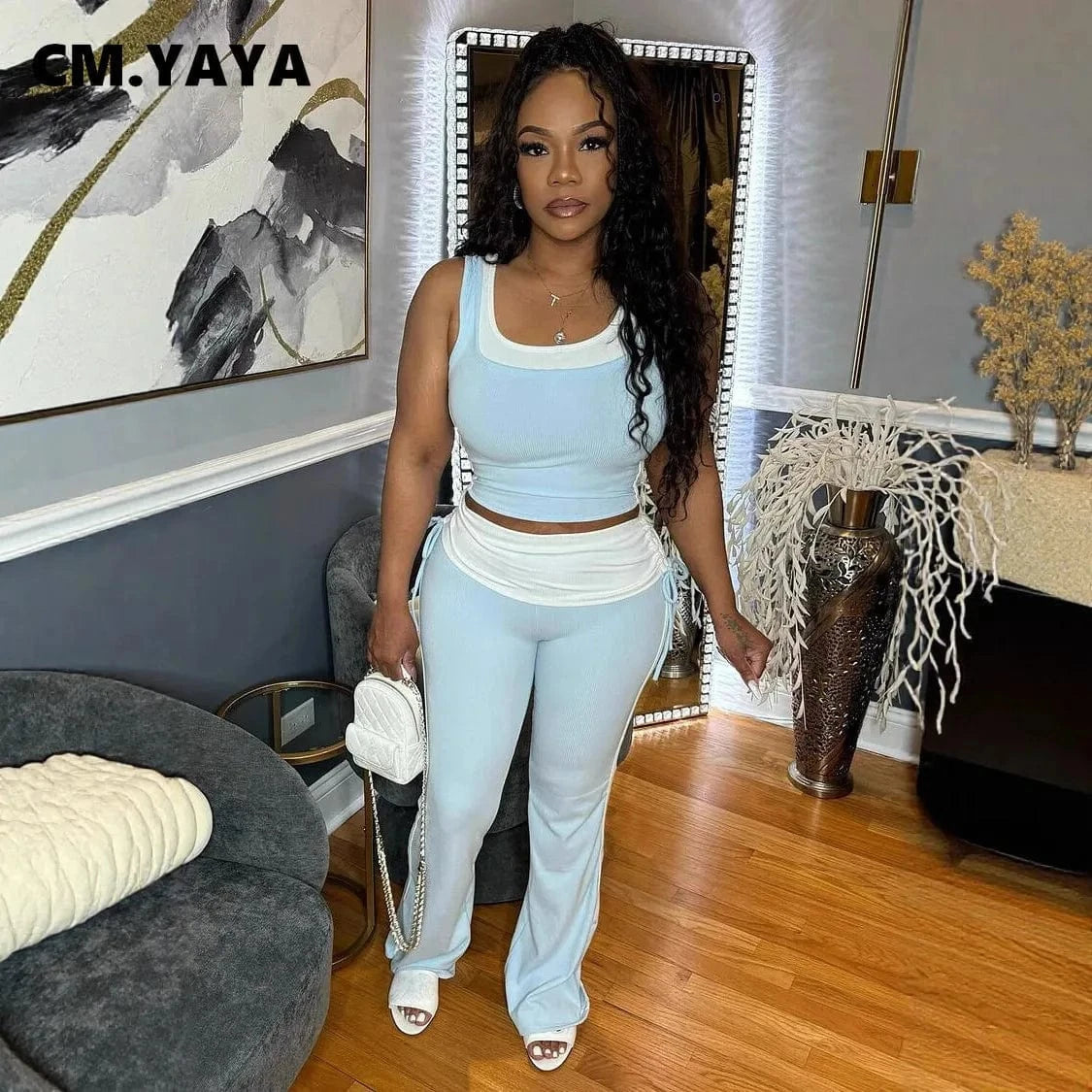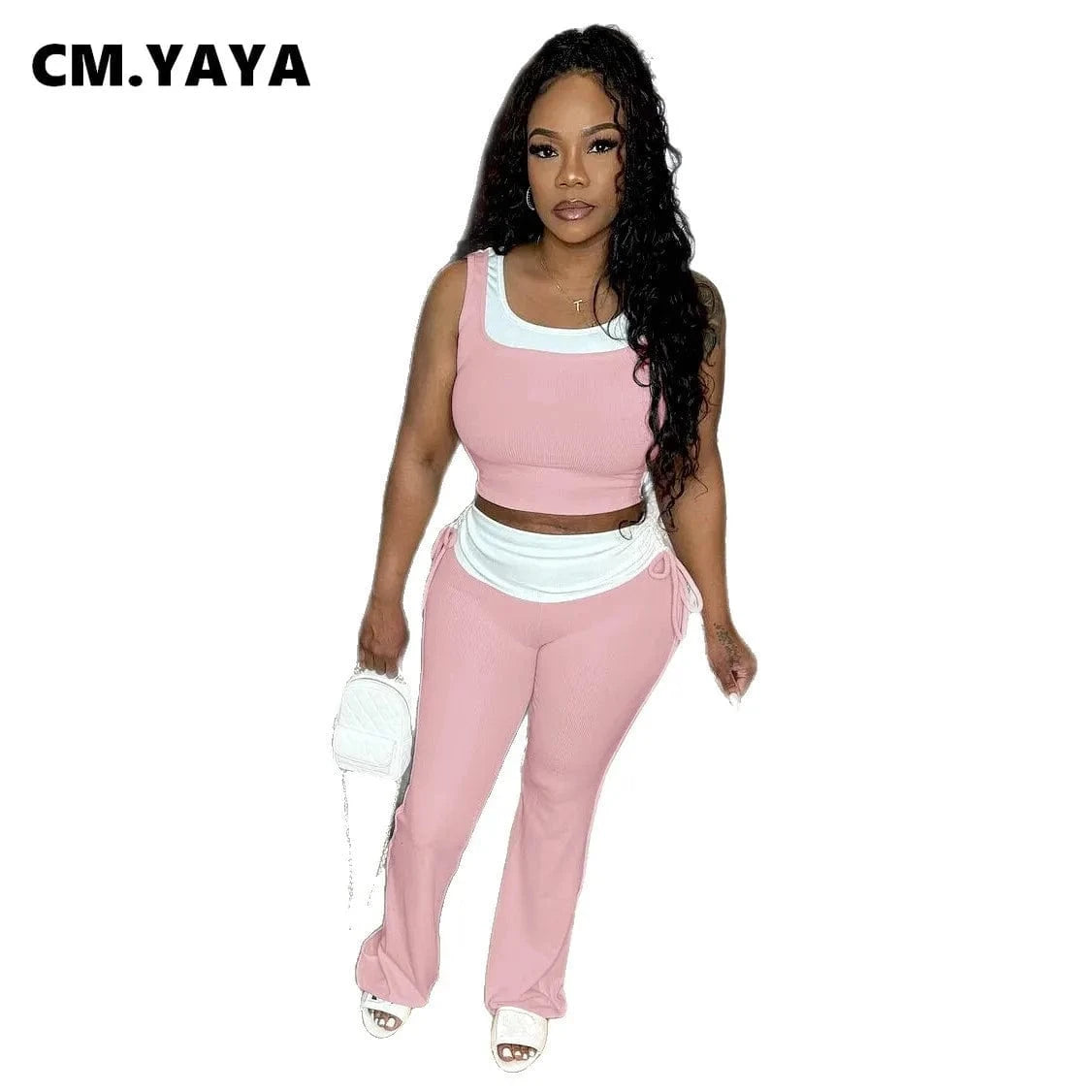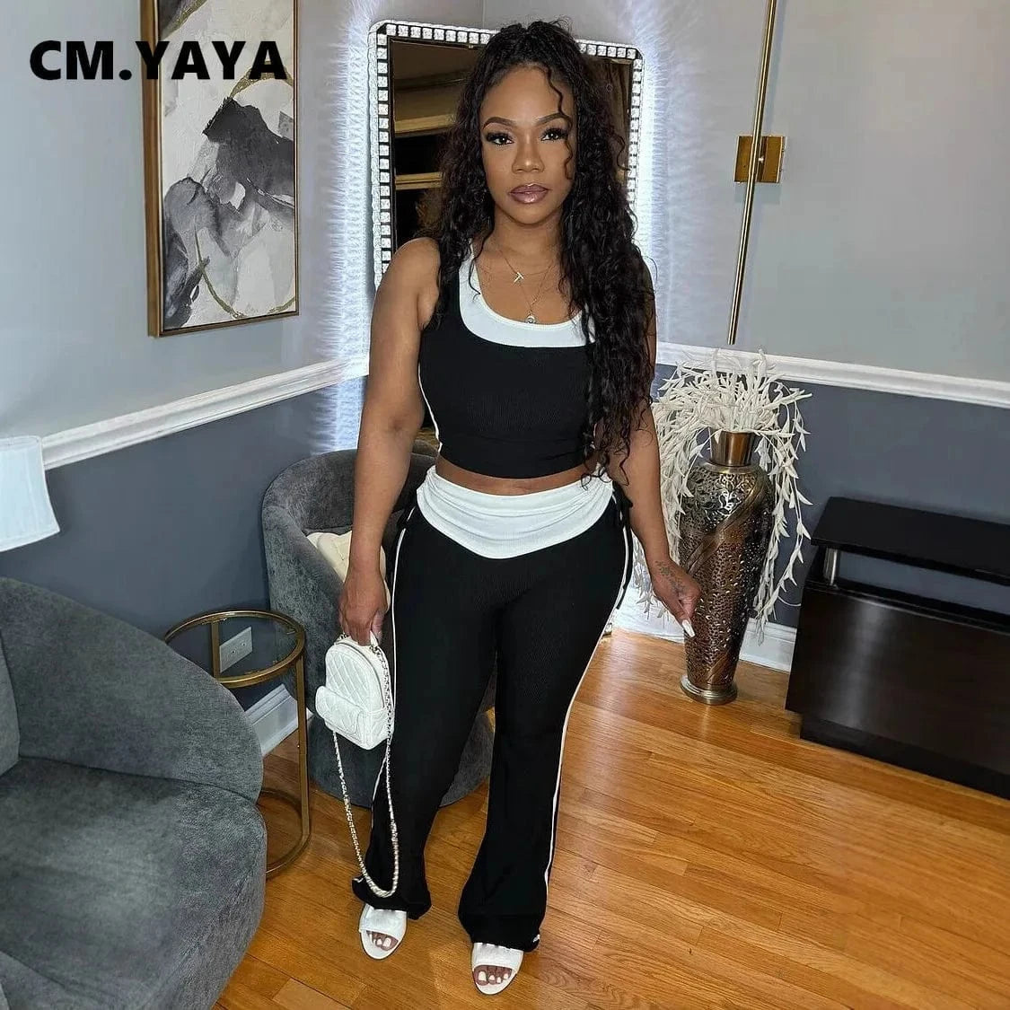 CM.YAYA Fashion Knit Ribbed Patchwork Women's Set Sleeveless Tank Tops and Flare Pants Tracksuit 2025 Two 2 Piece Sets Outfit