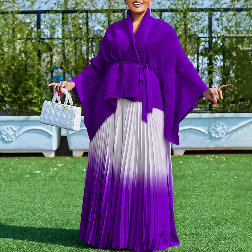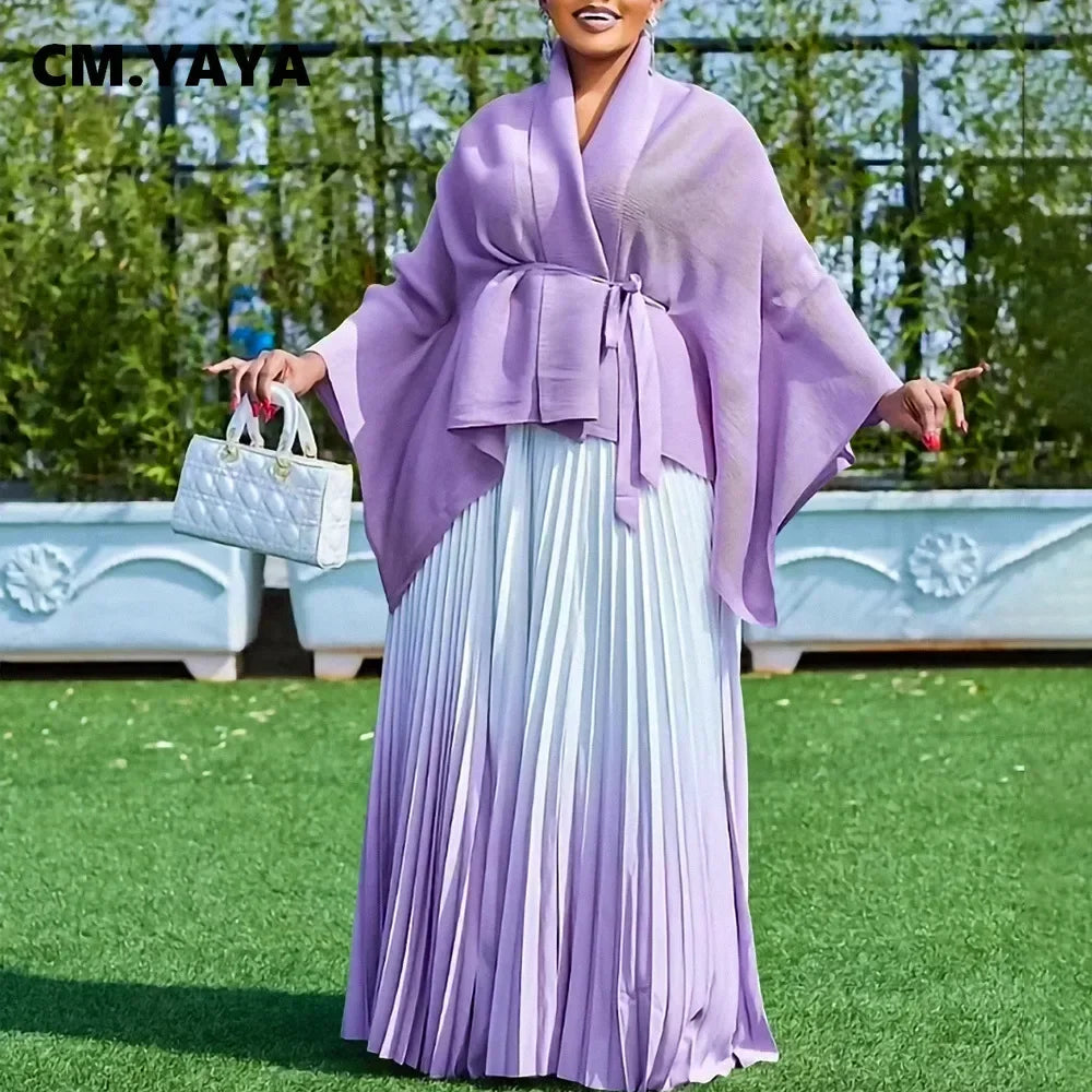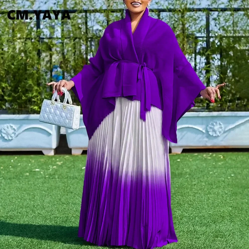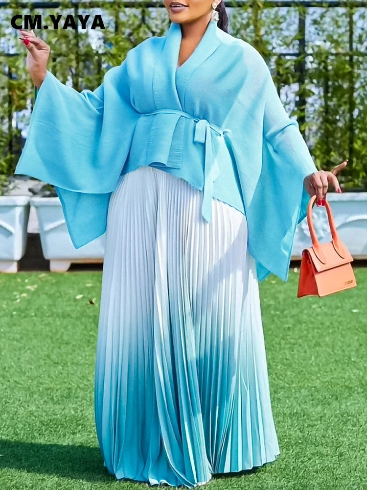 CM.YAYA Gradient Women's Set Full Sleeve Belt Blouse Shirt +Pleated Long Skirts Suit Street Two 2 Piece Set Outfit Tracksuit