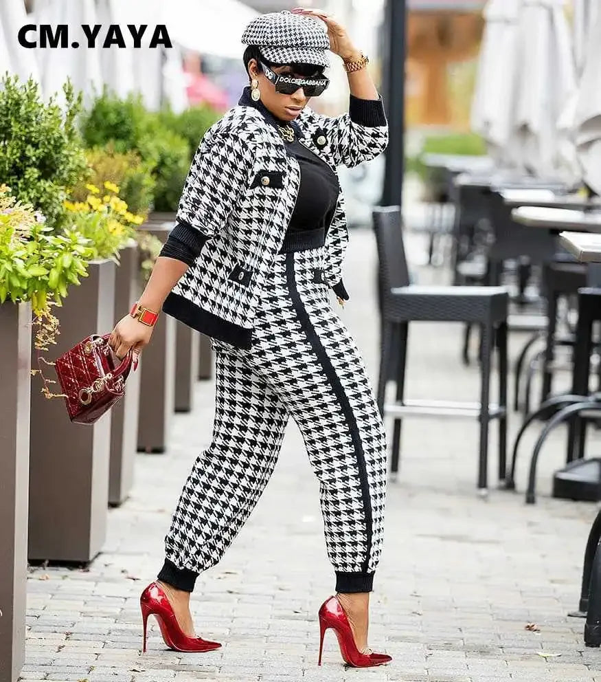 CM.YAYA Houndstooth Patchwork Two 2 Piece Set for Women Vintage Fitness Outfits Jacket + Pants Set Streetwear Tracksuit
