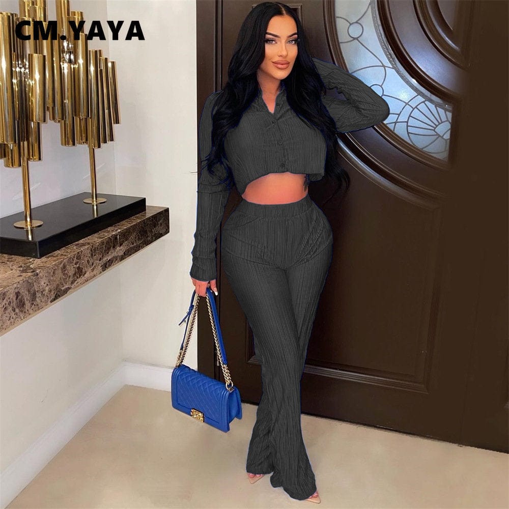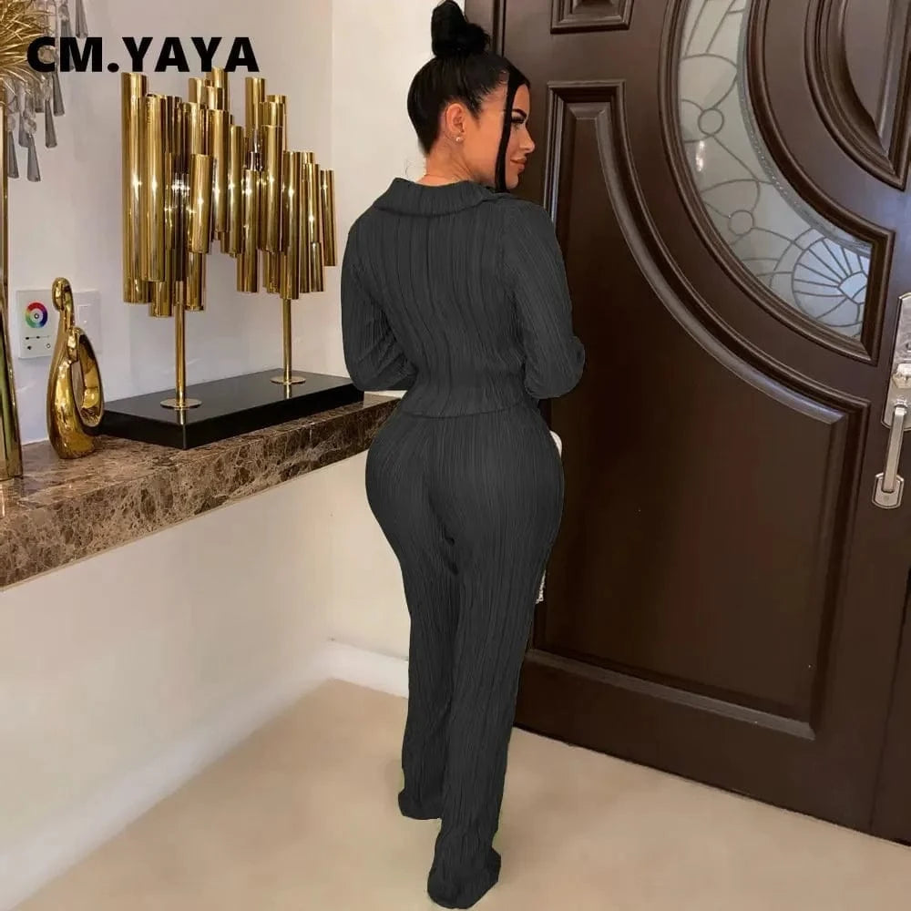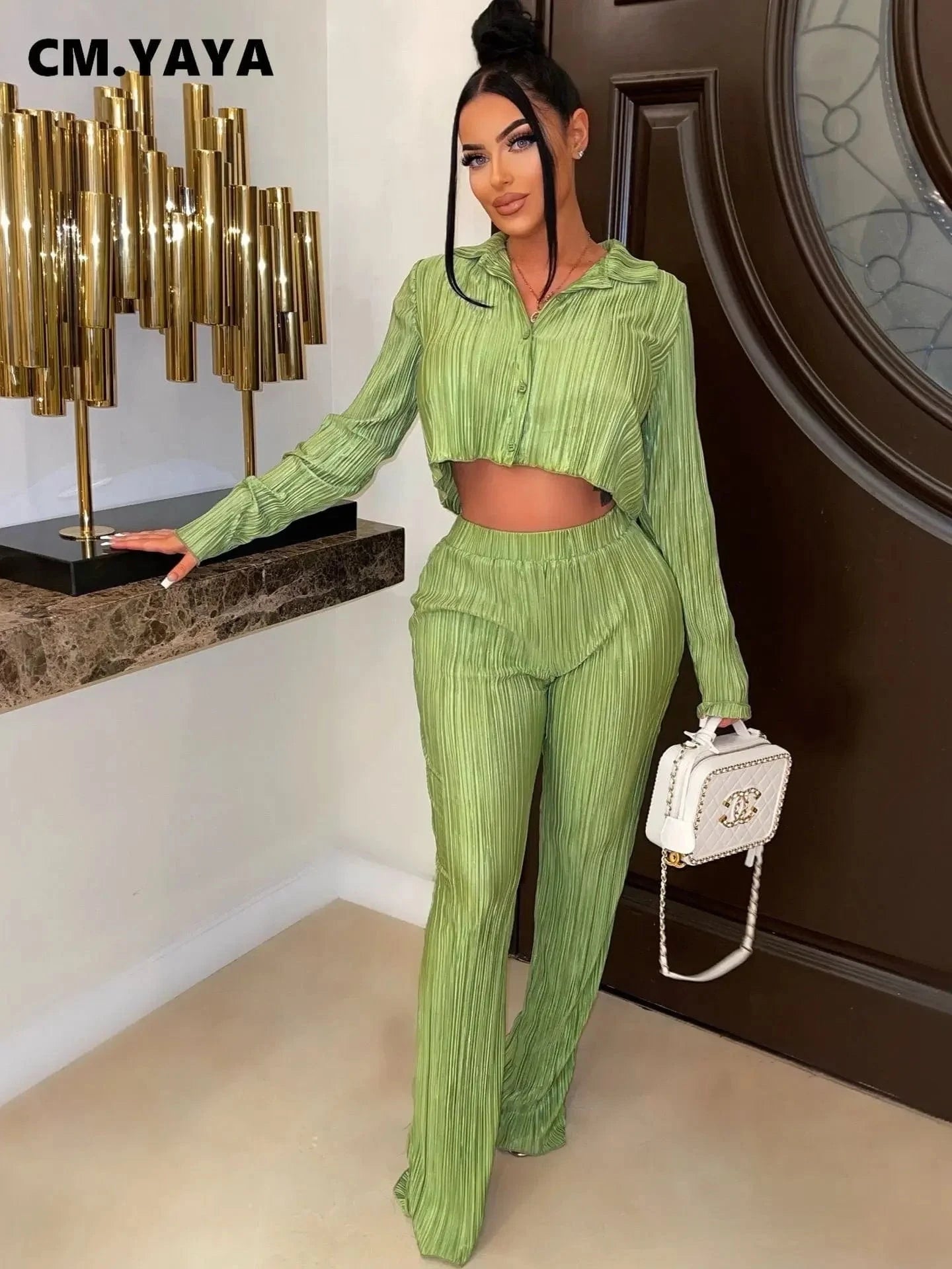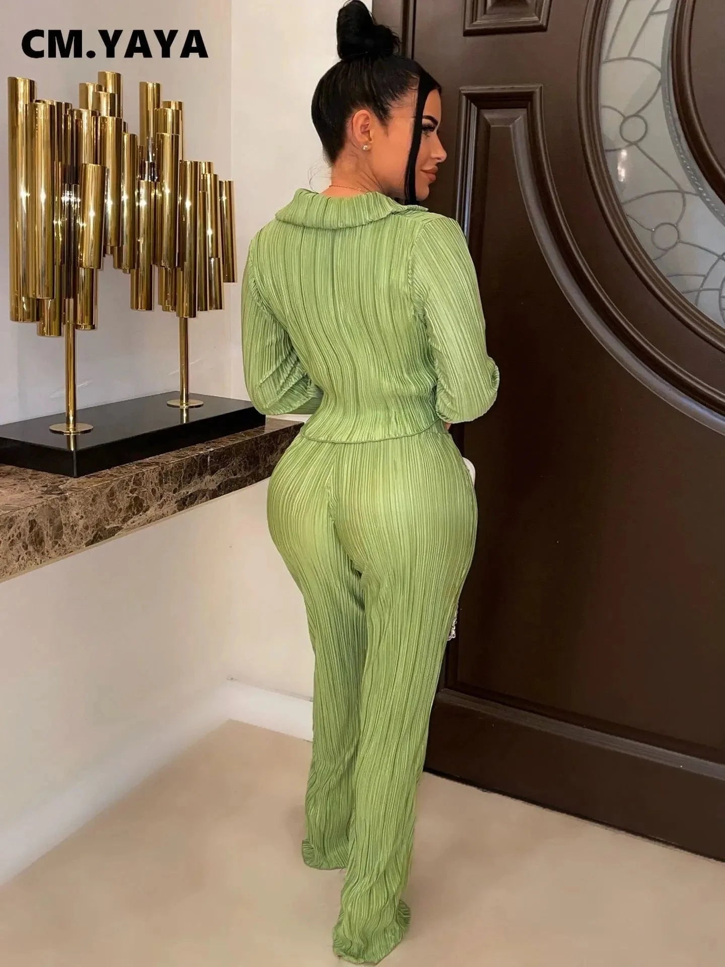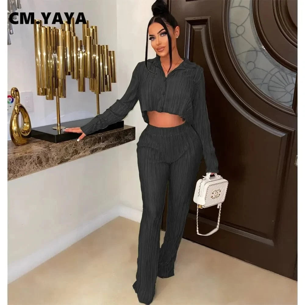 CM.YAYA Street Pleated Women's Set Long Sleeve Mini Blouse Shirt and Straight Pants Suit 2023 Two 2 Piece Set Outfits Tracksuit