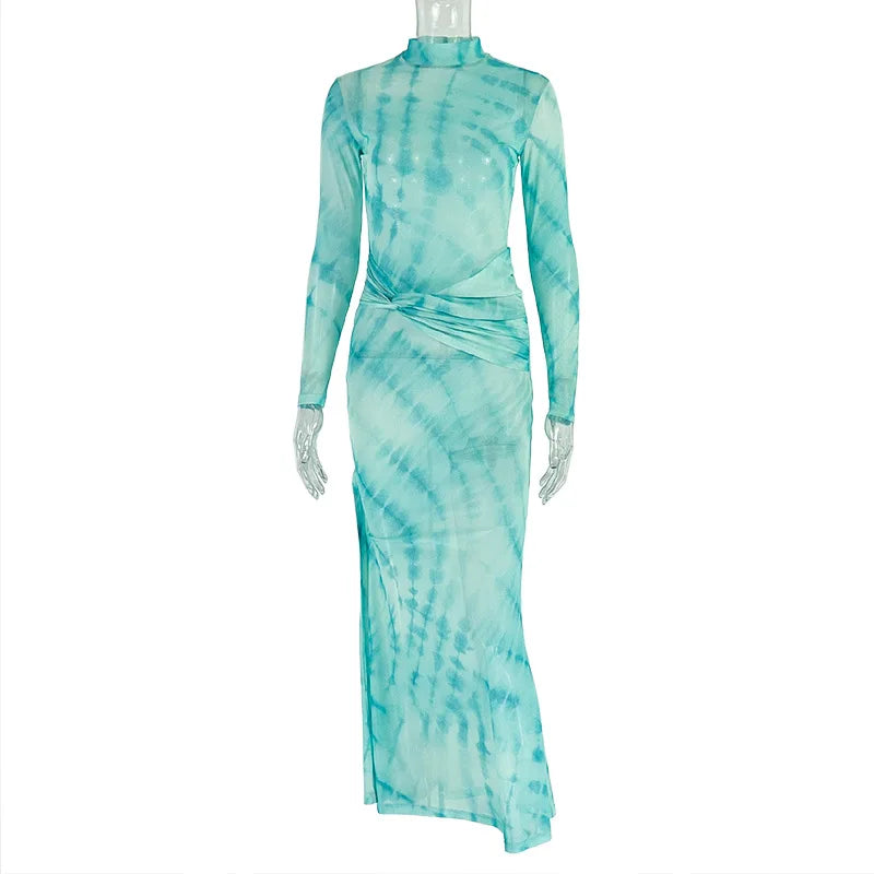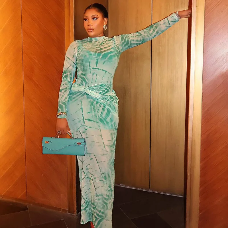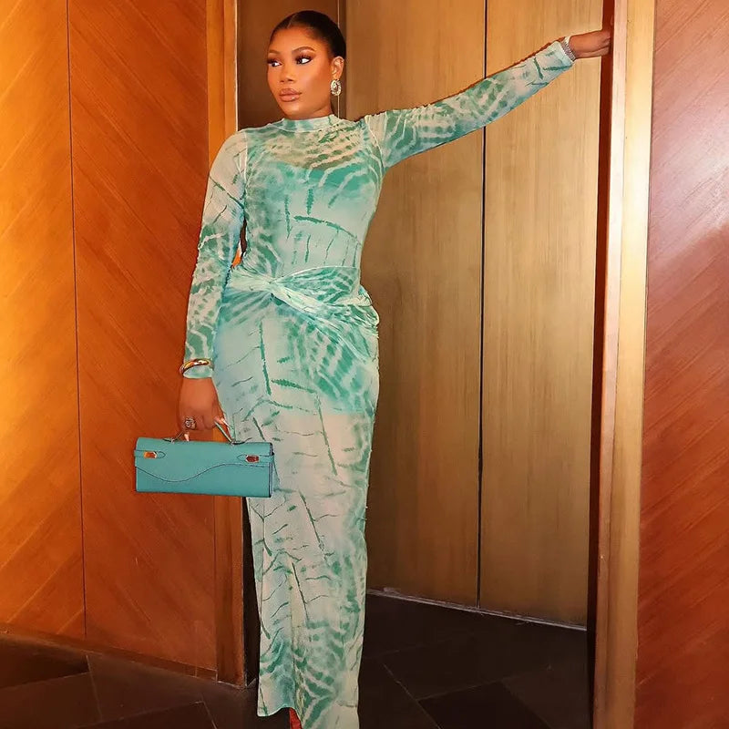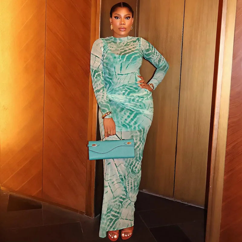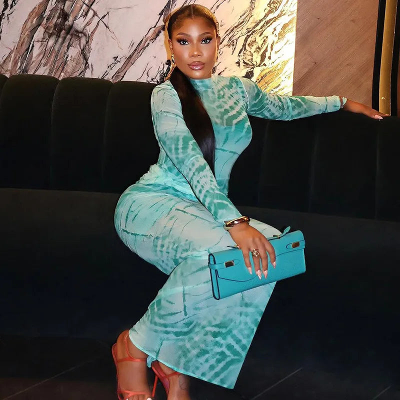 CM.YAYA Women Tie Dye Printed O-neck Bodycon Midi Maxi Long Dress 2025 Summer Holiday Birthday Sexy Club Party Evening Dresses