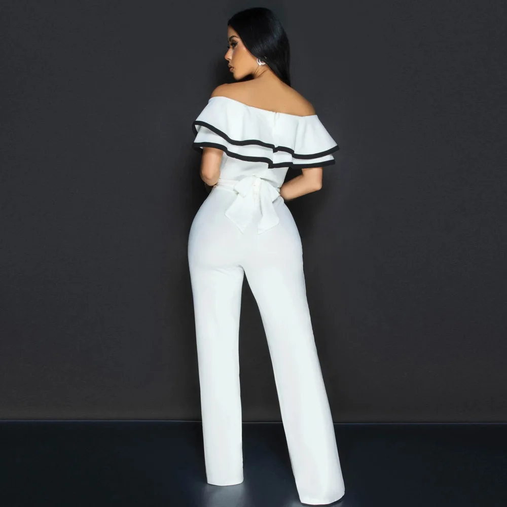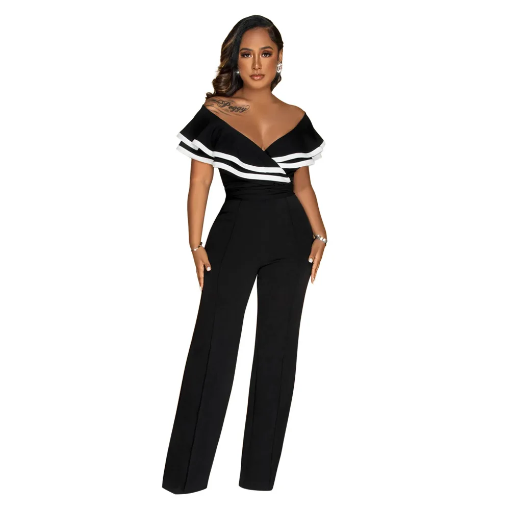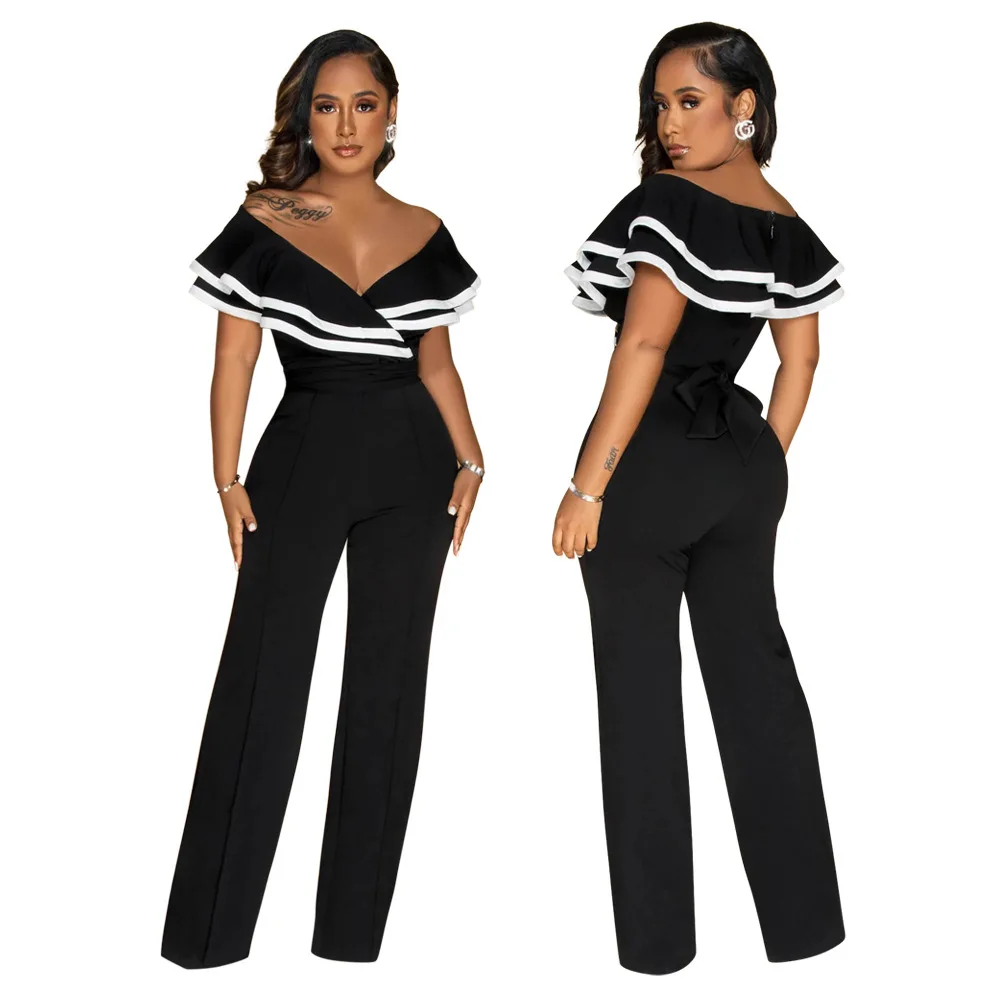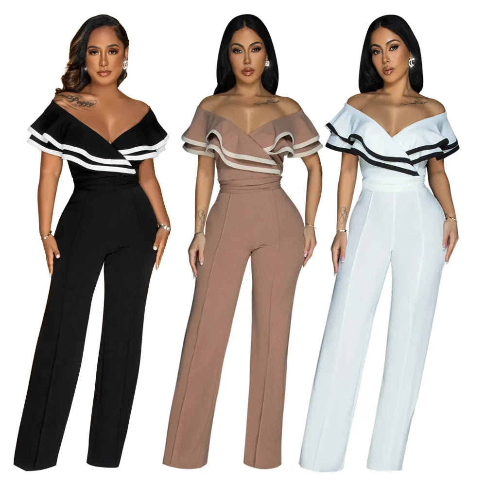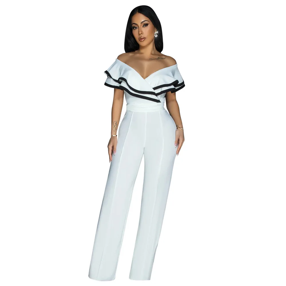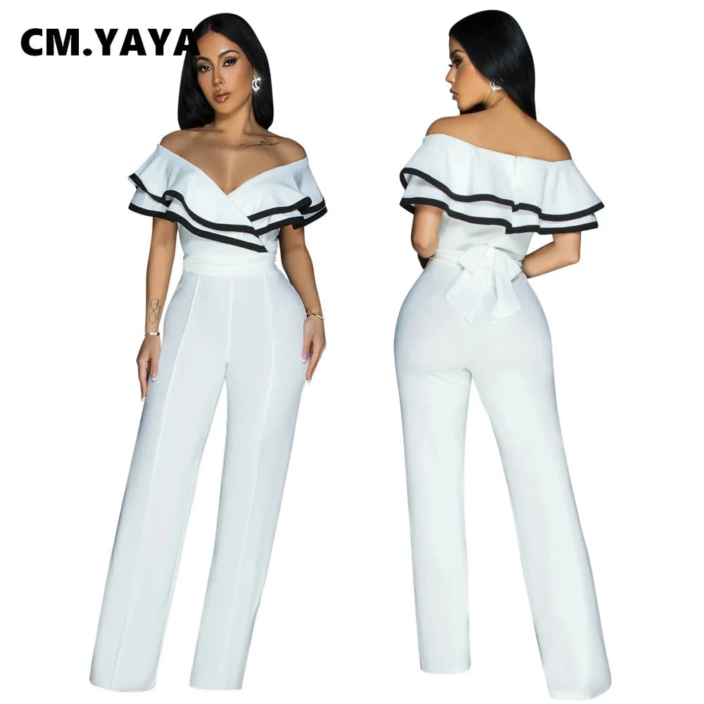 CM.YAYA Women V-neck Off Shoulder Ruffles Wide Leg Jumpsuits 2024 Summer Fashion Sexy Party Playsuit One Piece Suit Rompers
