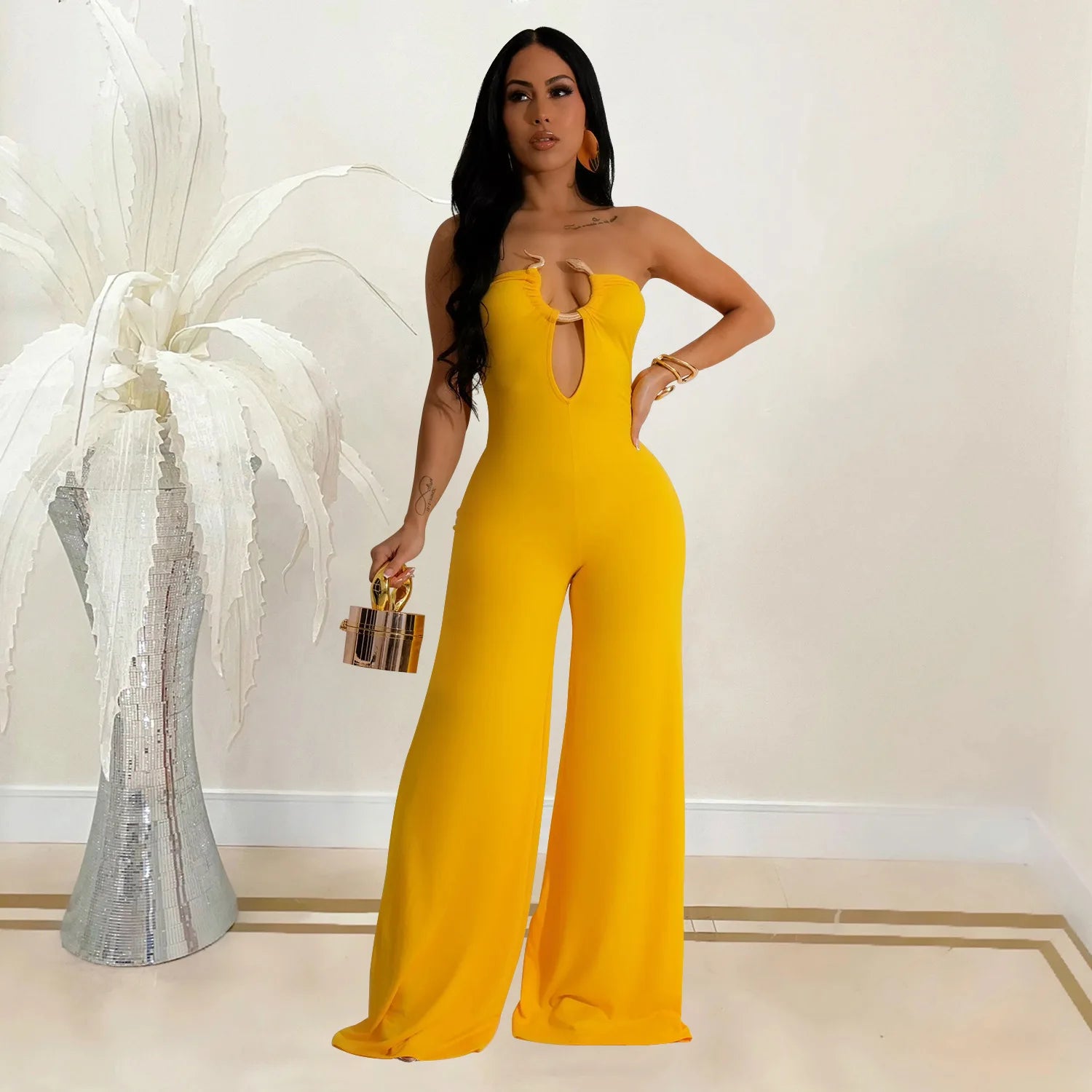 CM.YAYA Women Wide Leg Deep V-Neck Sleeveless Jumpsuits 2024 Summer Hollow Out Night Street Club Playsuit One Piece Suit Romper