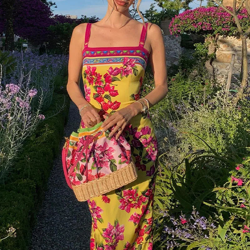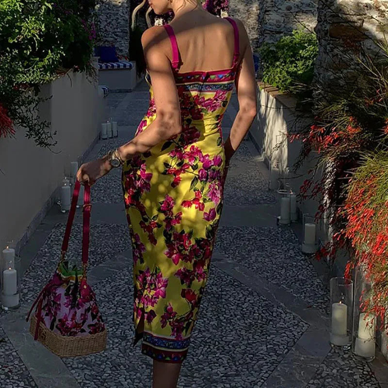 Cocktail Party Backless A-line Dresses Red Printed Summer Suspenders Dress Women's Square Neck Hollowed Out Slim Fit Long Dress