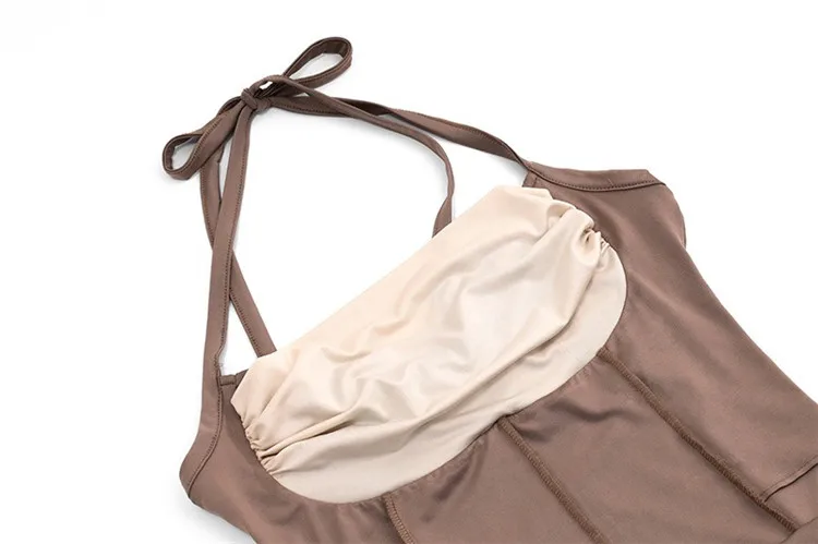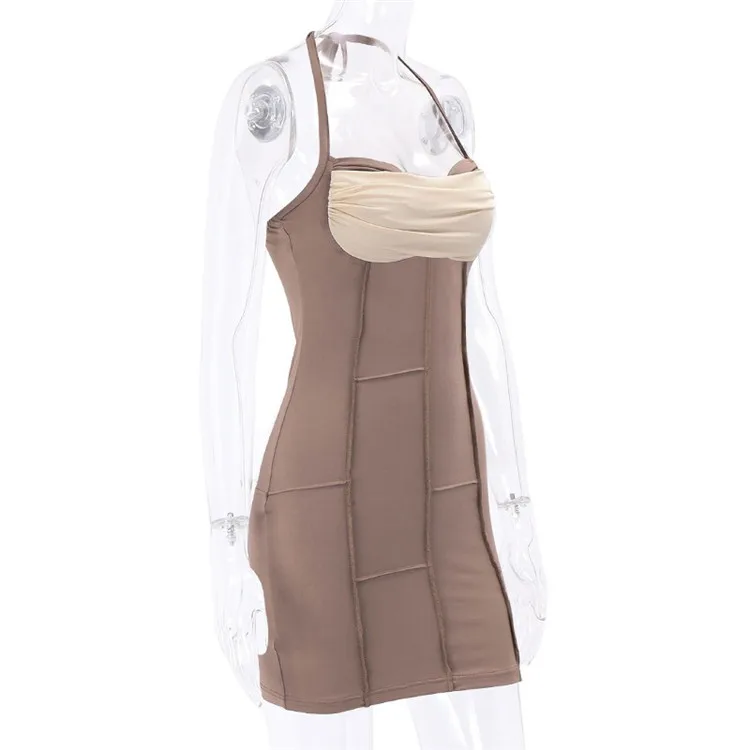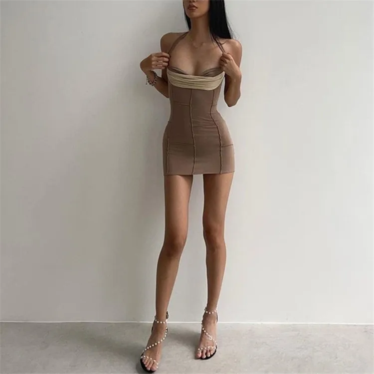 Color Block Mesh Patchwork Holiday Dress Women Halter Neck Backless Bandage Short Dress