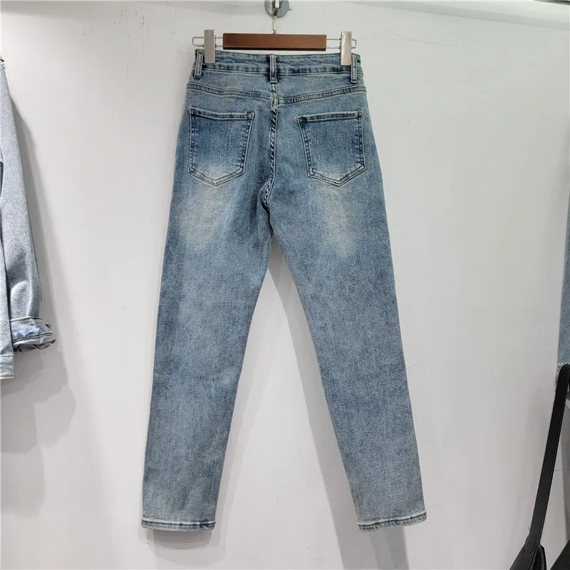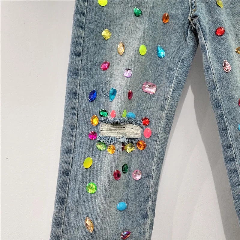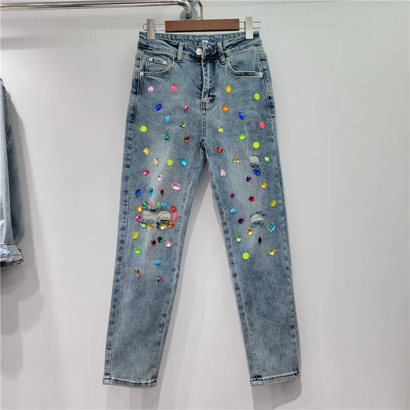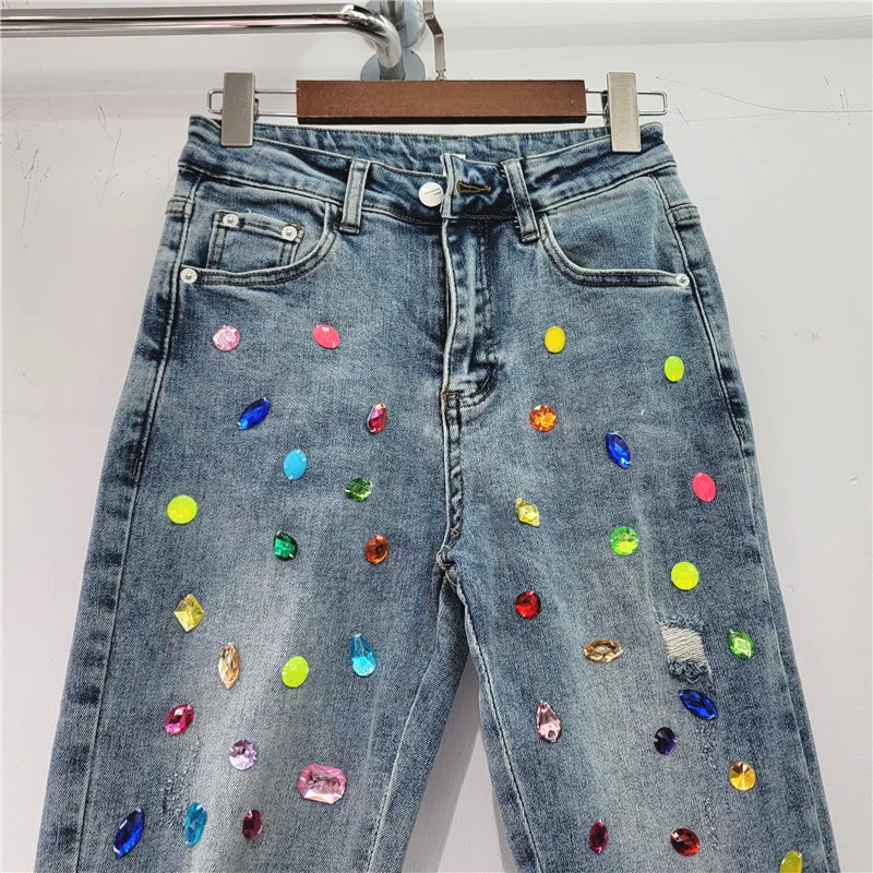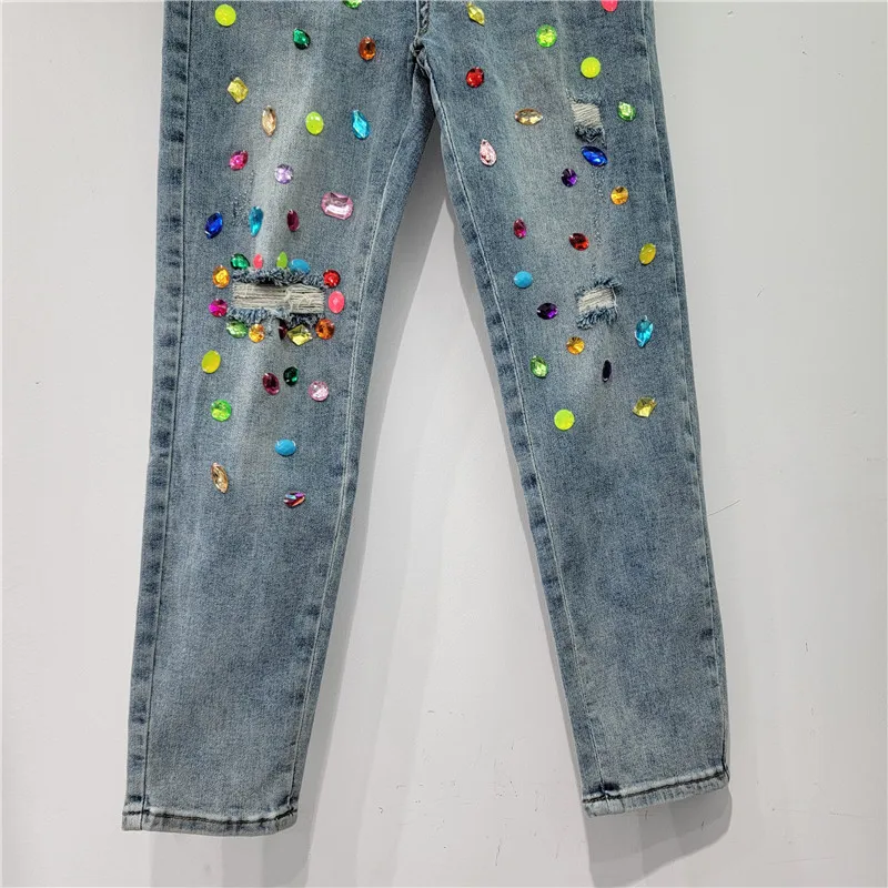 Color Rhinestone Women Jean Pants Fashion High Waist Streetwear Ripped Denim Straight Pants