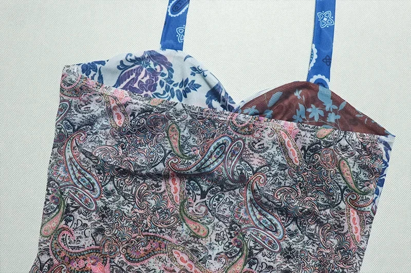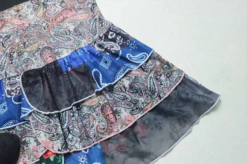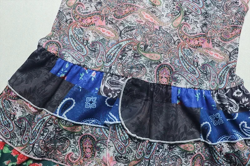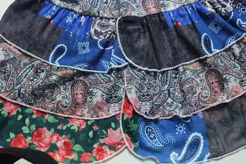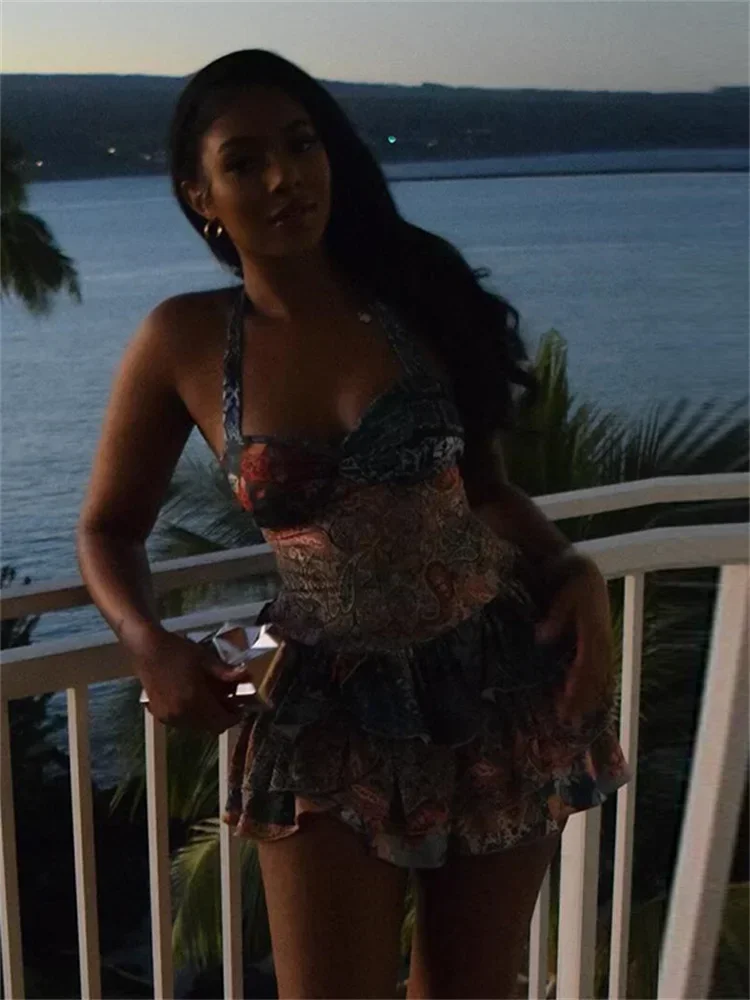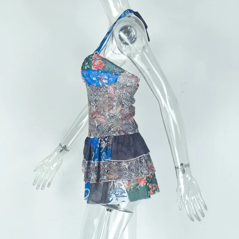 Colorful Print Dress Women Halter Backless Sleeveless Ruched Ruffles Tierred Vacation Beach Party Trend Mini Bodycon