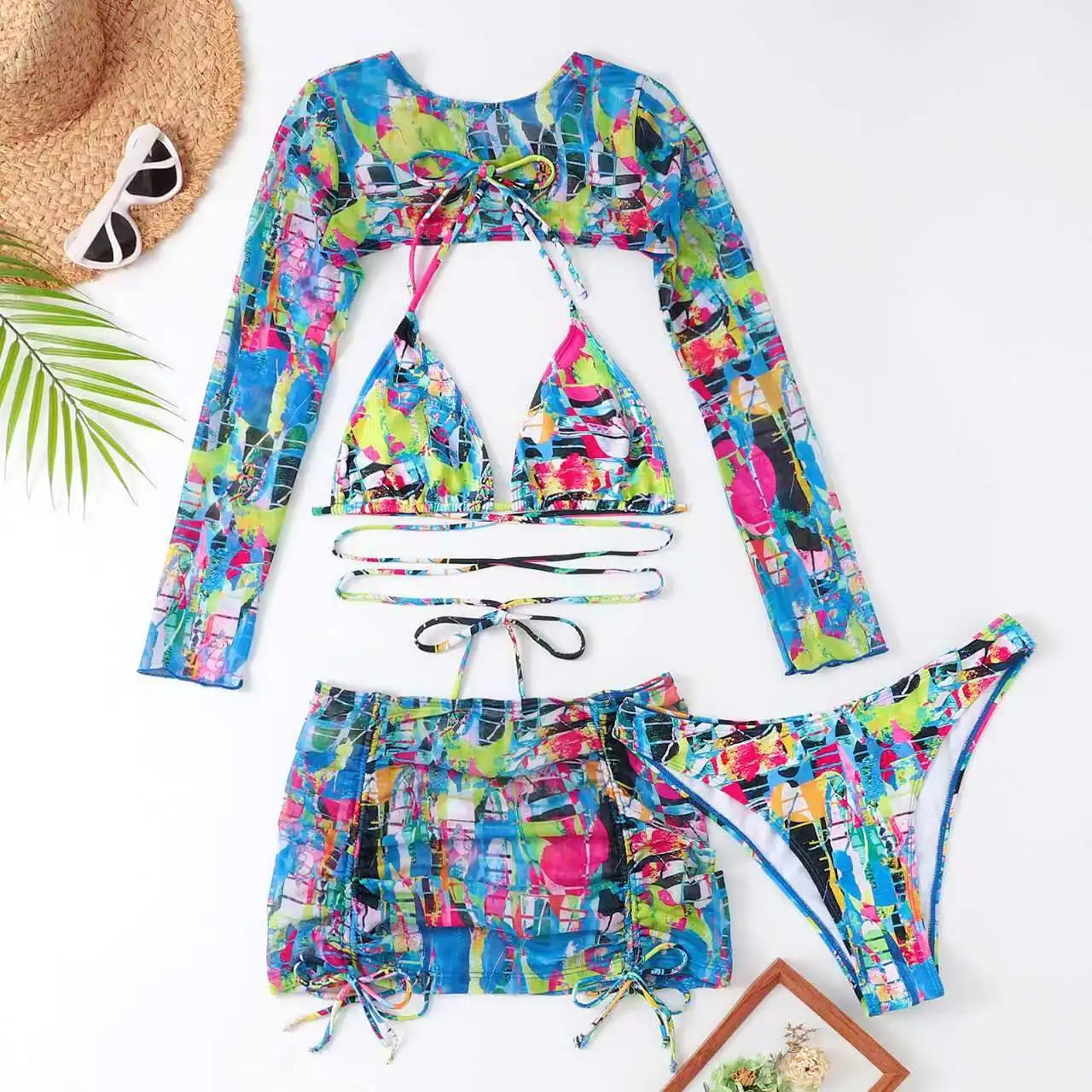 Colorful Print Swimsuits Long Sleeve Cover Crop Top Mini Skirt 4 Pieces Bikini Sets Womens Beachwear Sexy Casual Swimwear 2023