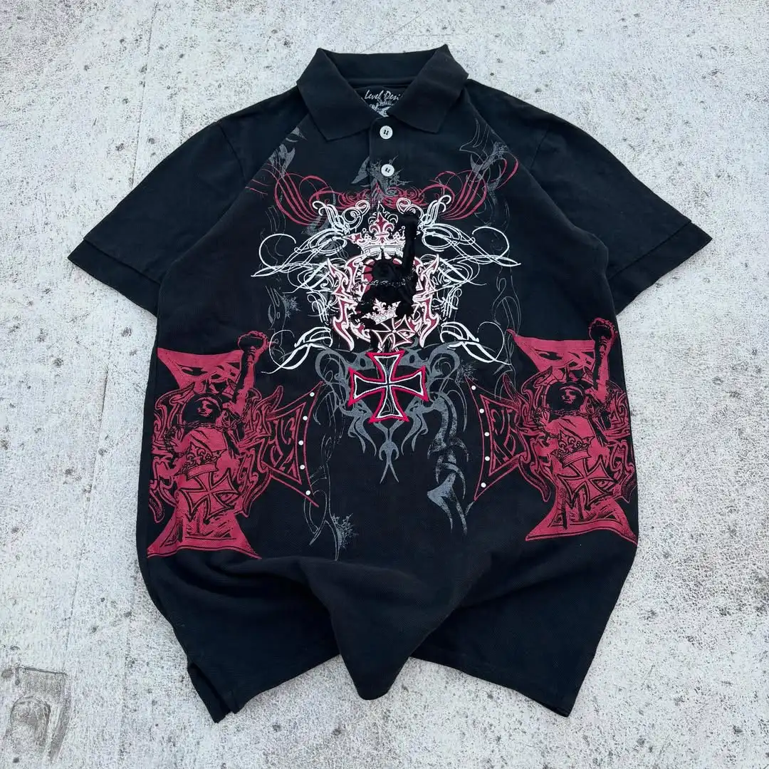 Comic Split-screen Retro Grainy Pattern Printed T-shirt Trend Street Hip-hop Y2K Black Polo Shirt Men Summer New Versatile Tops