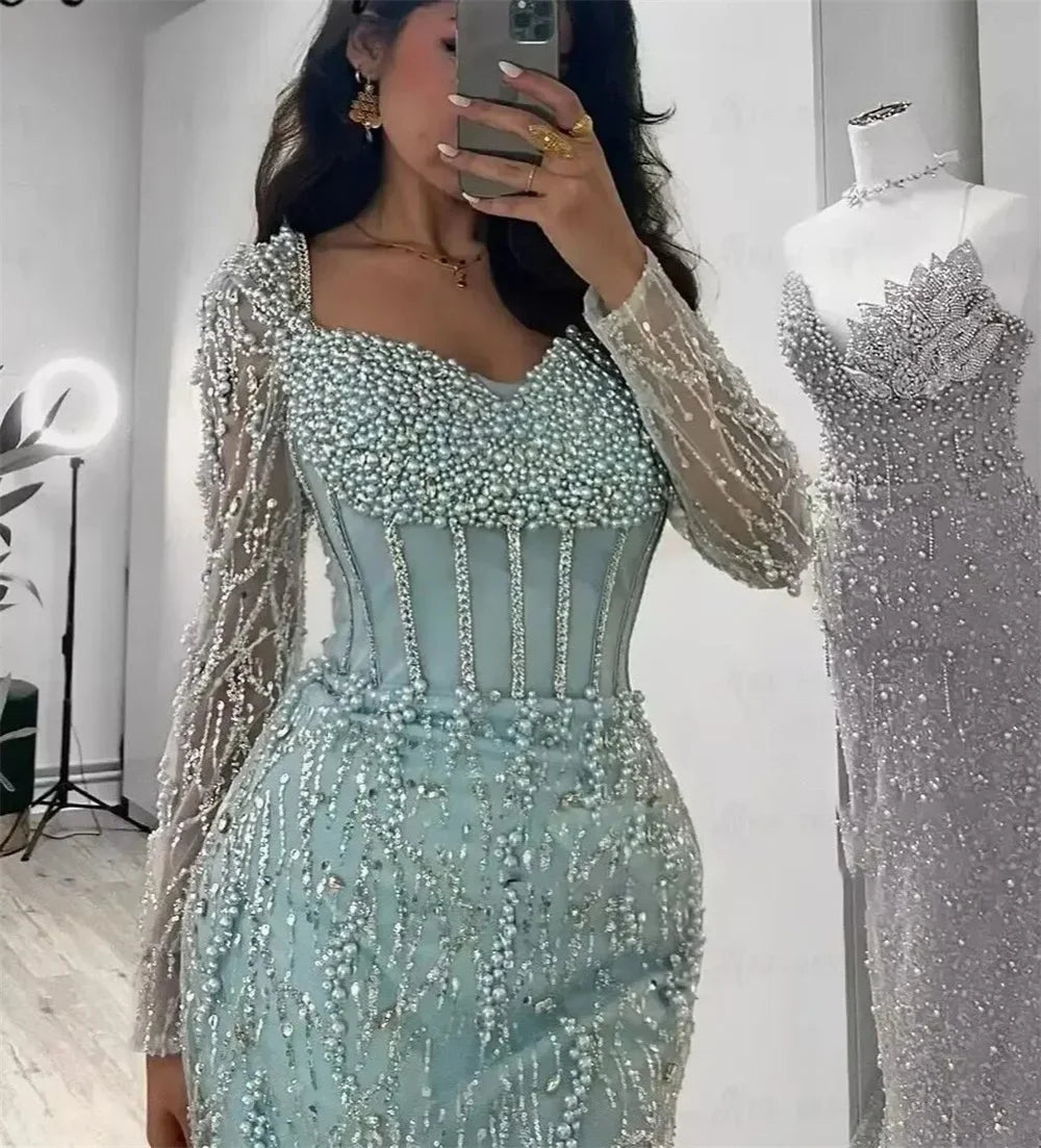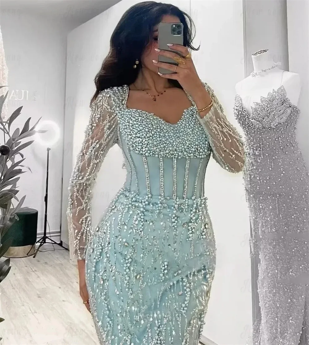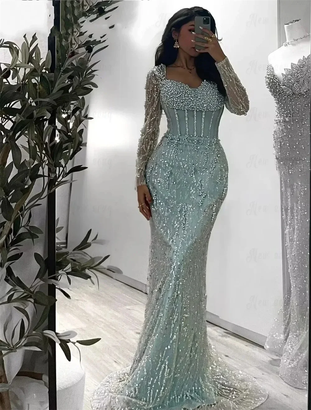 Contessa Dubai Custom Tulle long sleeves Prom Dress With Pearl Collar Vestido de gala Elegant Mermaid Formal evening event dress