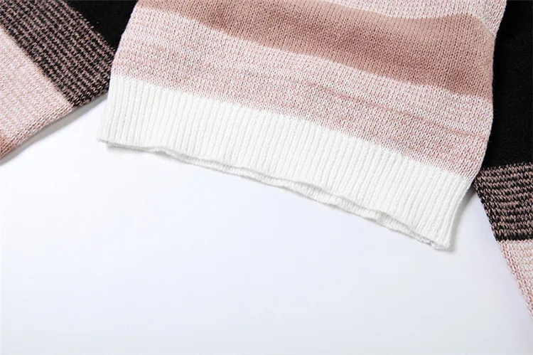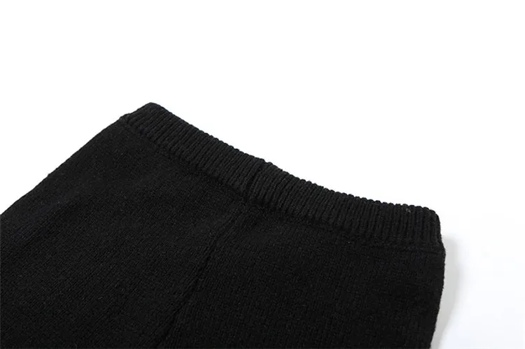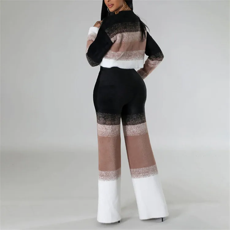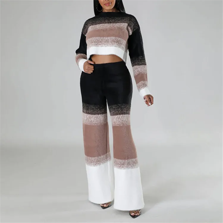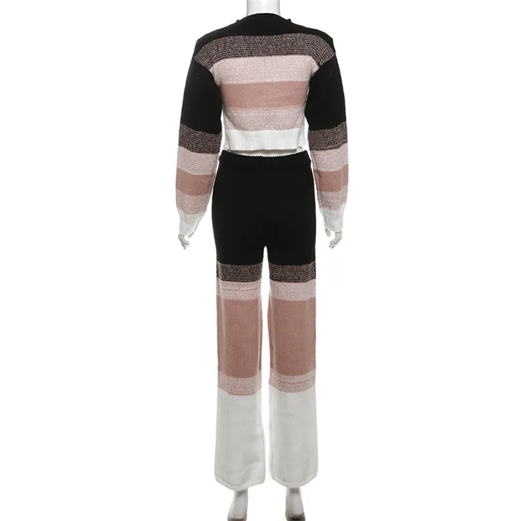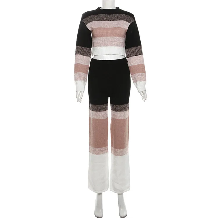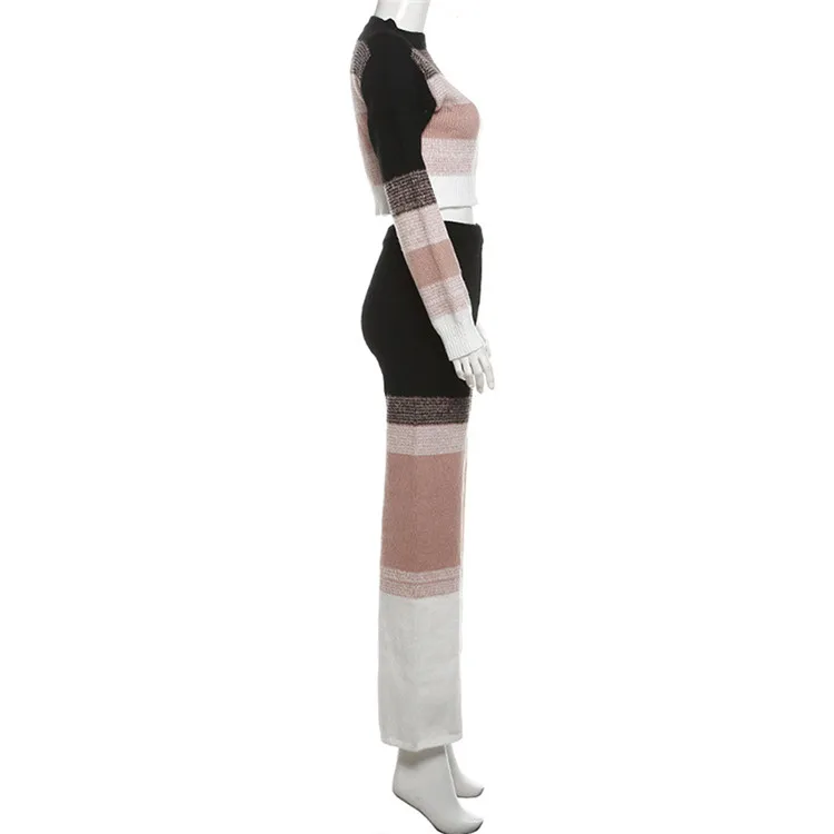 Contrast Color Knitted 2 Piece Set Women Casual Long Sleeve O-neck Crop Tops+High Waist Straight Pants Female Outfit