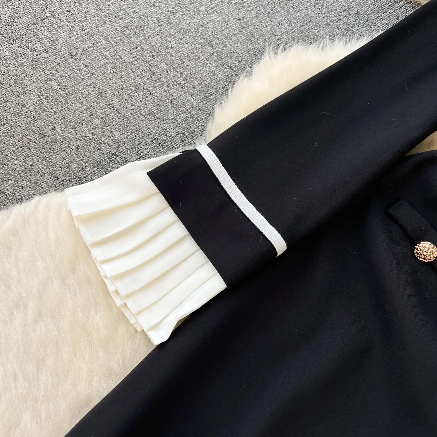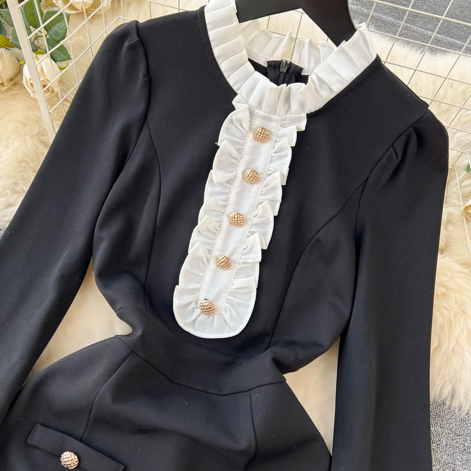 Contrast Panel Petal Neck Dress Slim Fit Black Mid Length Dress