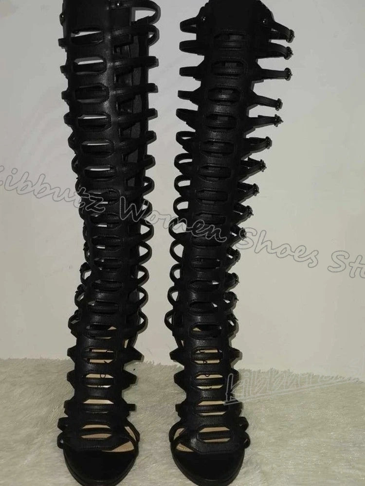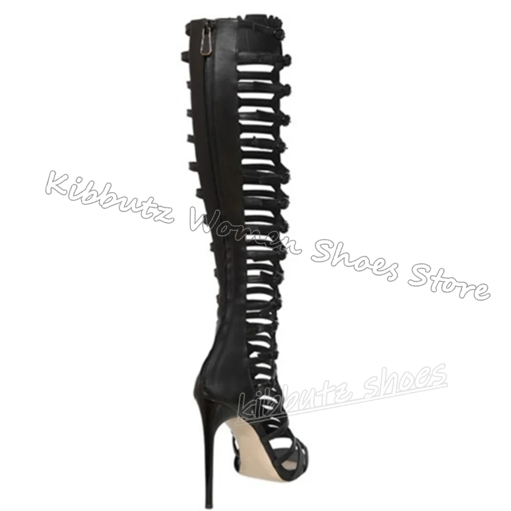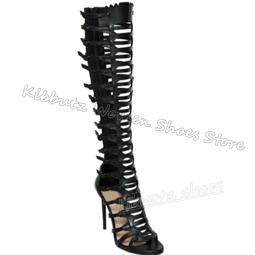 Cross Strap Sandals Knee High Solid Color Round Toe Thin Heels Back Zipper Fashion Luxury Elegant Concise Sexy Women Shoes New