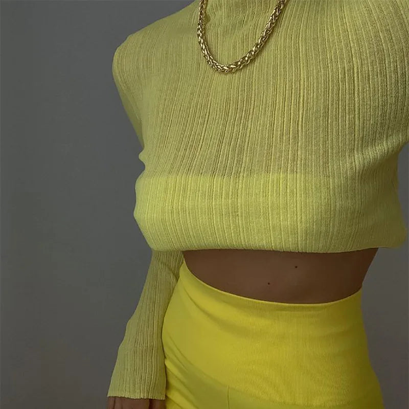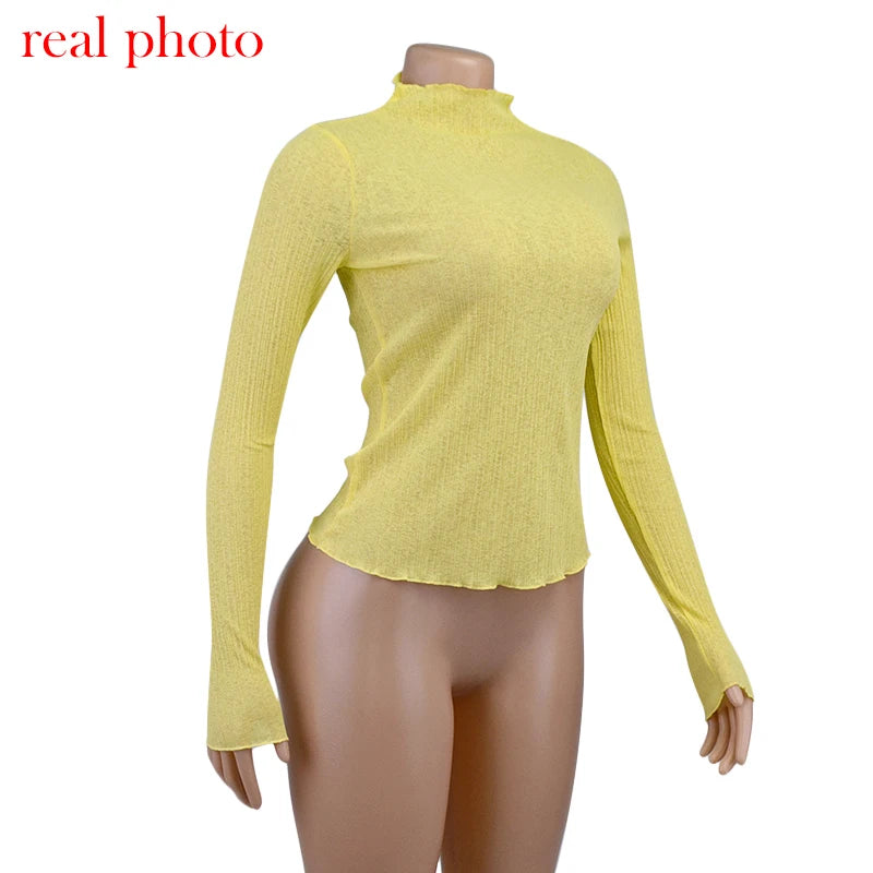 Cryptographic 2025 Fall Elegant See Through Long Sleeve Mock Neck Women Tops Fashion Streetwear Sexy T-Shirts Tees Slim Clothes