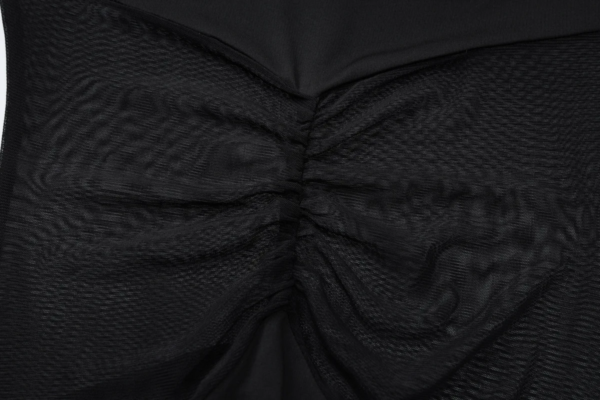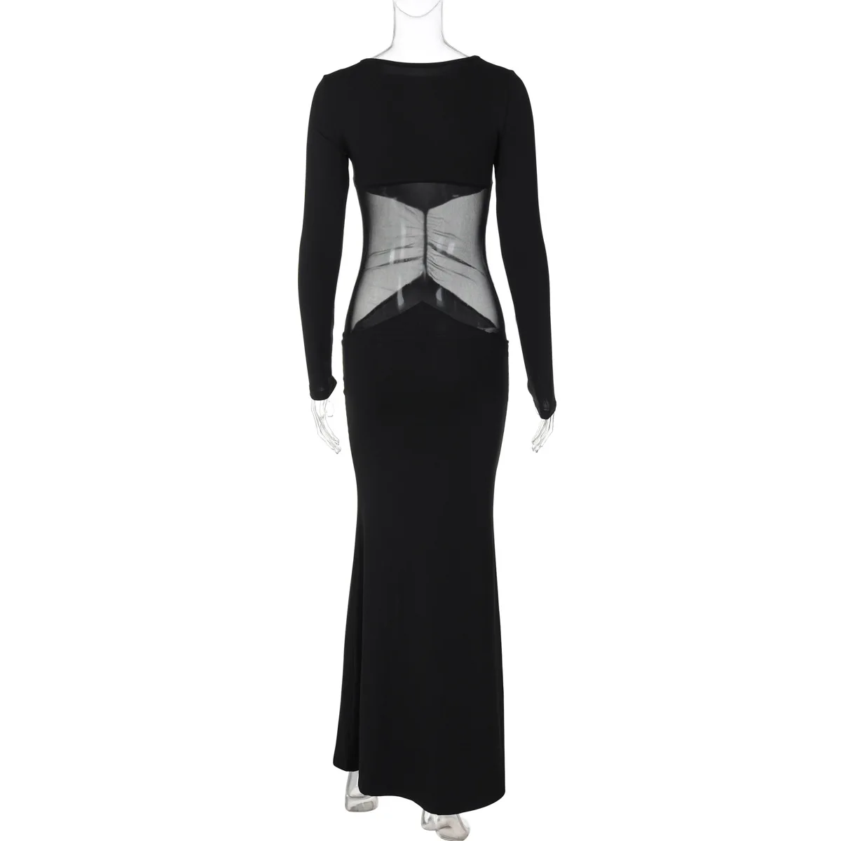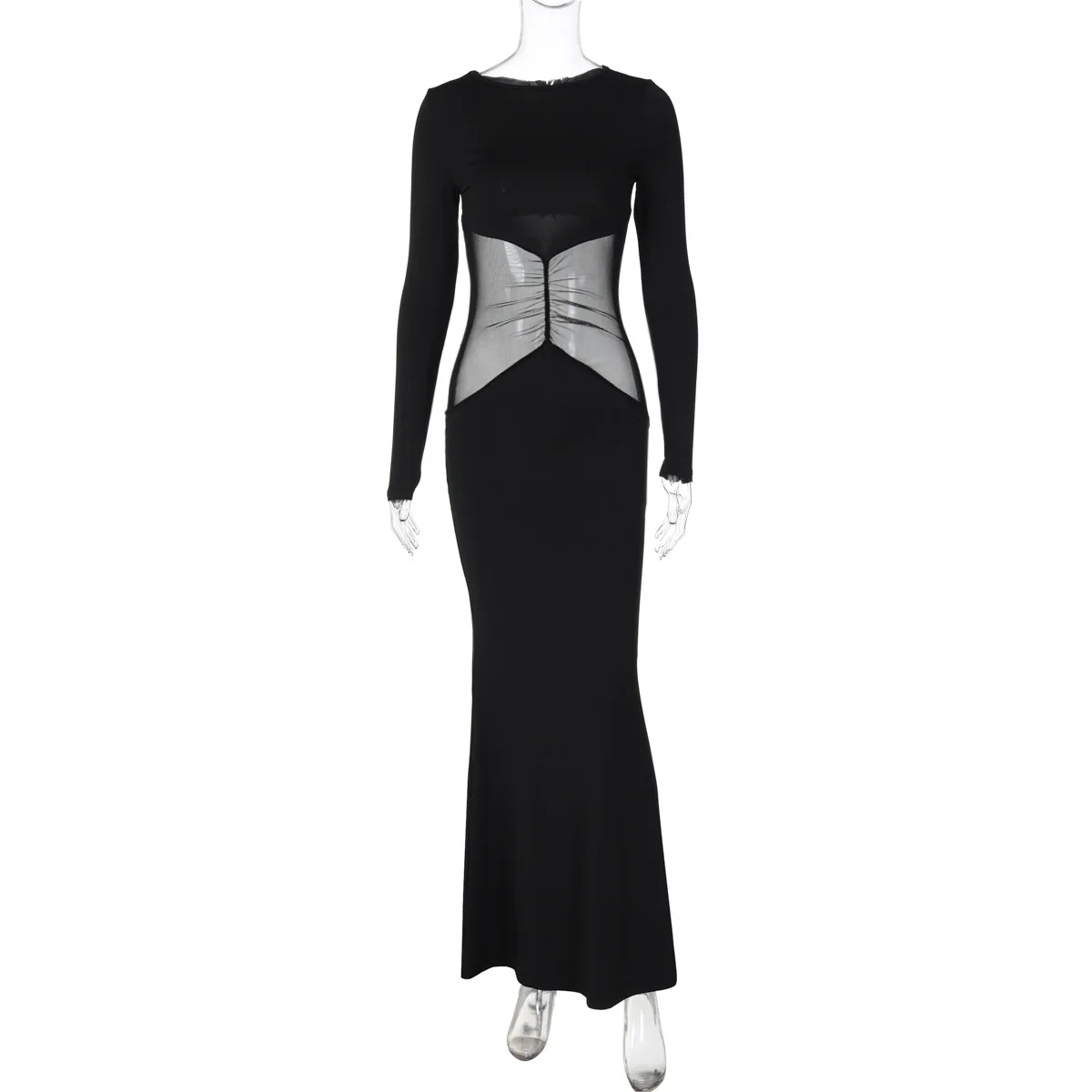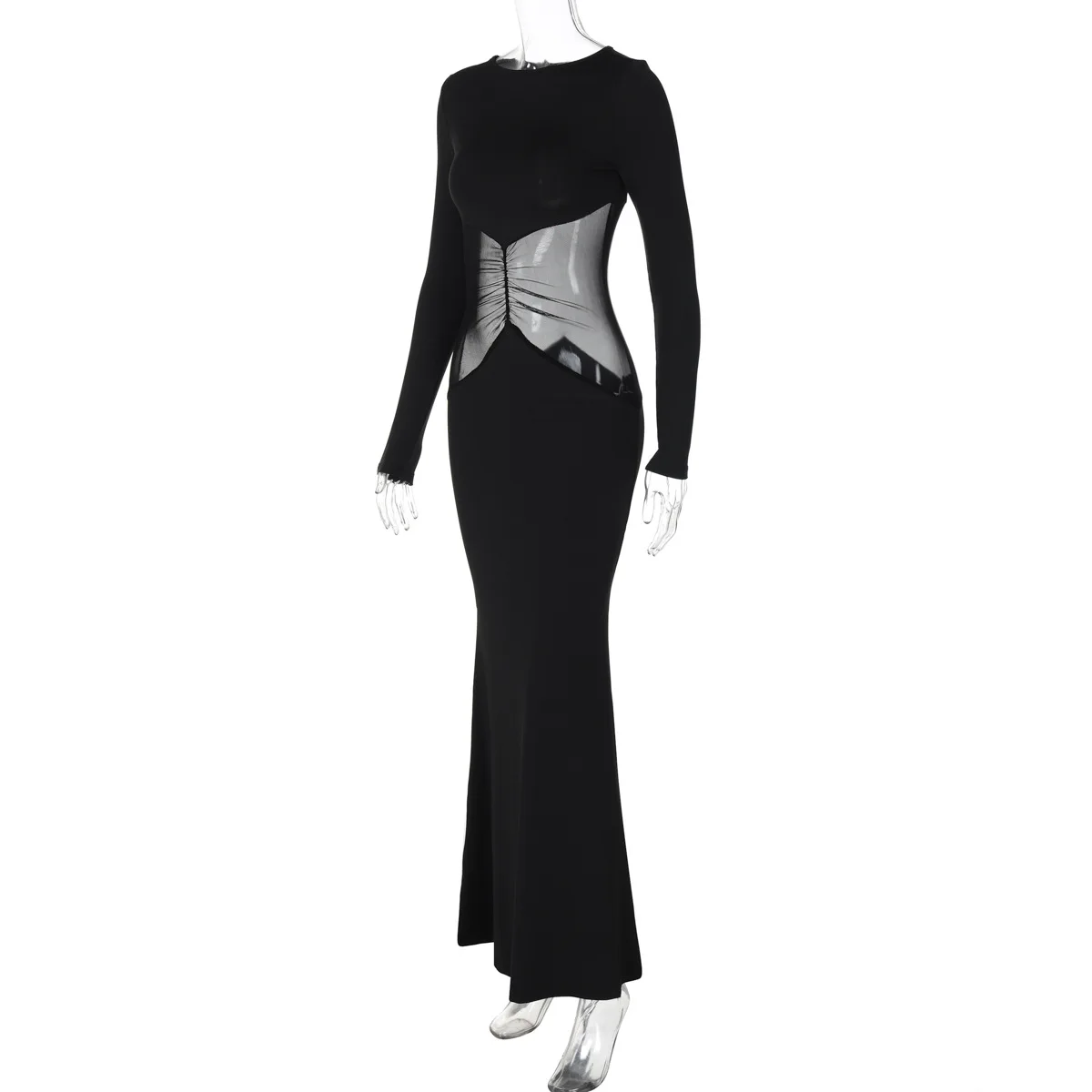 Cryptographic Fashion Ruched Mesh Sheer Maxi Dress Gown Party Club Autumn Outfits Black Sexy Bodycon Dresses Elegant Vestido