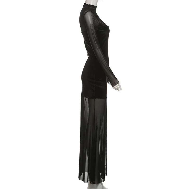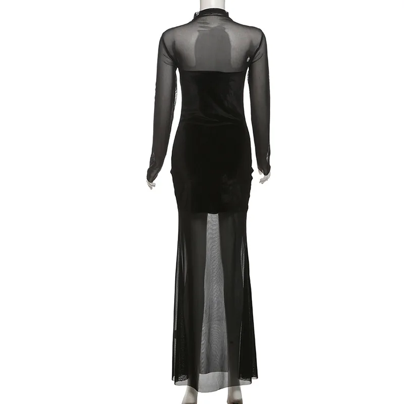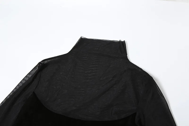 Cryptographic Long Sleeve See Through Mesh Dress Velvet Fashion Club Party Gown Black Turtleneck Vestido Bodycon Dress Clothes