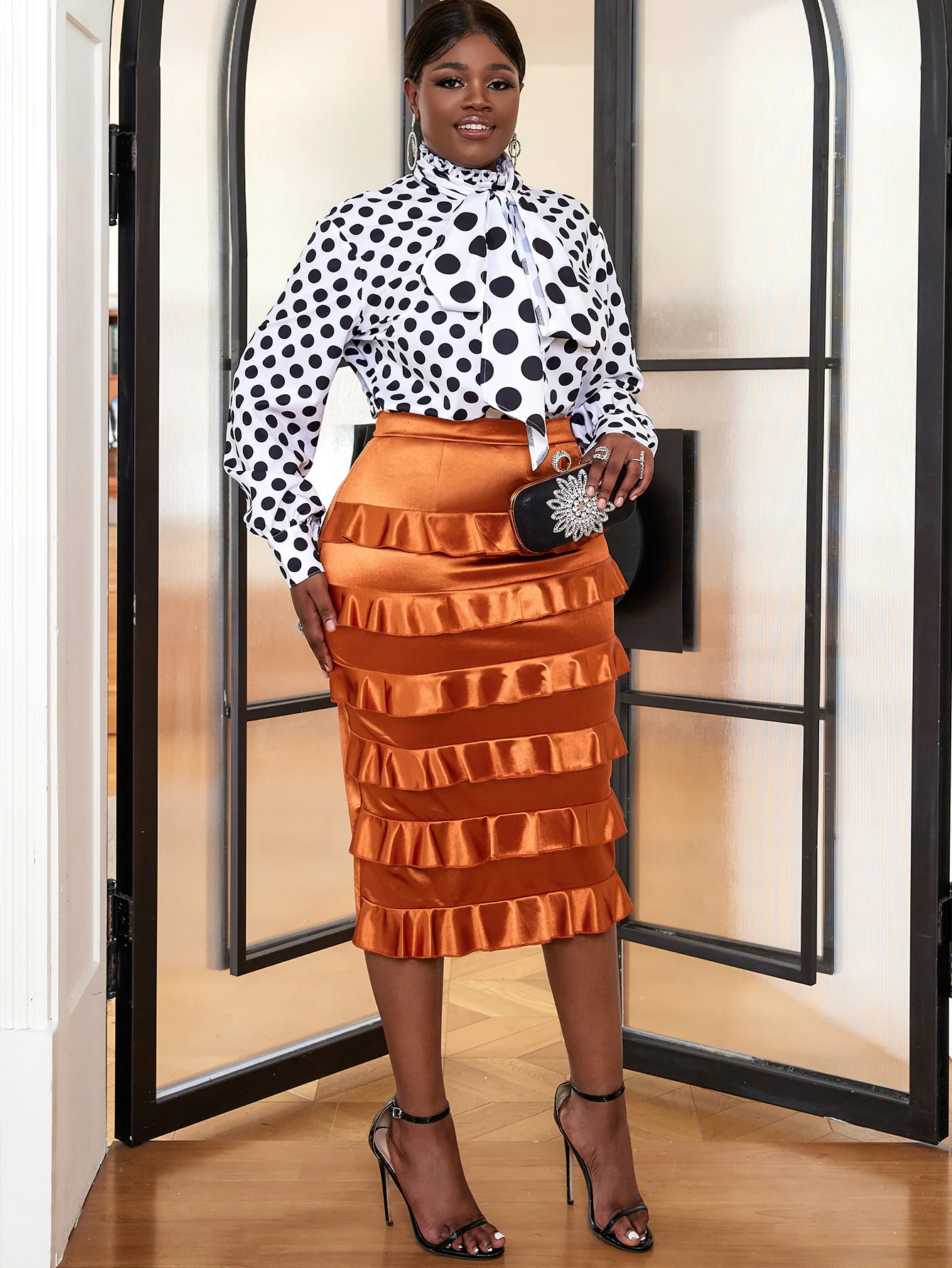Curve Satin Skirt Bow Shirt Polka Dot Shiny Office Lady Two Piece Sets
