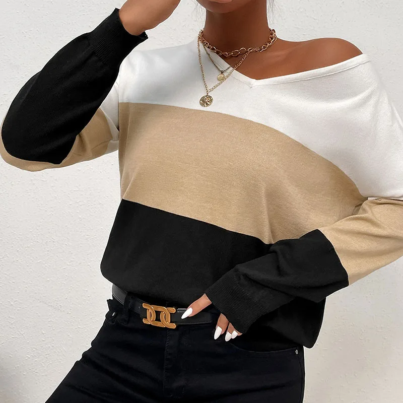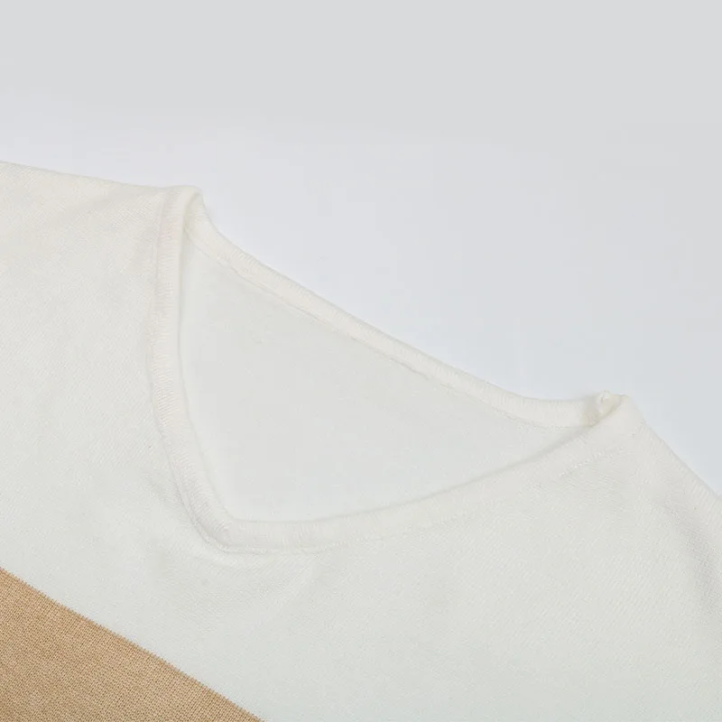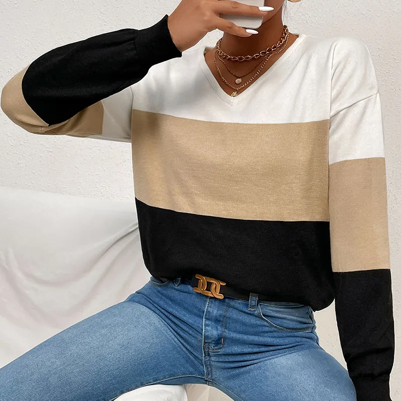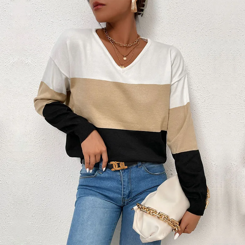 Custom Design Splicing Color V Neck Knitted Long Sleeve Pullover Sweater Top