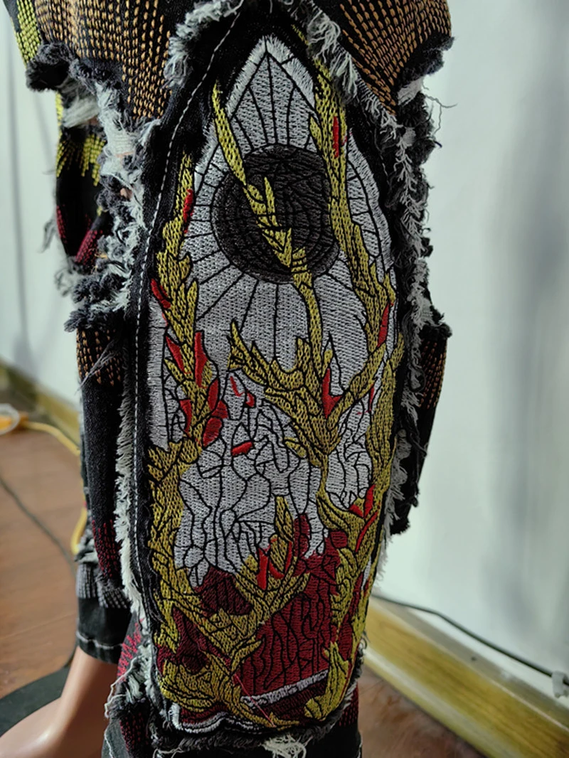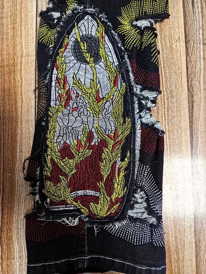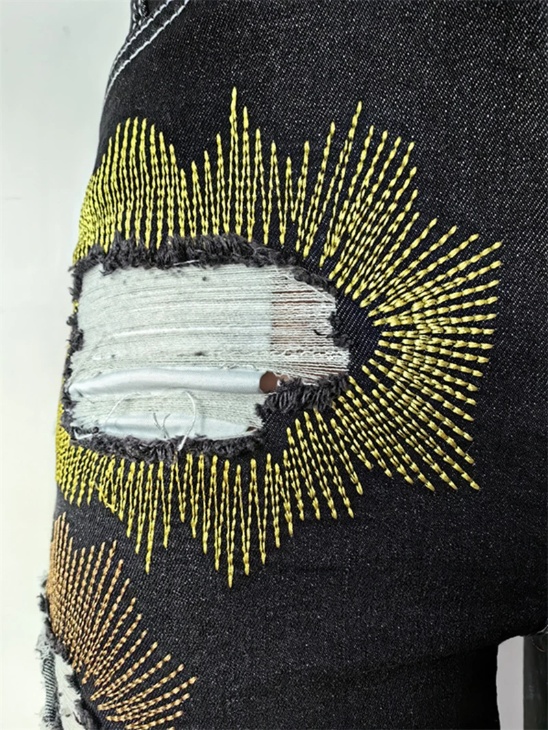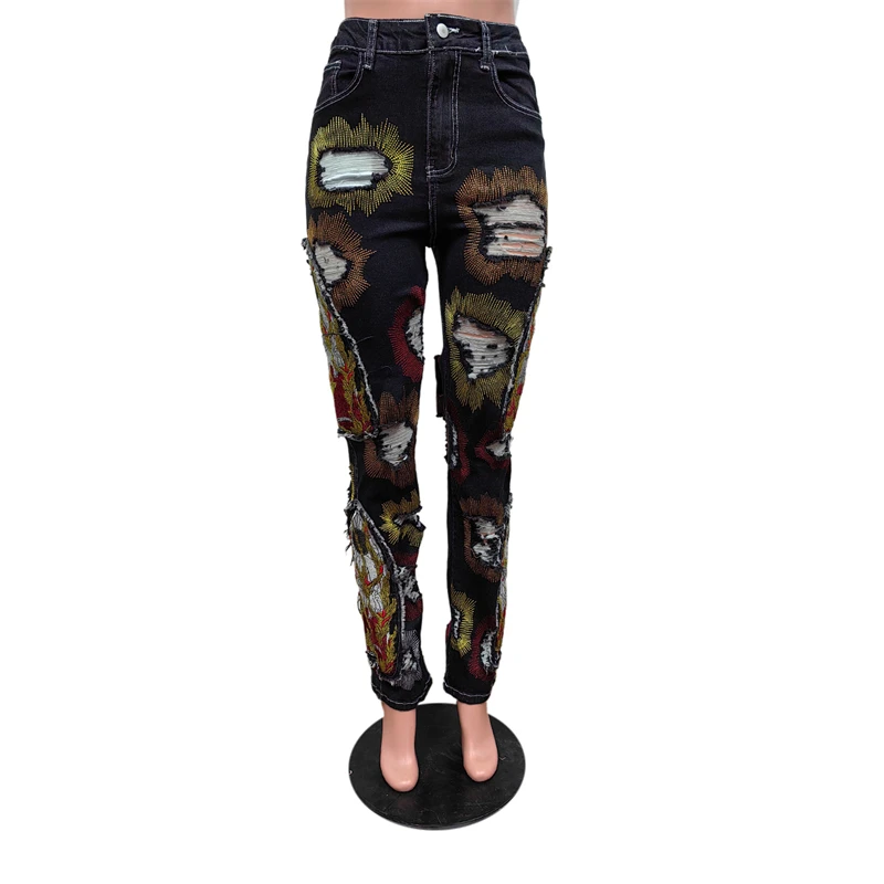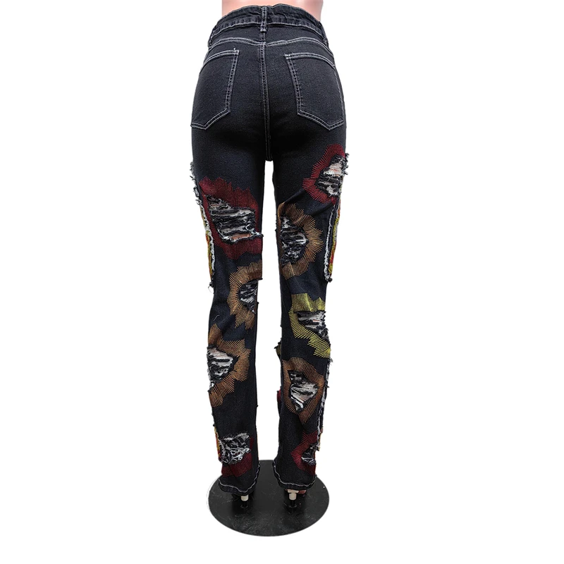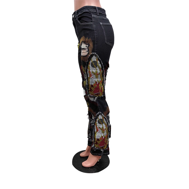 custom female women ladies washed black embroidery patchwork ripped tears jeans denim boot cut pants manufacturer for women