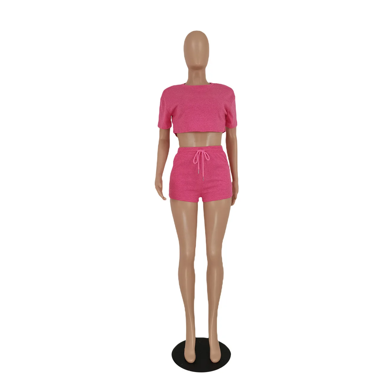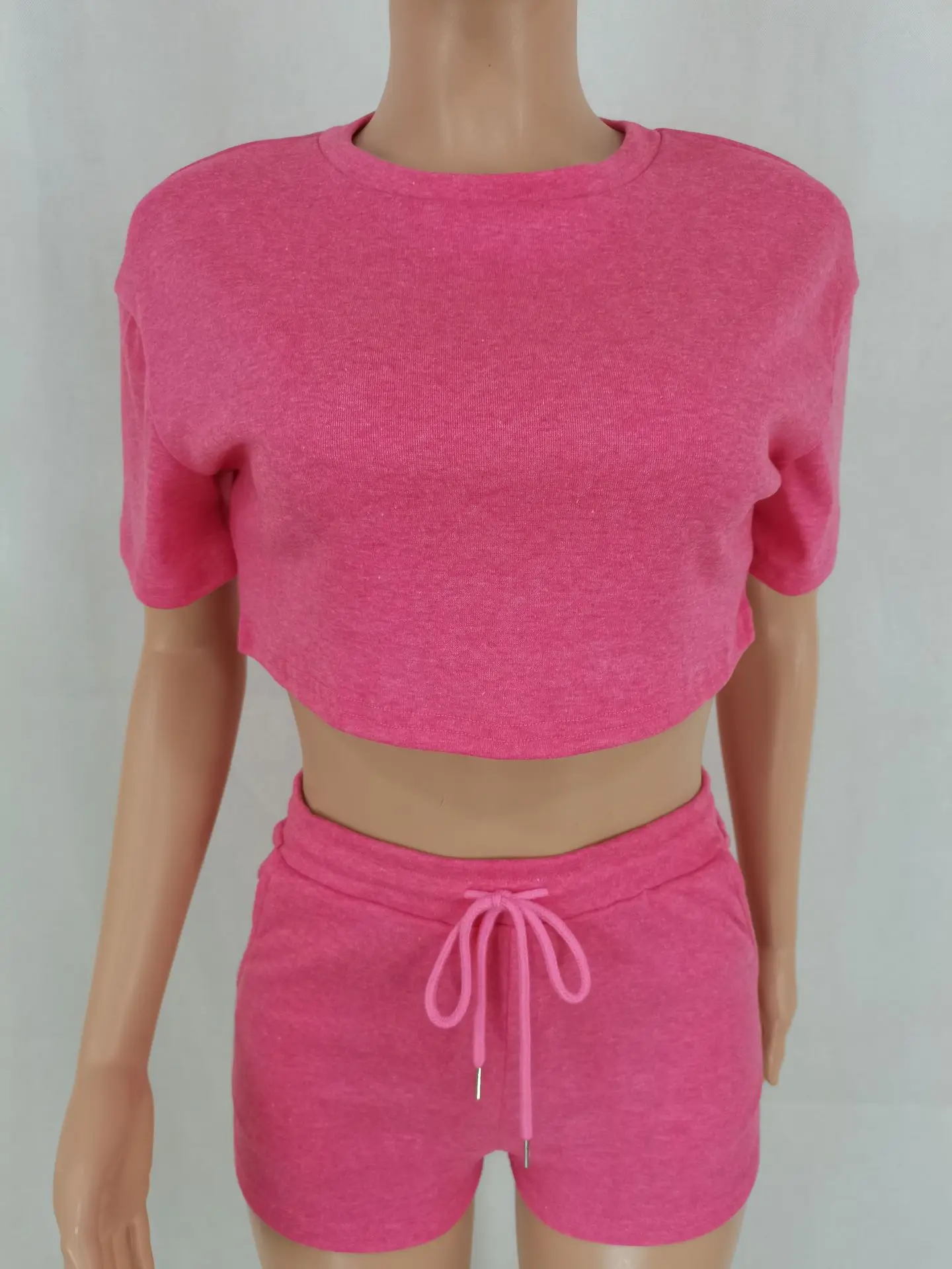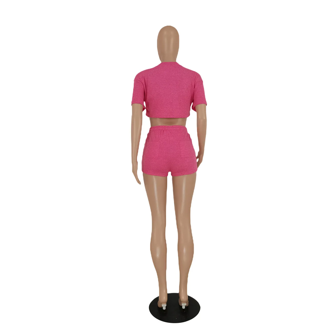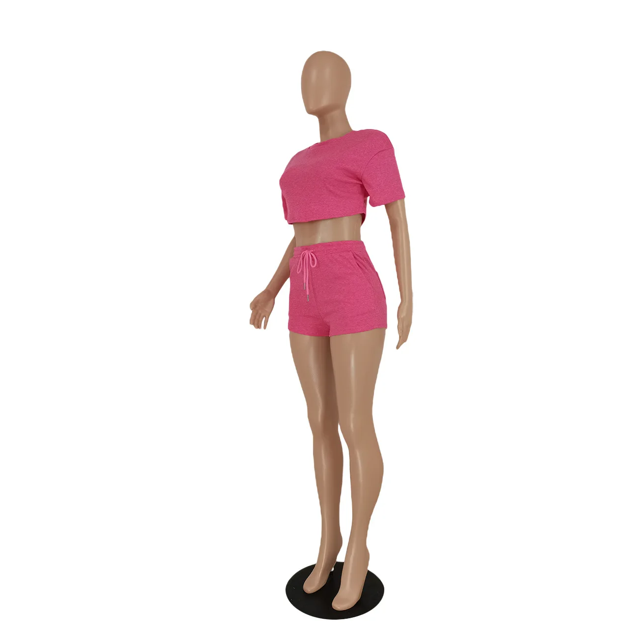 Custom Logo 2 Piece Crop Top Solid Color Loose Short Sleeve Crop Top Elastic Waist Drawstring Shorts Womens Two Piece Casual Set
