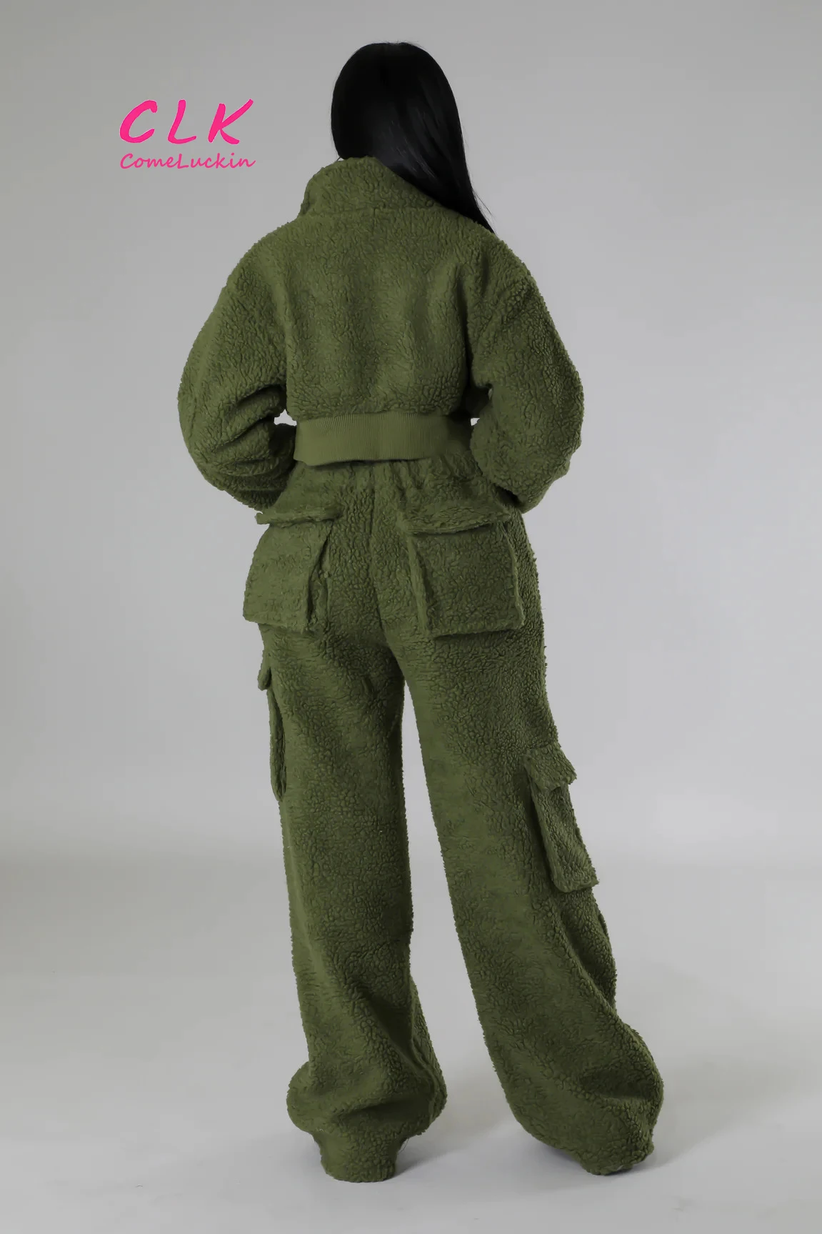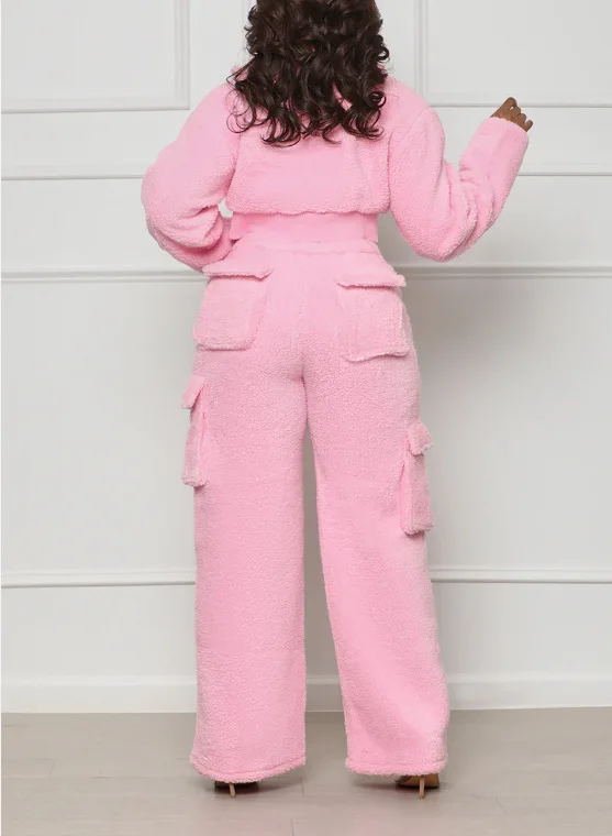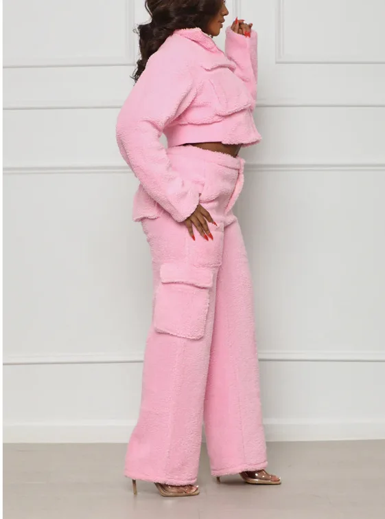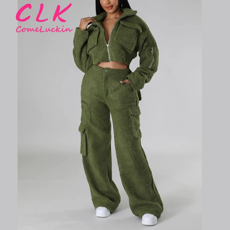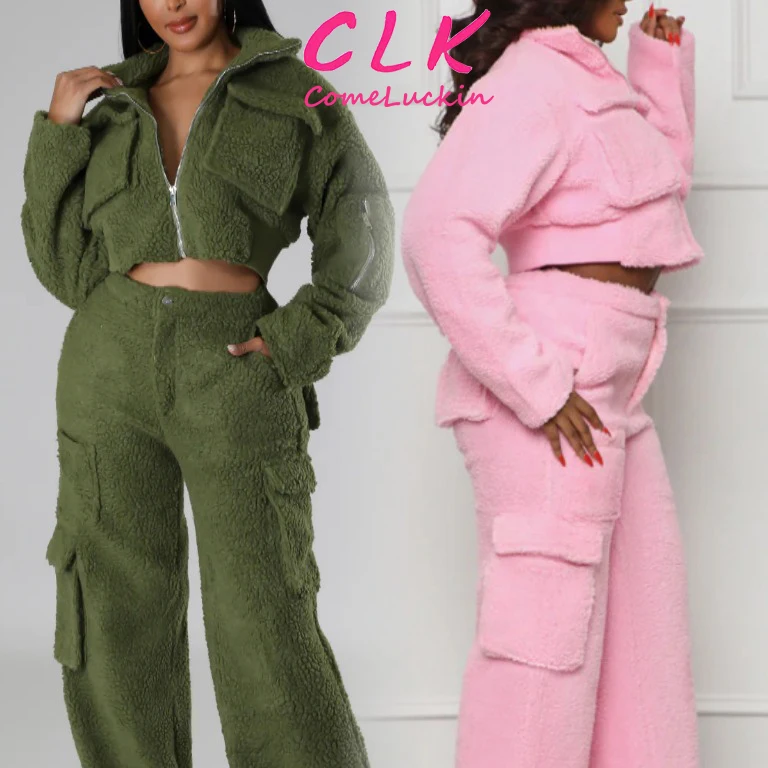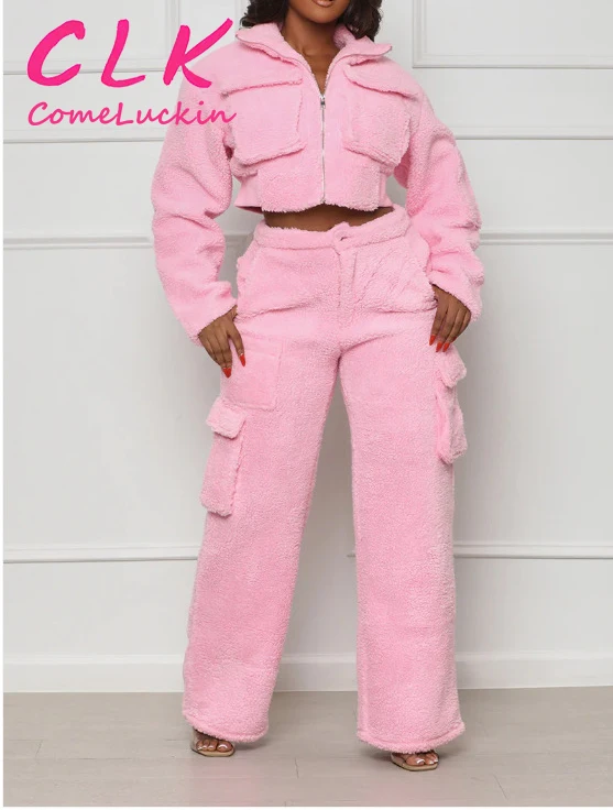 Custom Logo Winter Women Fur Faux Coats Jackets Thick Tracksuits Cargo Pocket Joggers zipper Crop Top 2 Two Piece Set Outfits