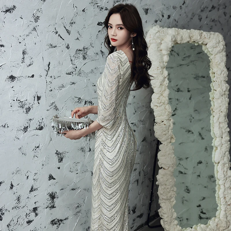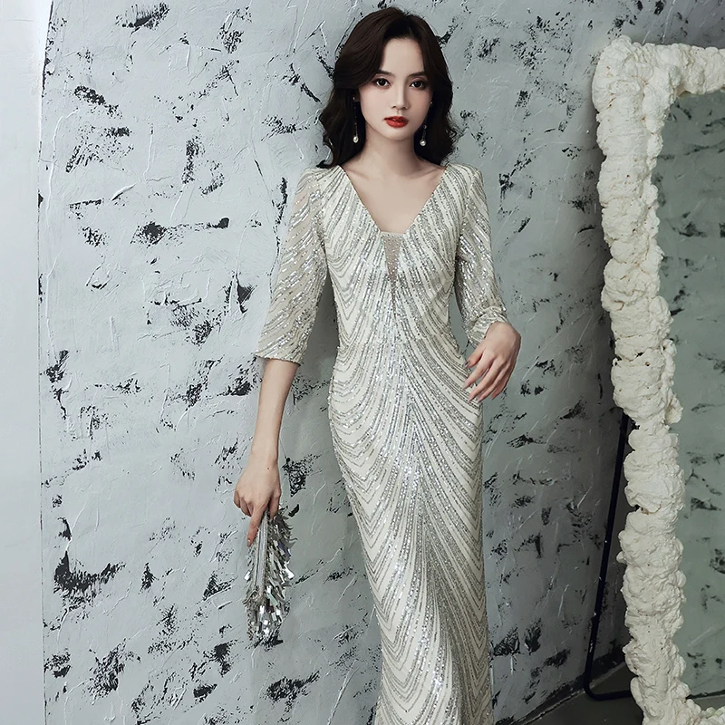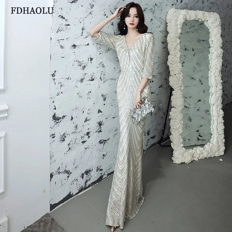 Customized FU93 Evening Dress Elegatn V-neck Evening Dresses For Women Plus Size Robe De Soiree 2021 Sequins Formal Gowns