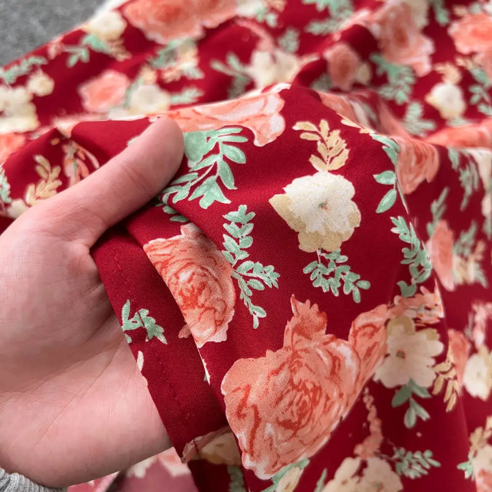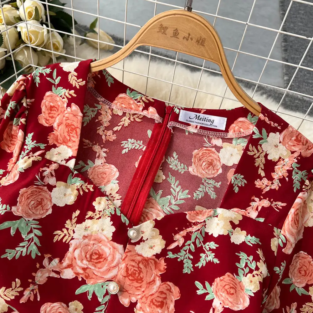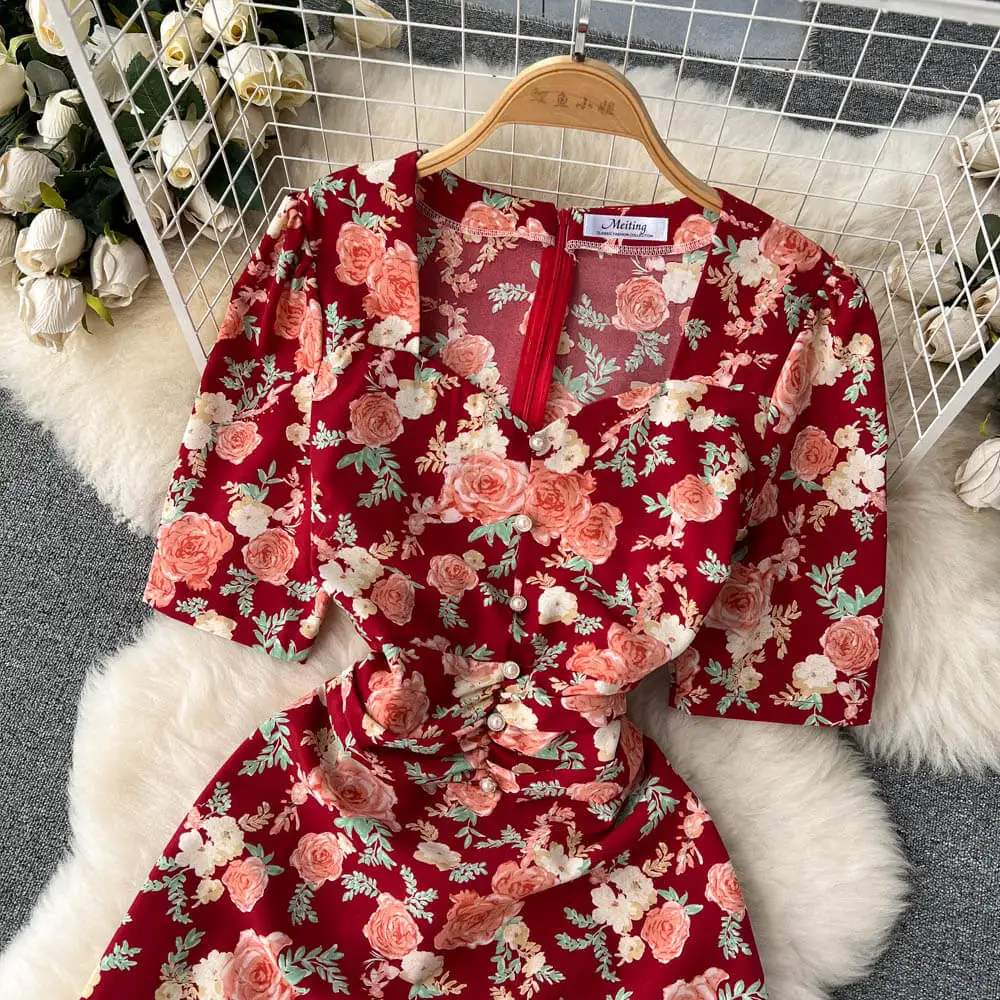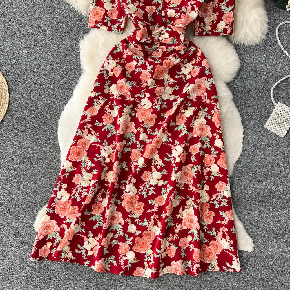 Customized Korean Retro Floral Mid Length Slim Fit Holiday Summer Dress