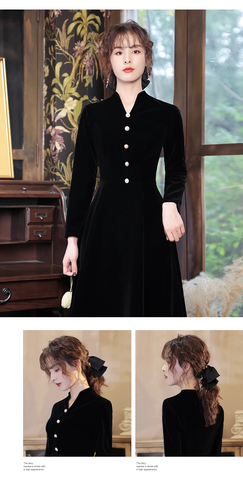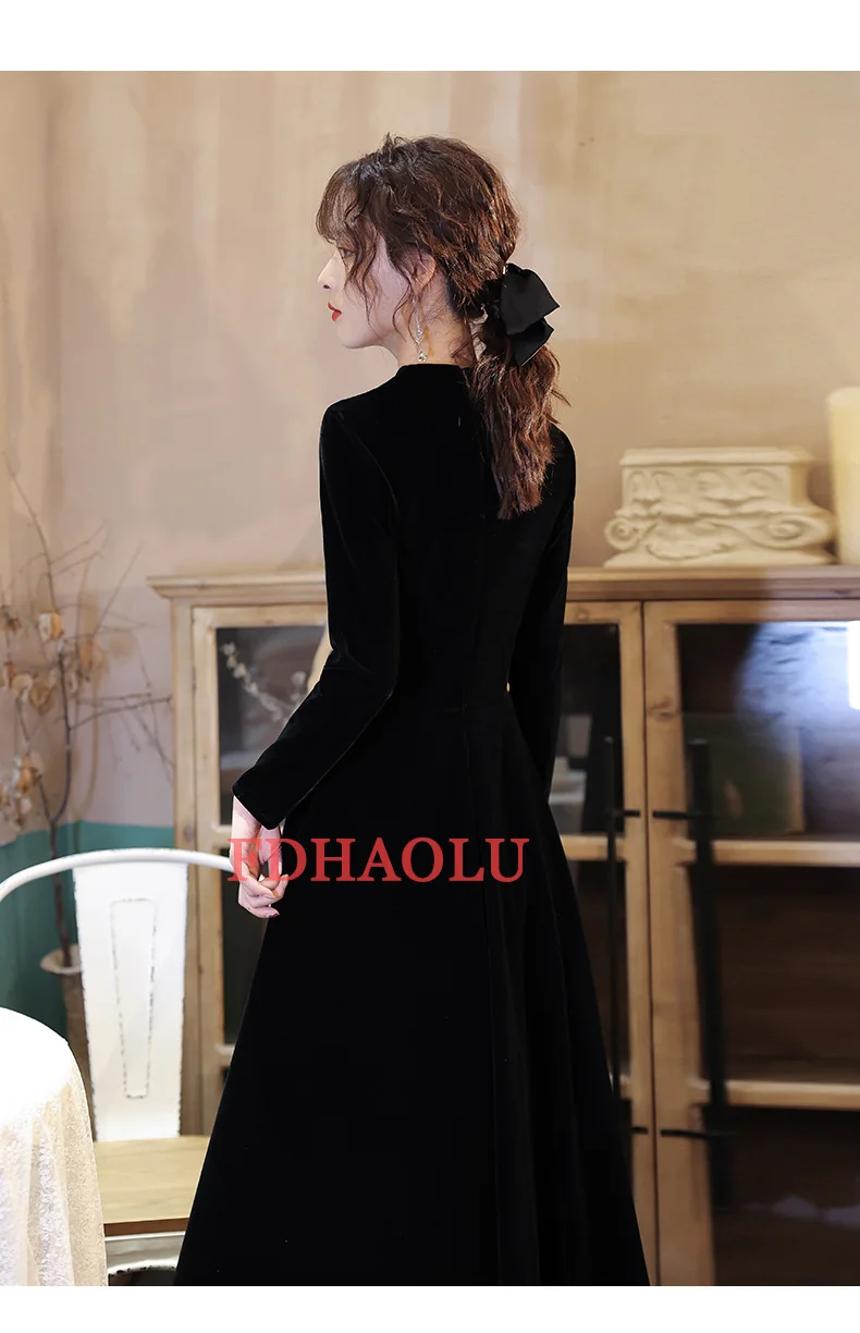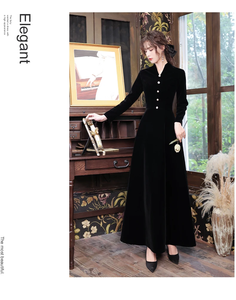 Customized Plue Size Black Velour Muslim Evening Gown V-Neck A-Line Floor Length Dress Long Sleeve Zipper Black Evening Dress