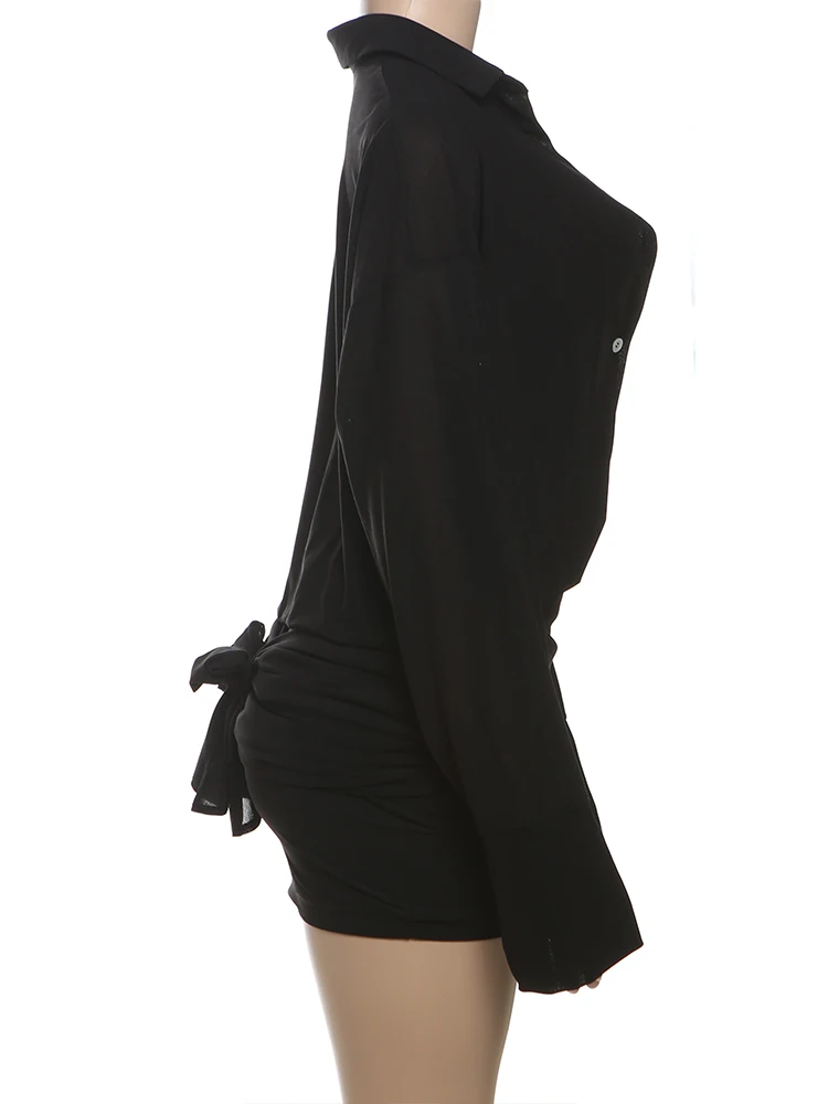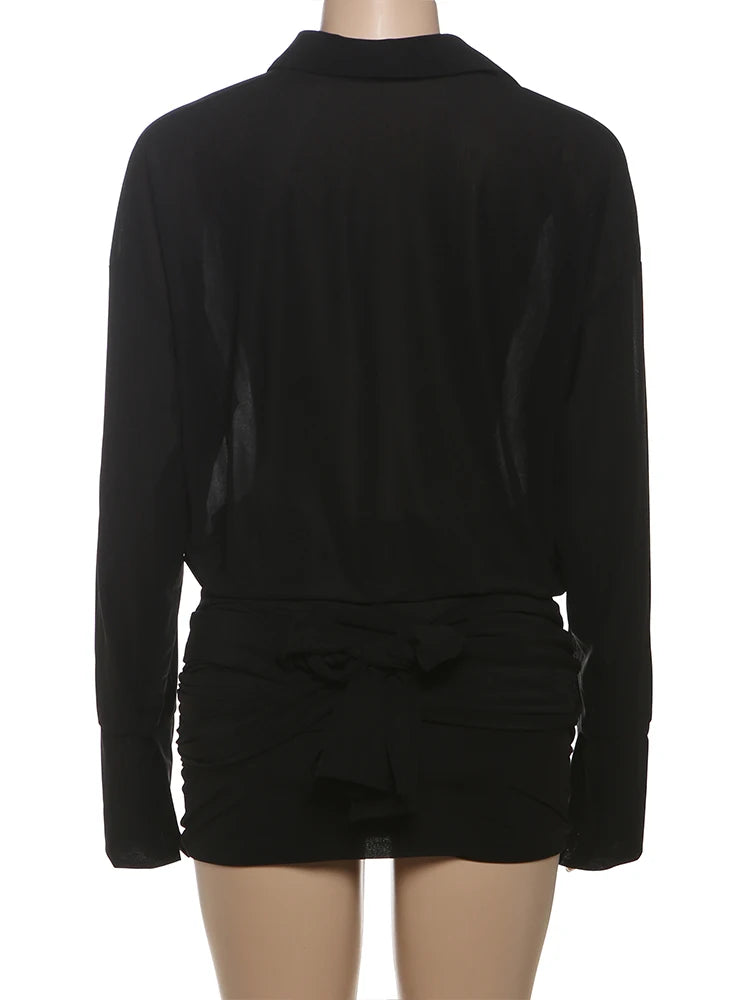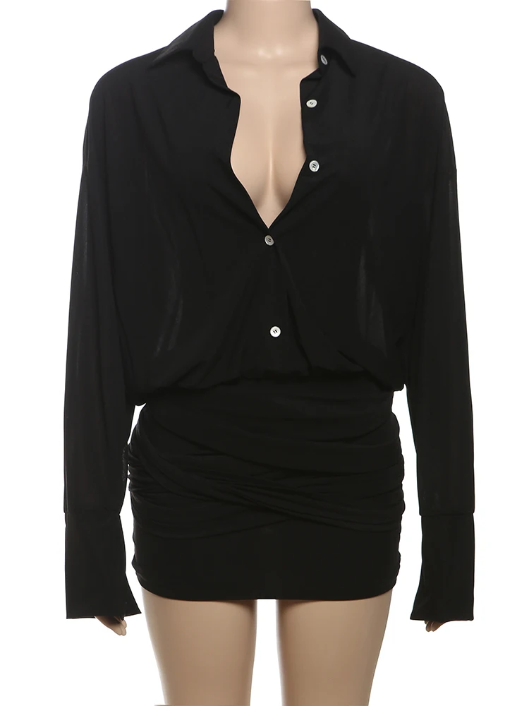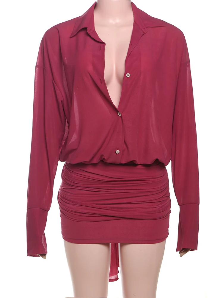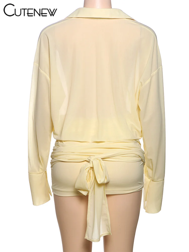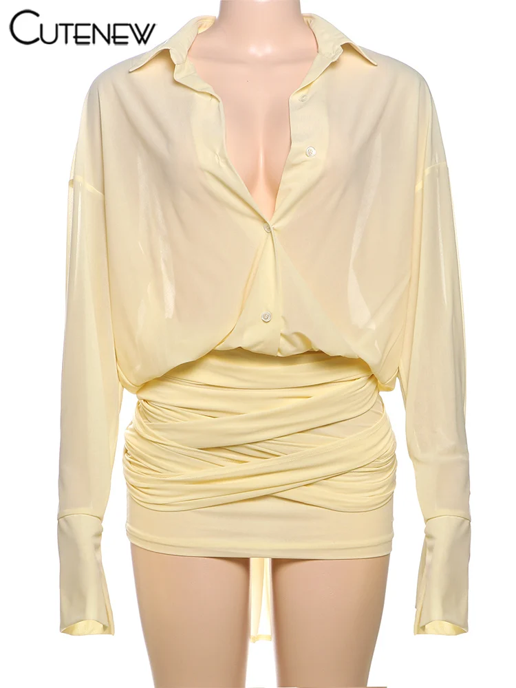 Cutenew Solid Classic Women Blouse Dress Sexy Thin See Through Full Sleeve Lapel Single Breasted Pleated Mini Vestido Streetwear