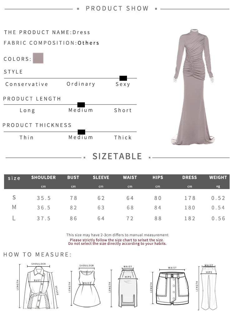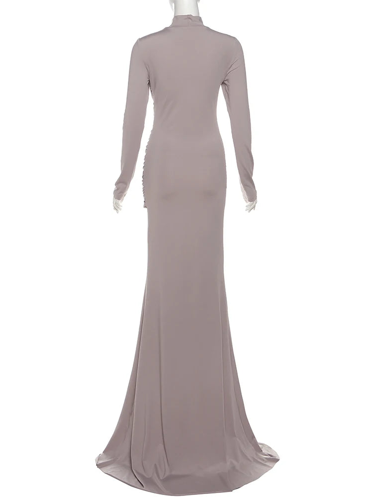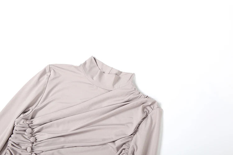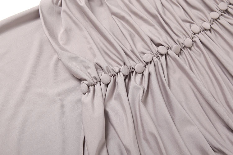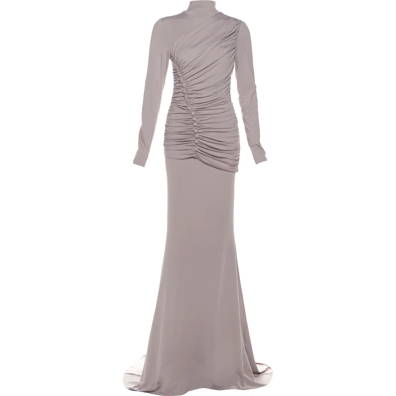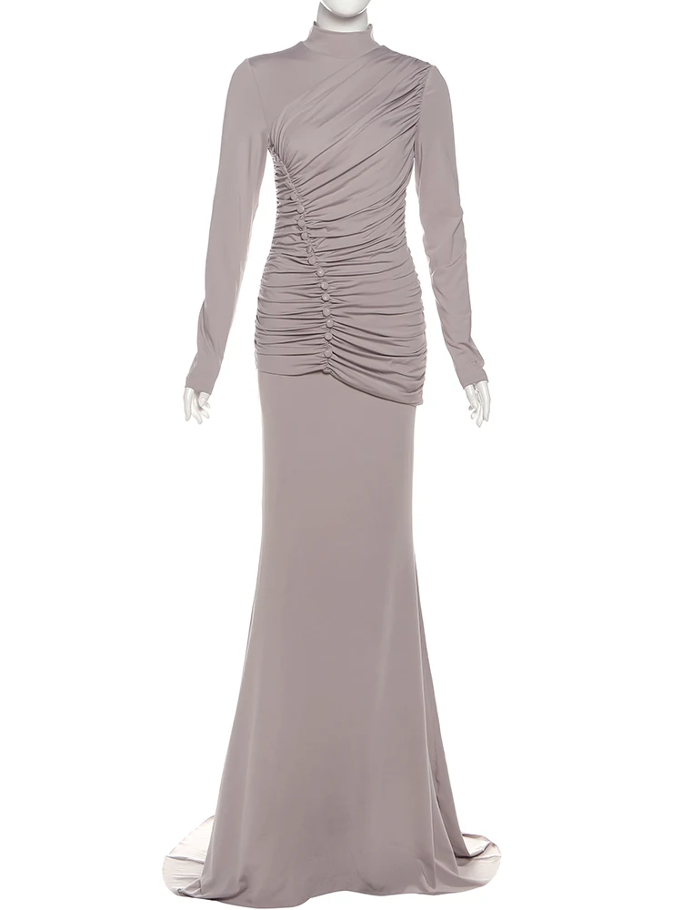 Cutenew Women Ruched Maxi Dress Elegant Irregular Button Half High Collar Simple Evening Birthday Party Stretch Slim Bodycon