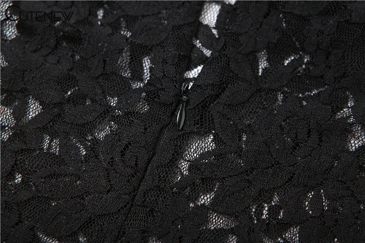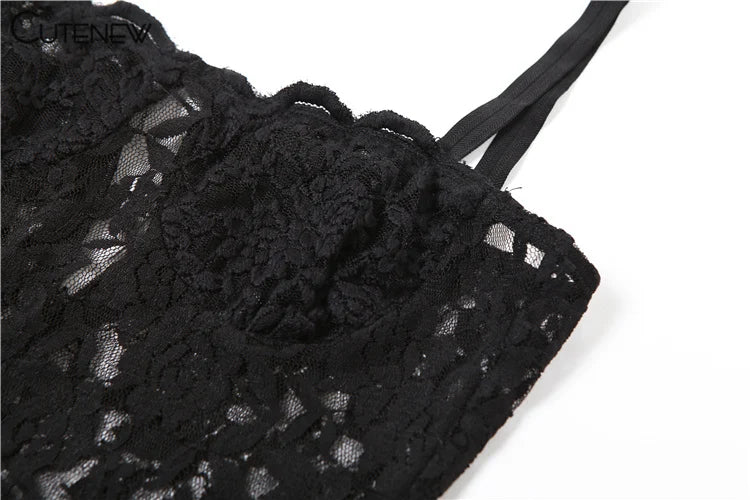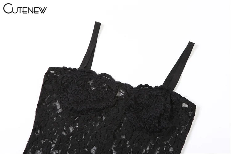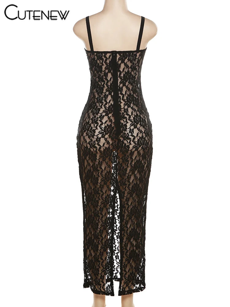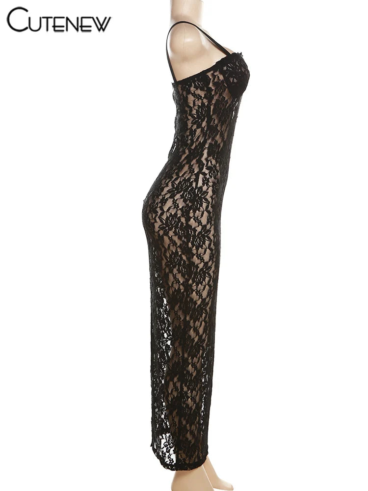 Cutenew Women's Elegant Black Lace Long Maxi Dress Elegant Backless Sleeveless Suspender Dress Summer Street Casual Vestidos