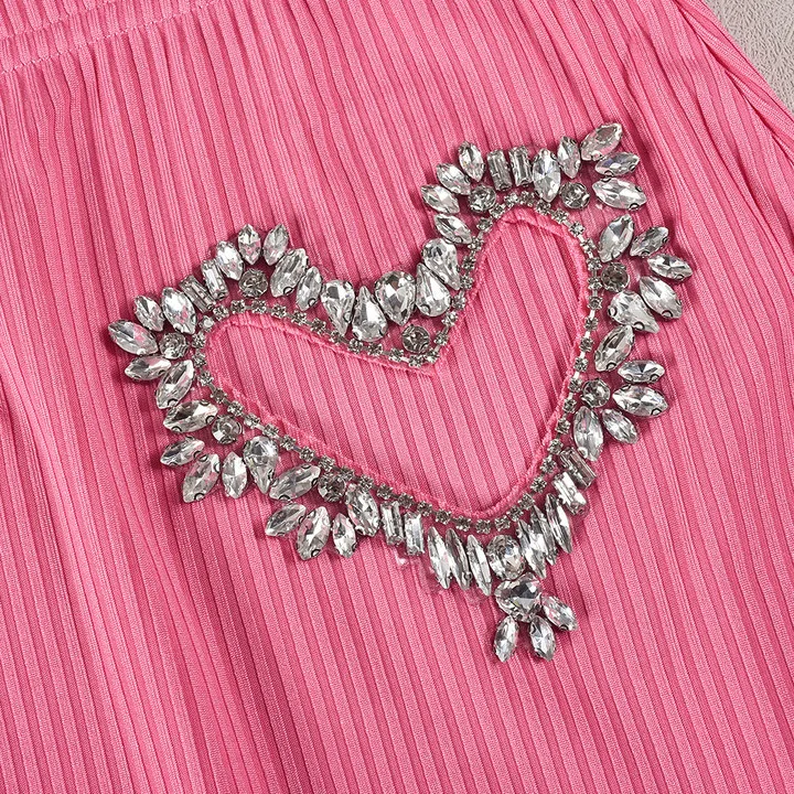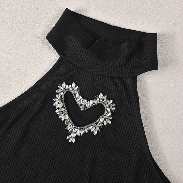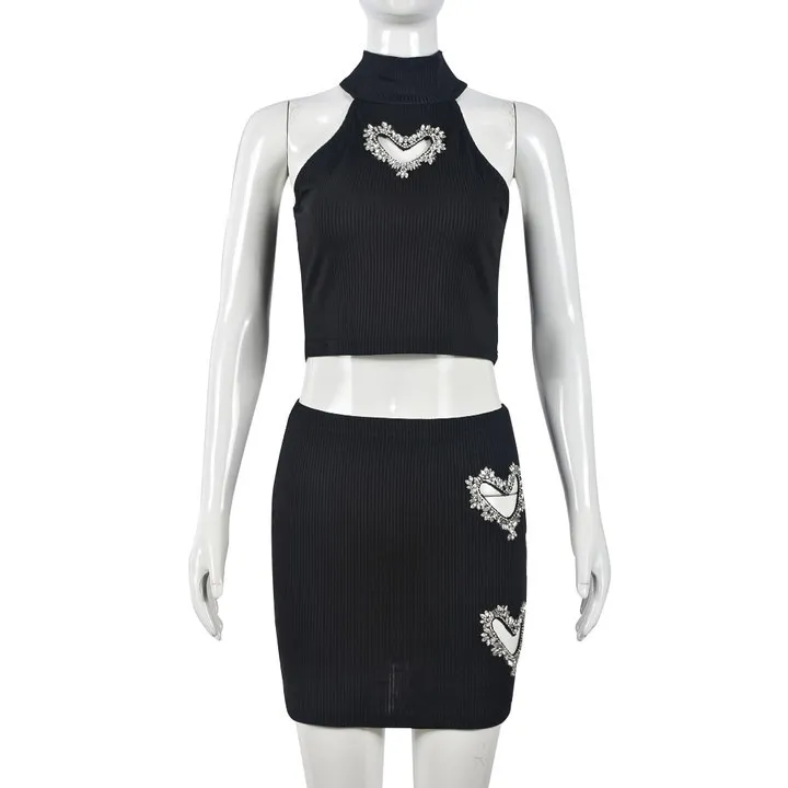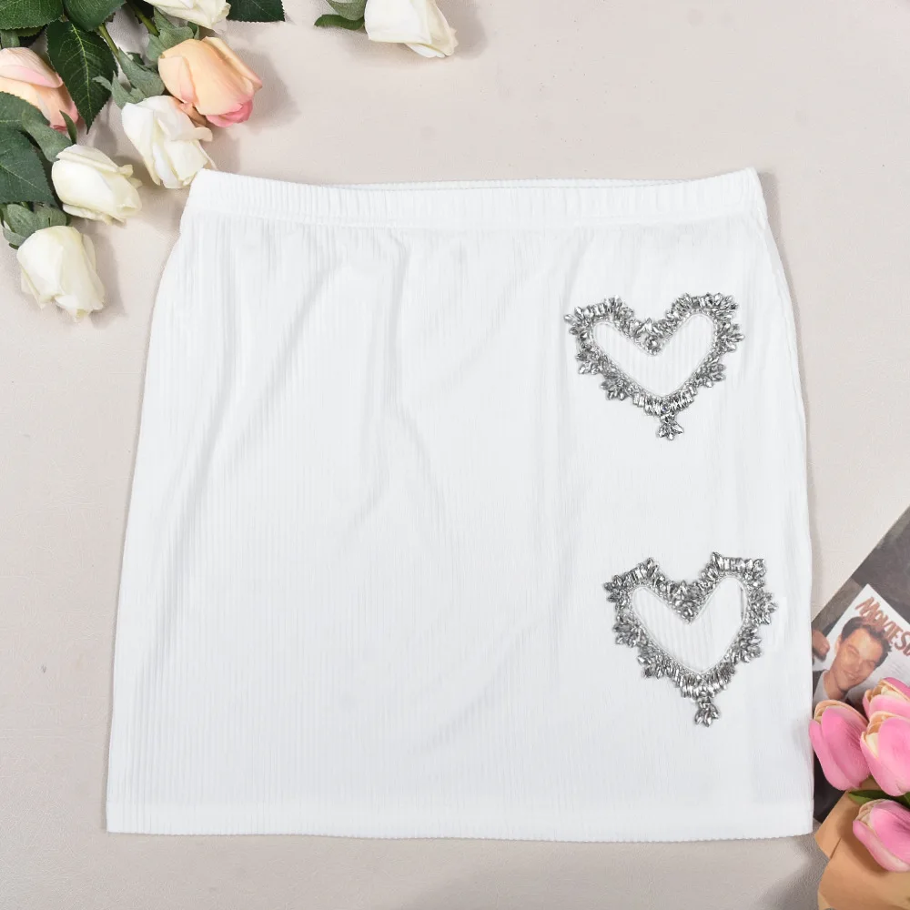 CUTENOVA 23ST123009 Charm Hollow Out Heart Shape Rhinestone Crop Top Pencil Skirt Two Piece Skirt Set