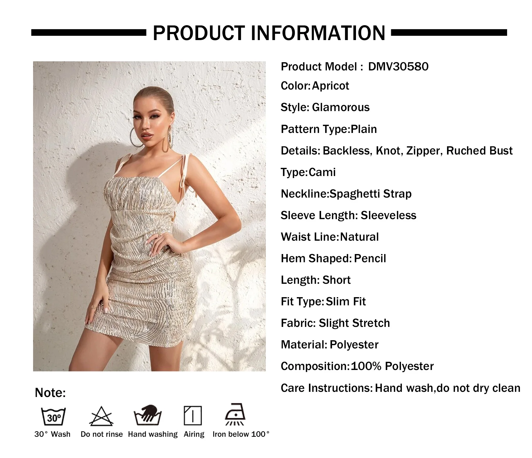 D&M Leades High Waist Sexy Sling Tie Shoulder Ruched Sequins Cami Bodycon Dress 2022 New Summer Backless Party Club Dresses