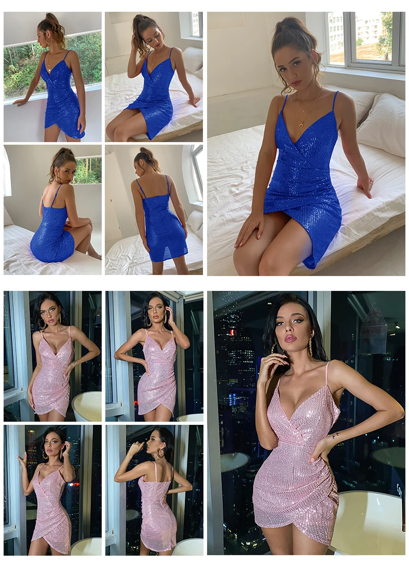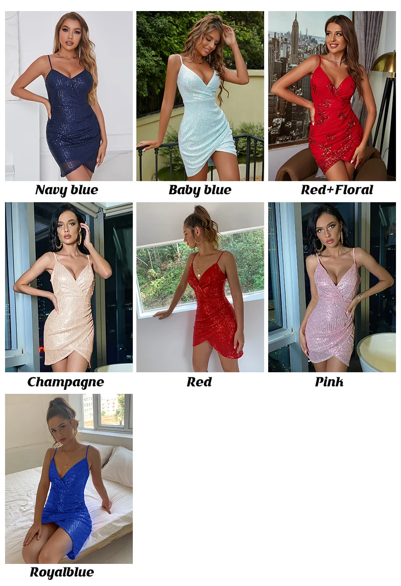D&M Navy Blue Glamorous Wrap Ruched Asymmetrical Hem Sequin Cami Prom Dress For Woman Club Party Wear