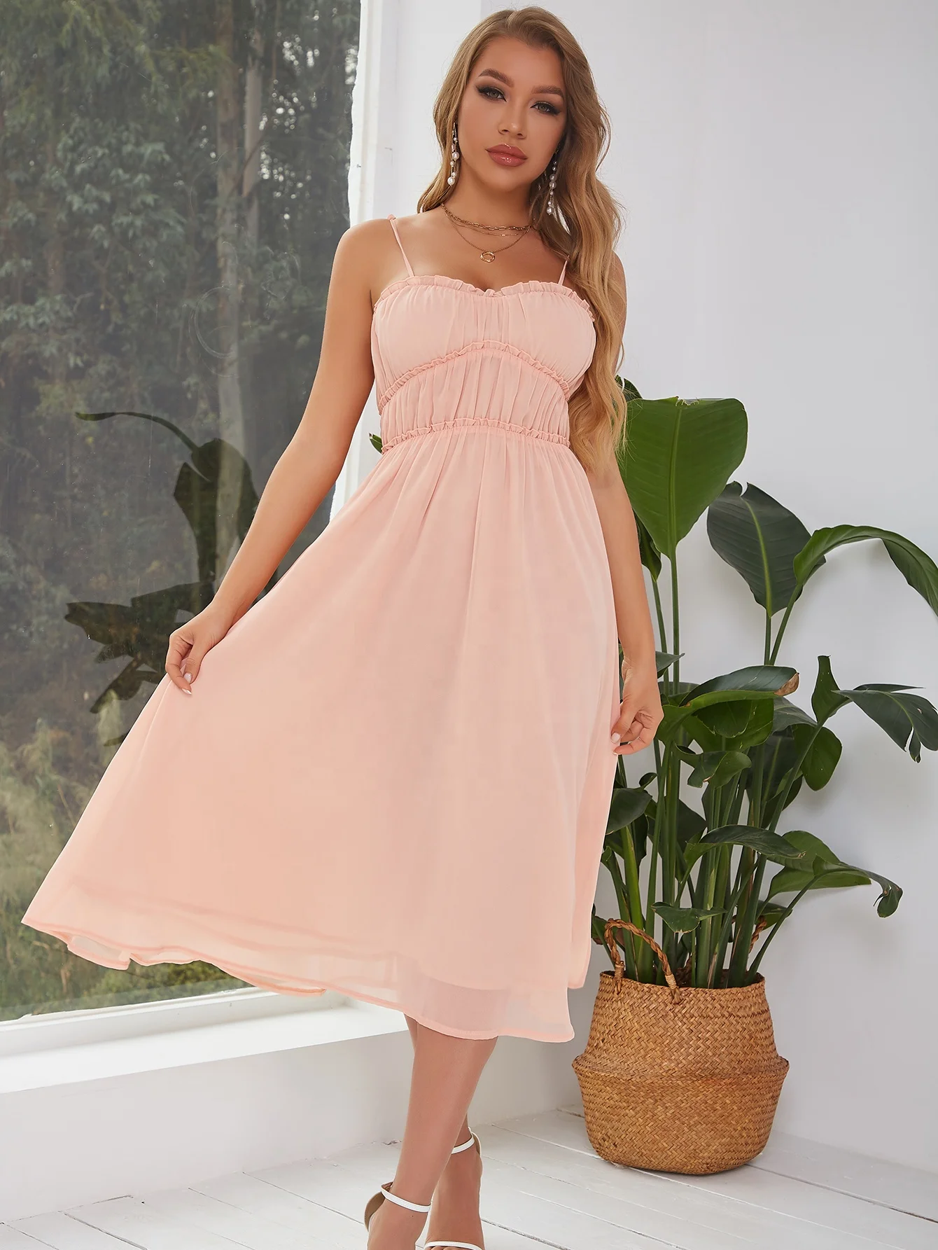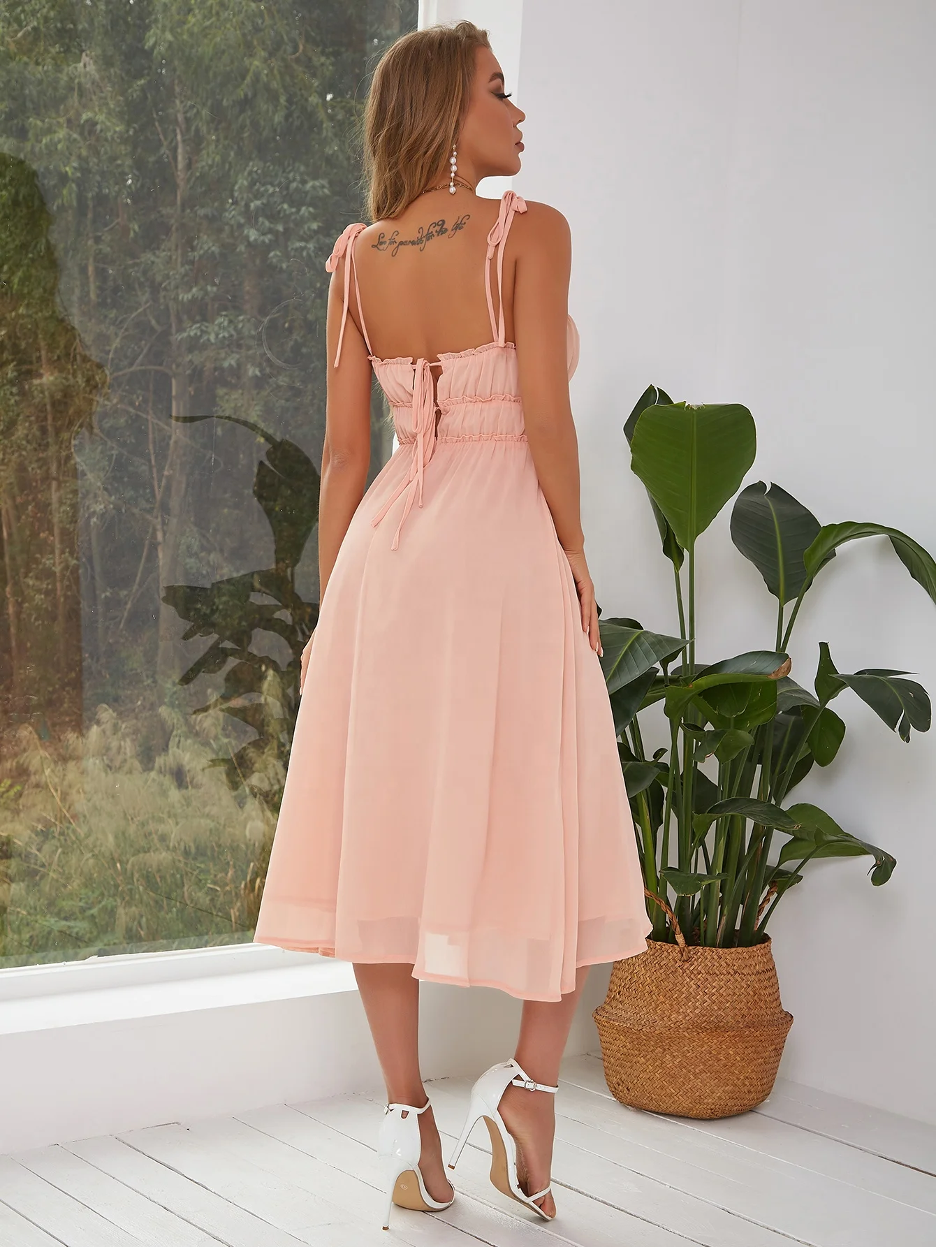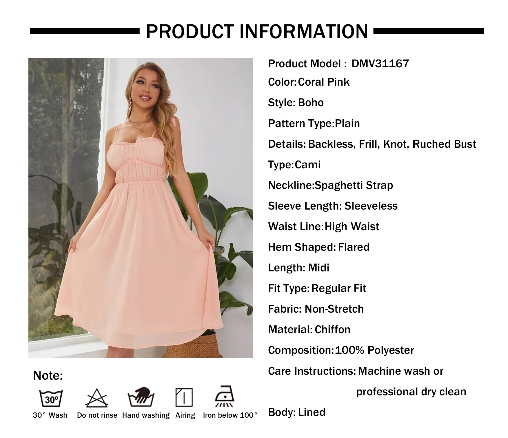 D&M Summer Women Vacation Coral Pink Sleeveless Frilled Backless Knot Ruched Bust Chiffon Flared Midi Casual Cami Dresses
