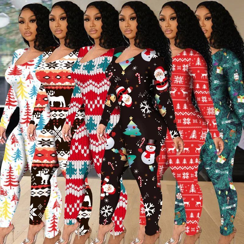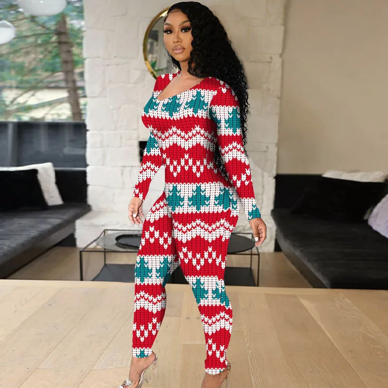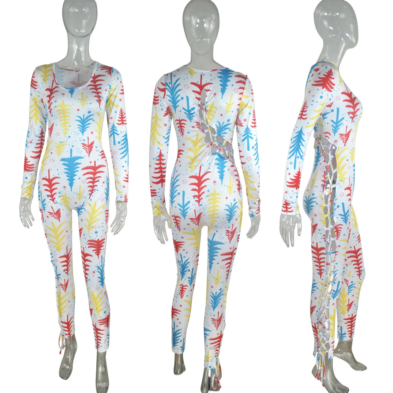 D0302DX34 Christmas Colorful Graphic V-Neck Long Sleeve Hollow out Bodycon Jumpsuit Women Sehe Fashion