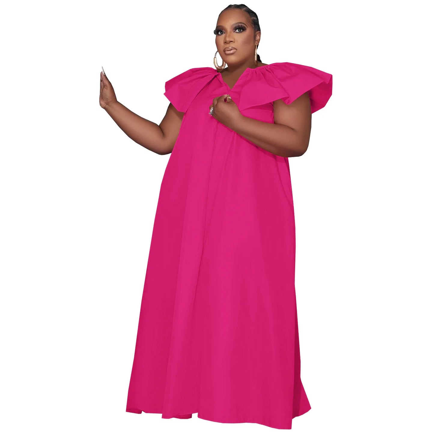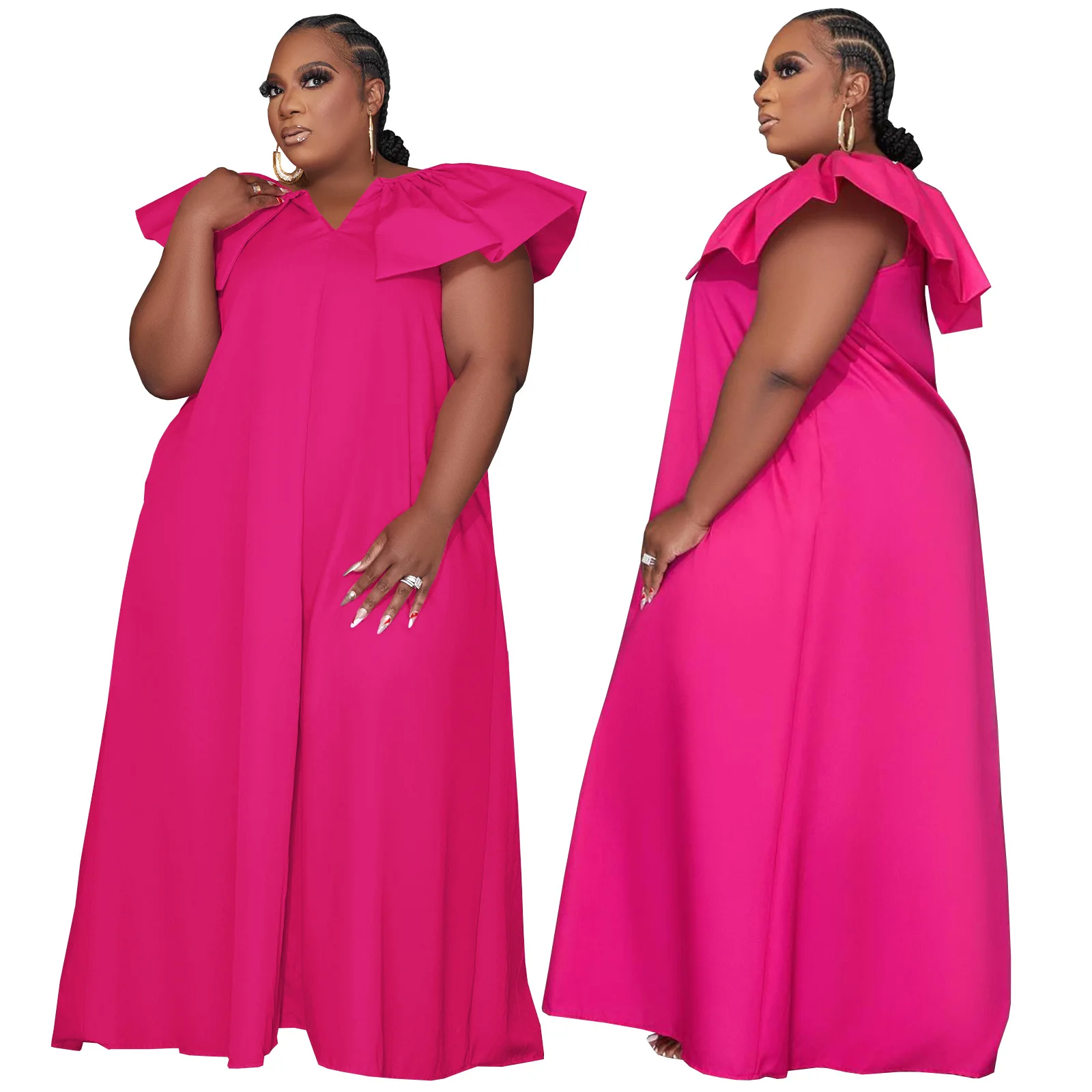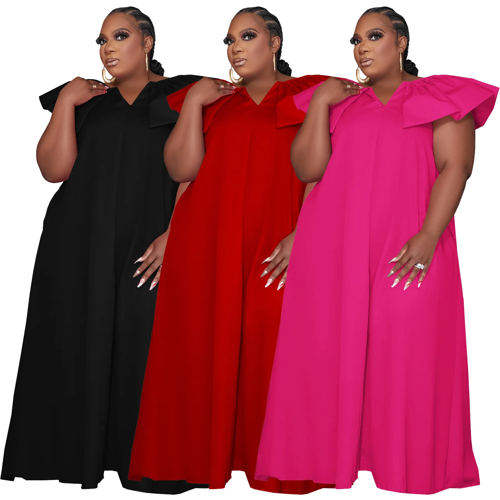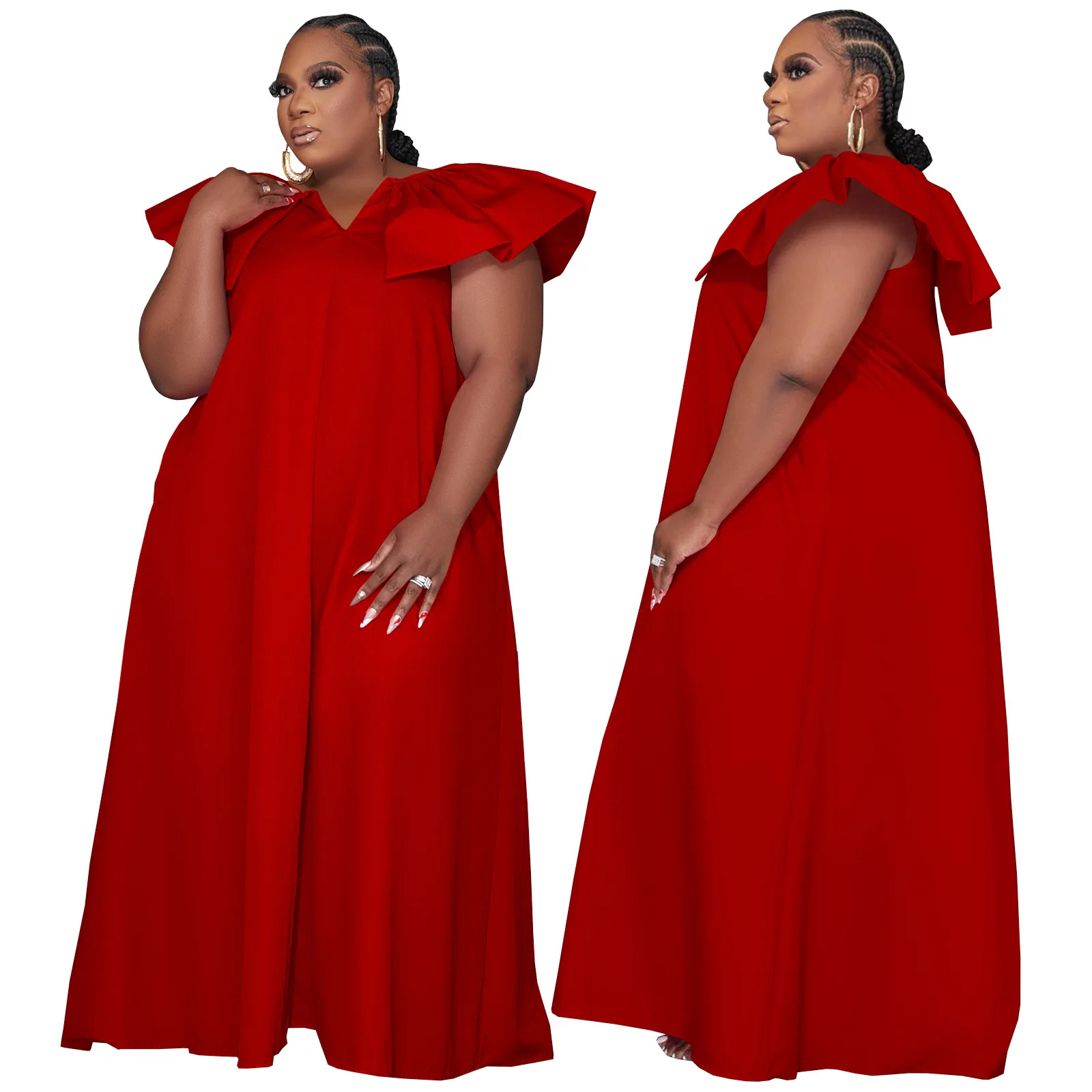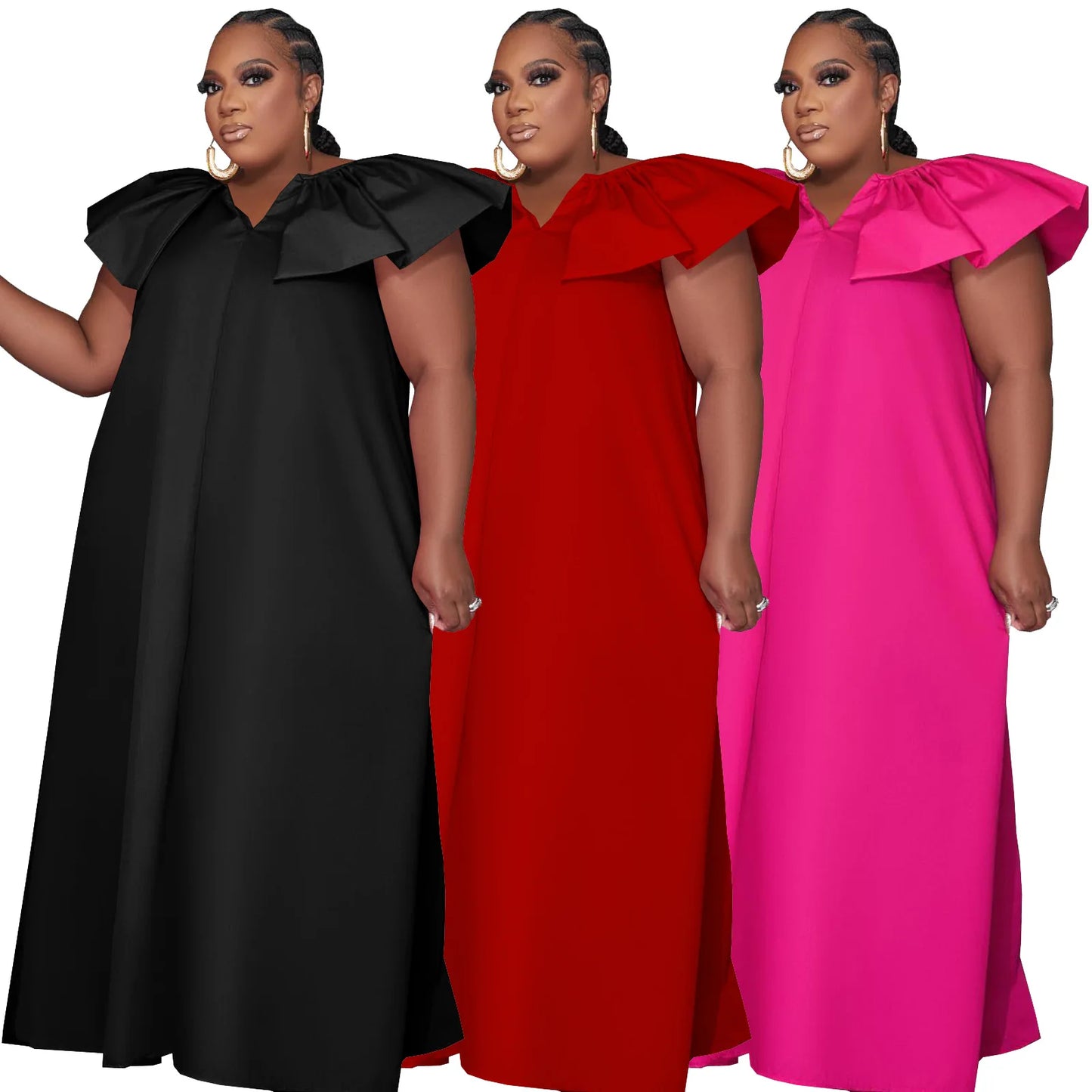D0314ME32 Spot Goods Plus Size Solid Color Lotus Sleeve Loose Casual Women Dress Sehe Fashion