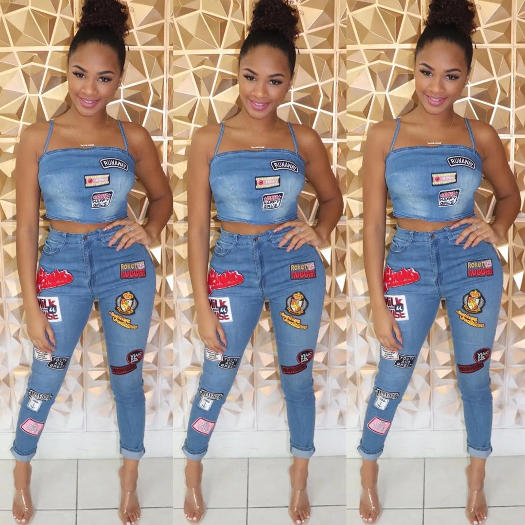 D0314TA82 Direct Sales Going Out Daily Life Pattern Sling Crop Top And Bodycon 2 Piece Long Pant Sets Sehe Fashion