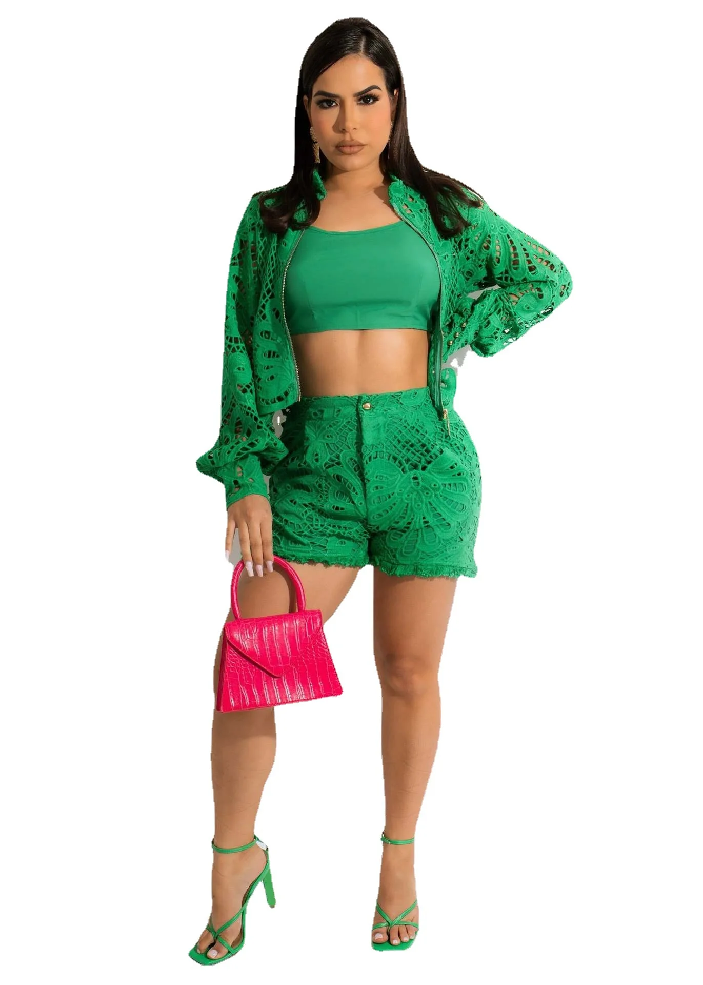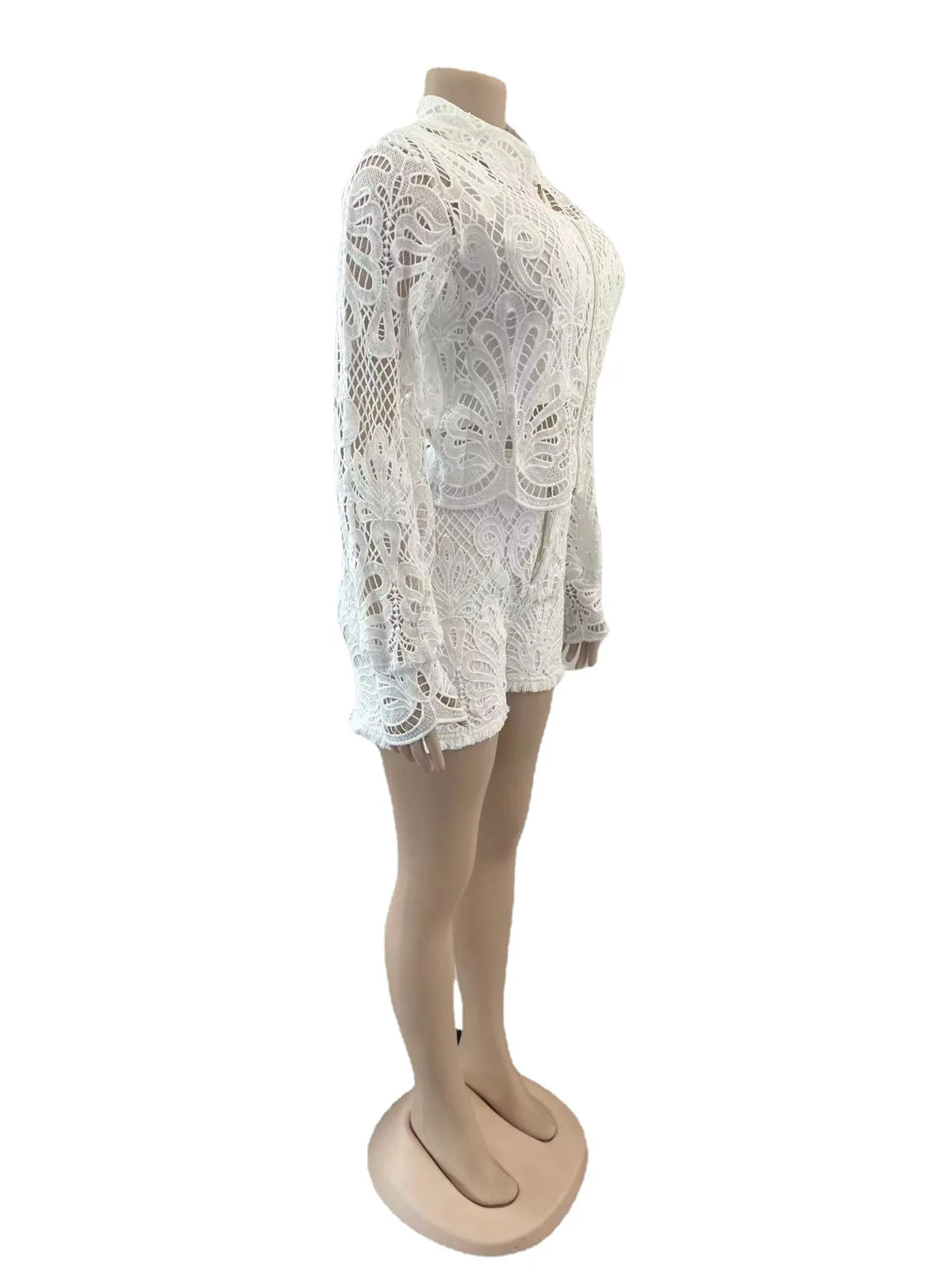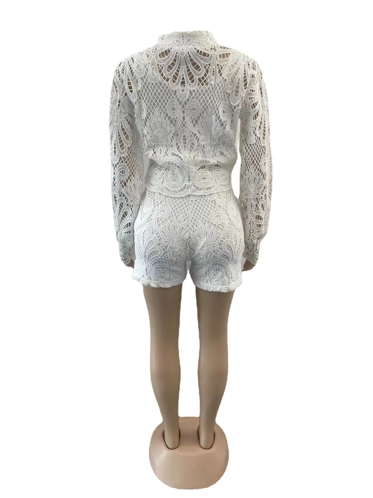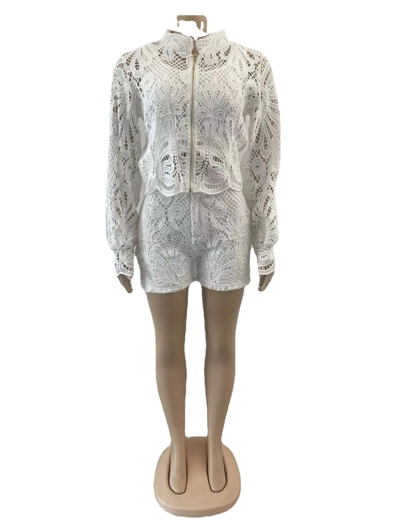 D0314TA84 Wholesale Hot Sale Going Out Solid Color Lace Long Sleeve Zipper Top And Shorts 2-Piece Set Women Sehe Fashion