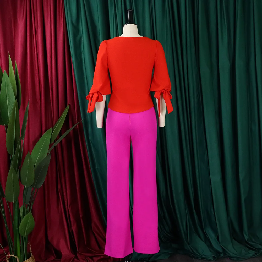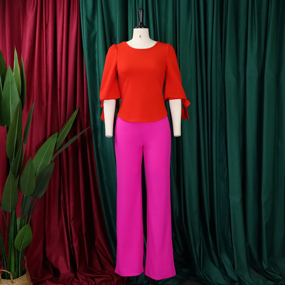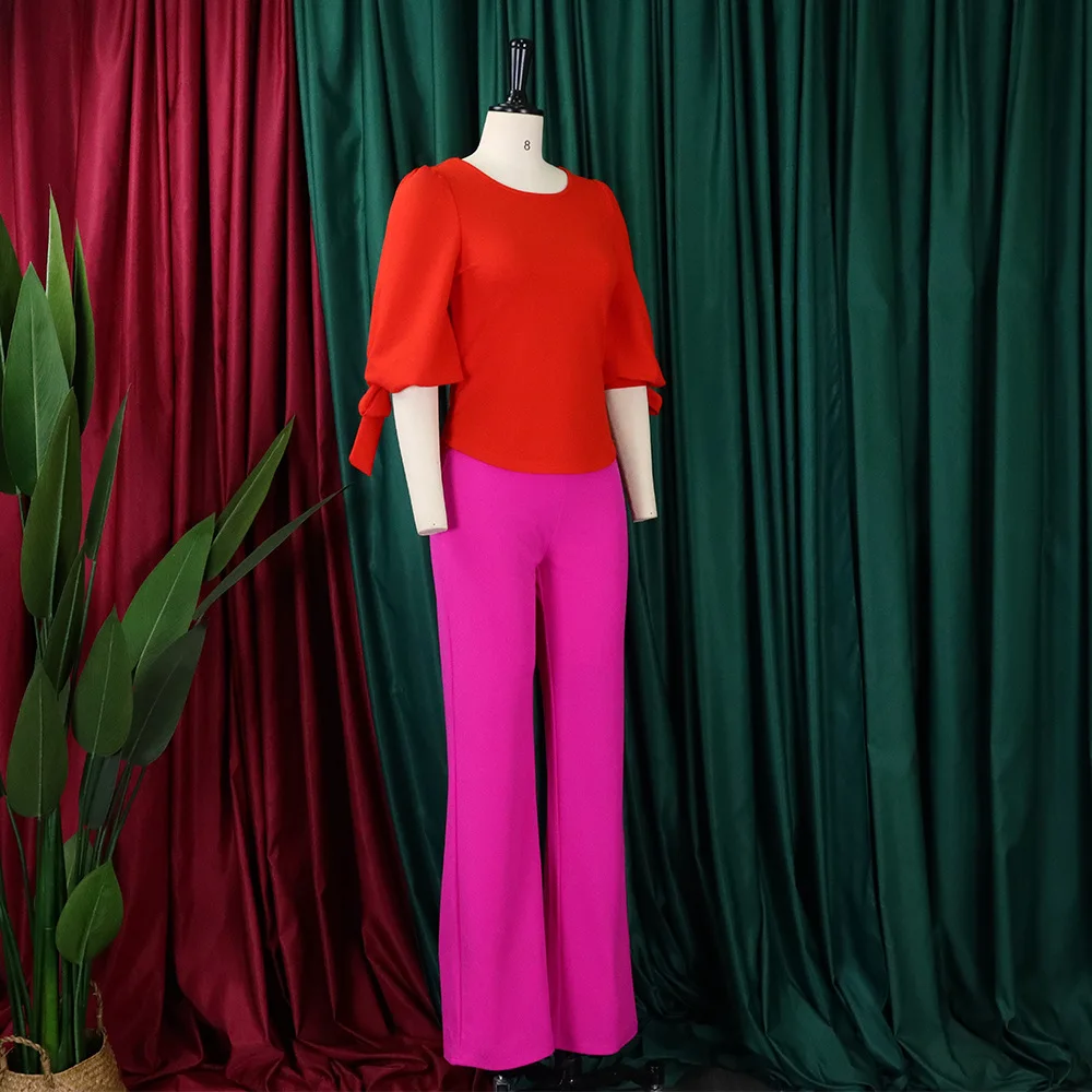 D0408ME12 Wholesale Going Out Solid Color Lantern Sleeve Elegant Long Pant Sets Sehe Fashion