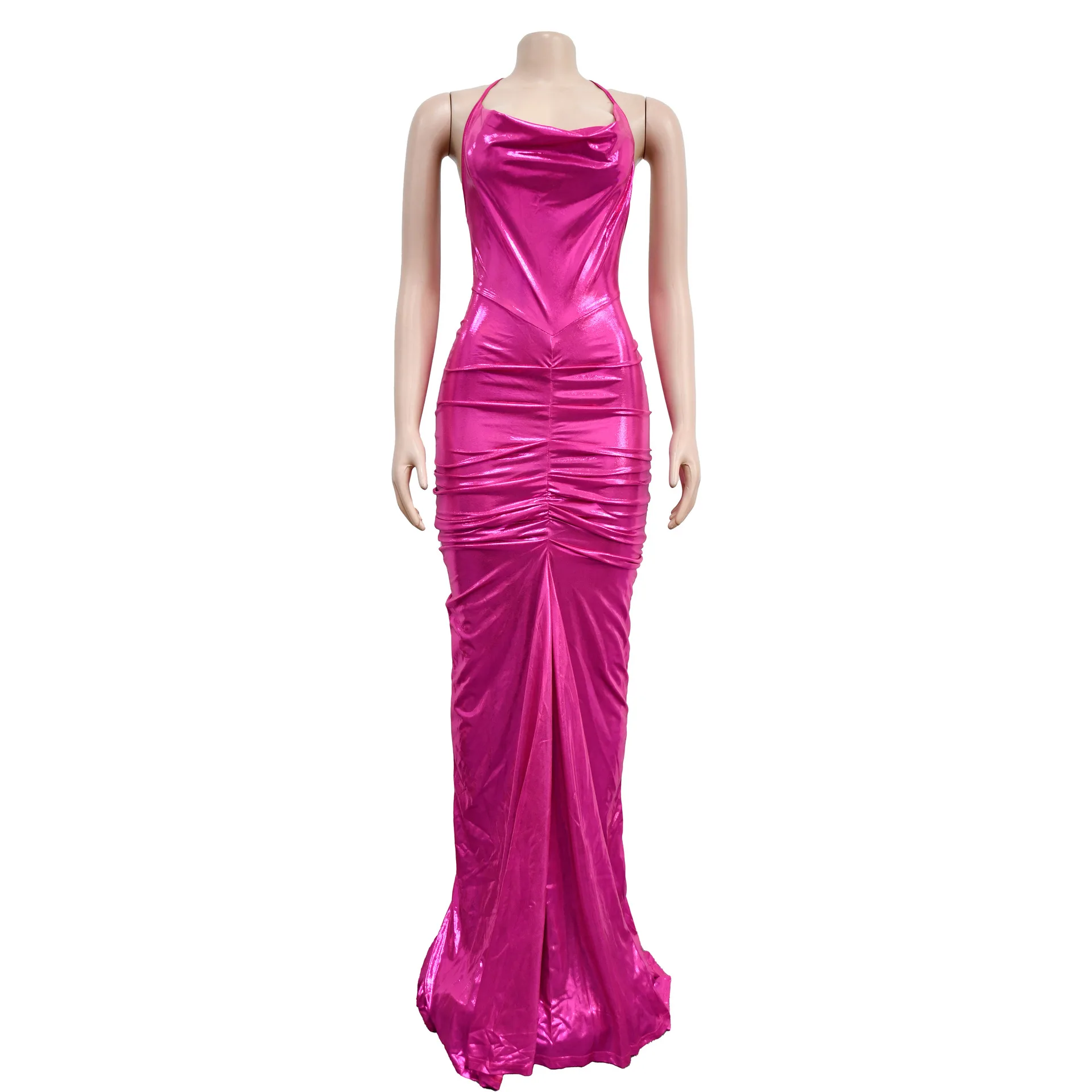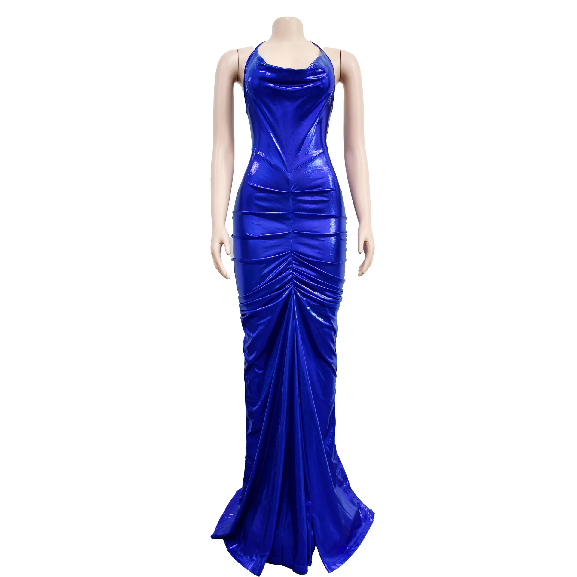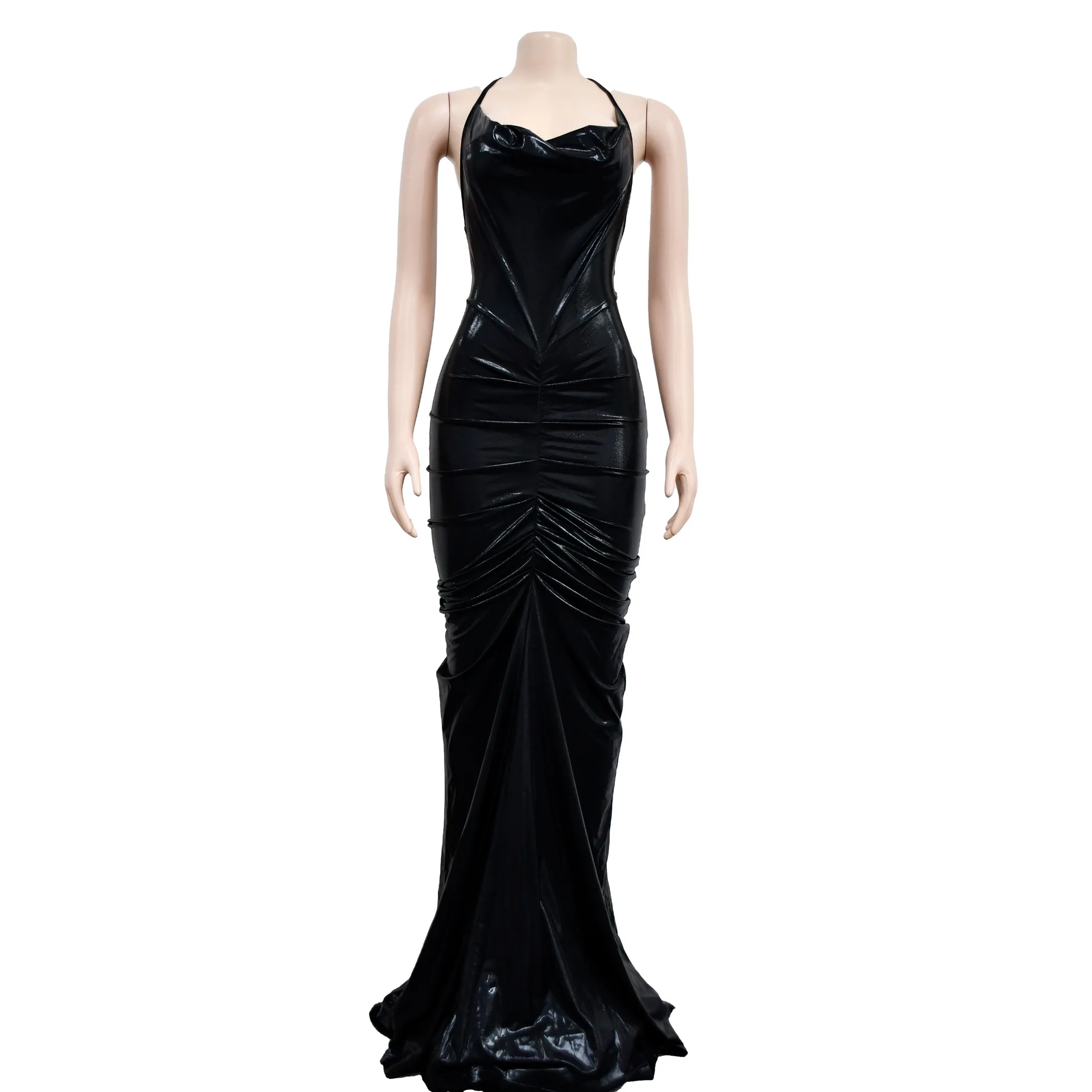 D0411TA24 High Quality Party Sexy Backless Glossy Leather Floor Length Evening Dress For Women Sehe Fashion