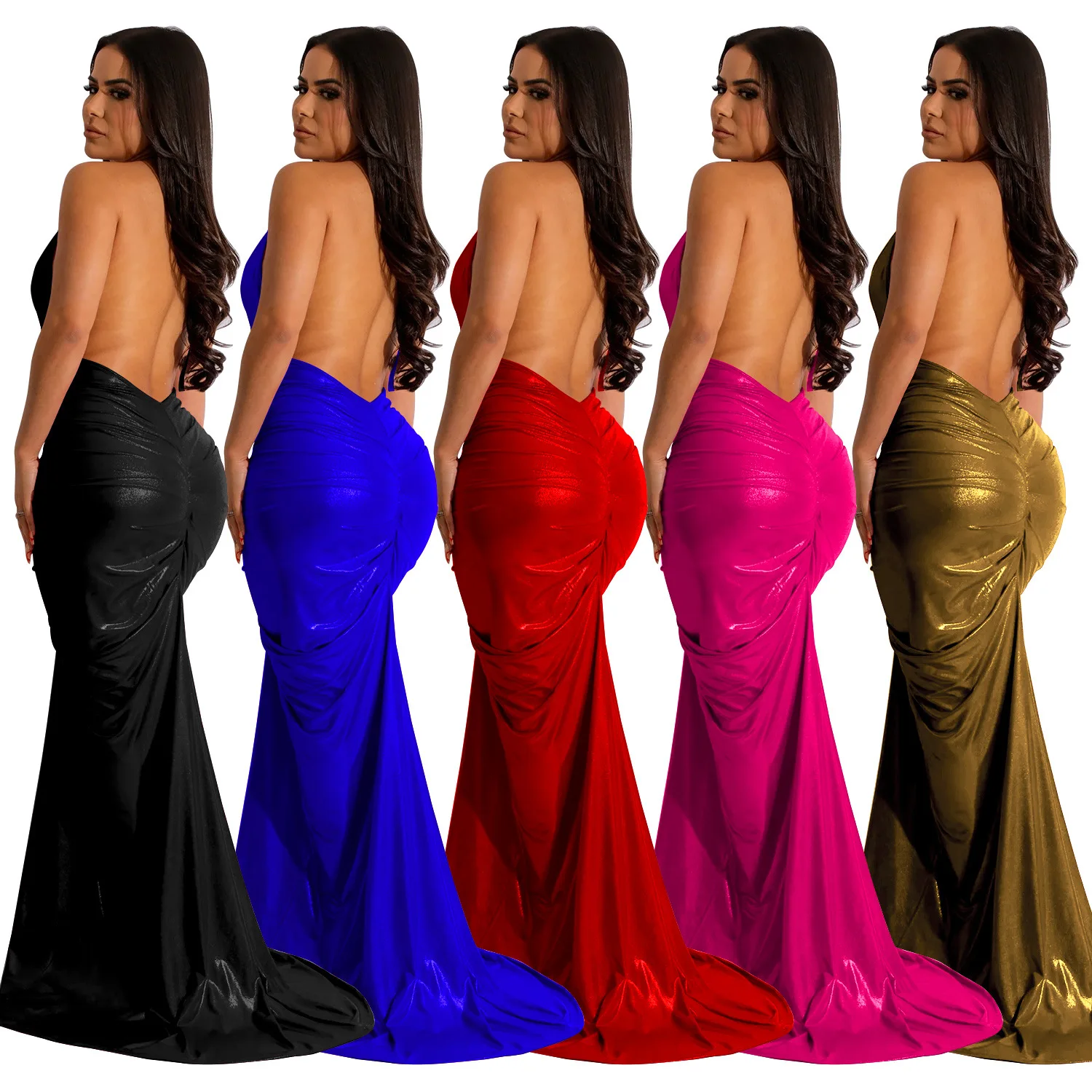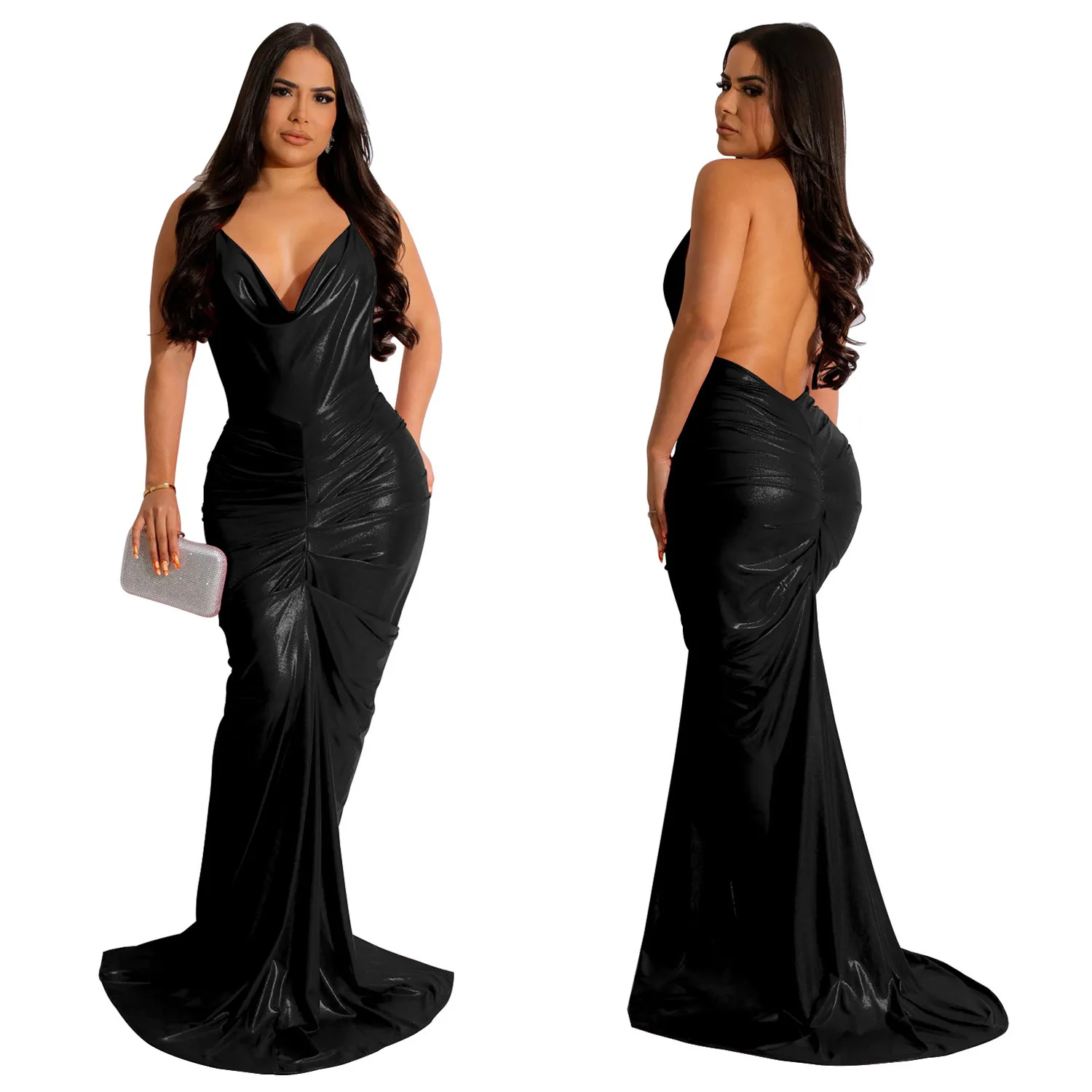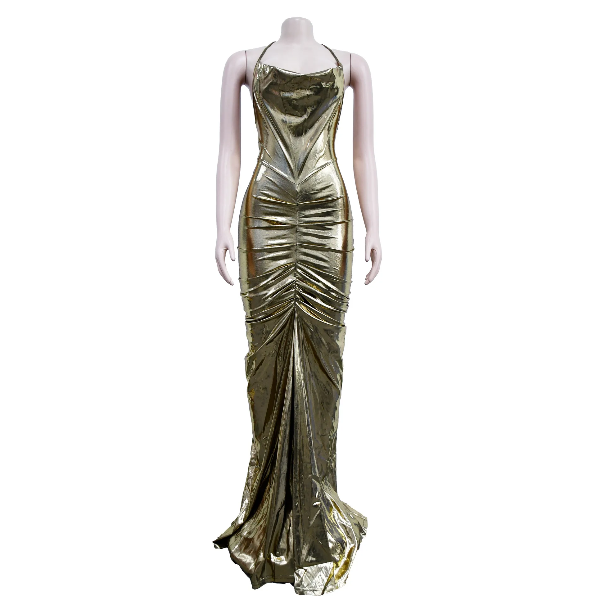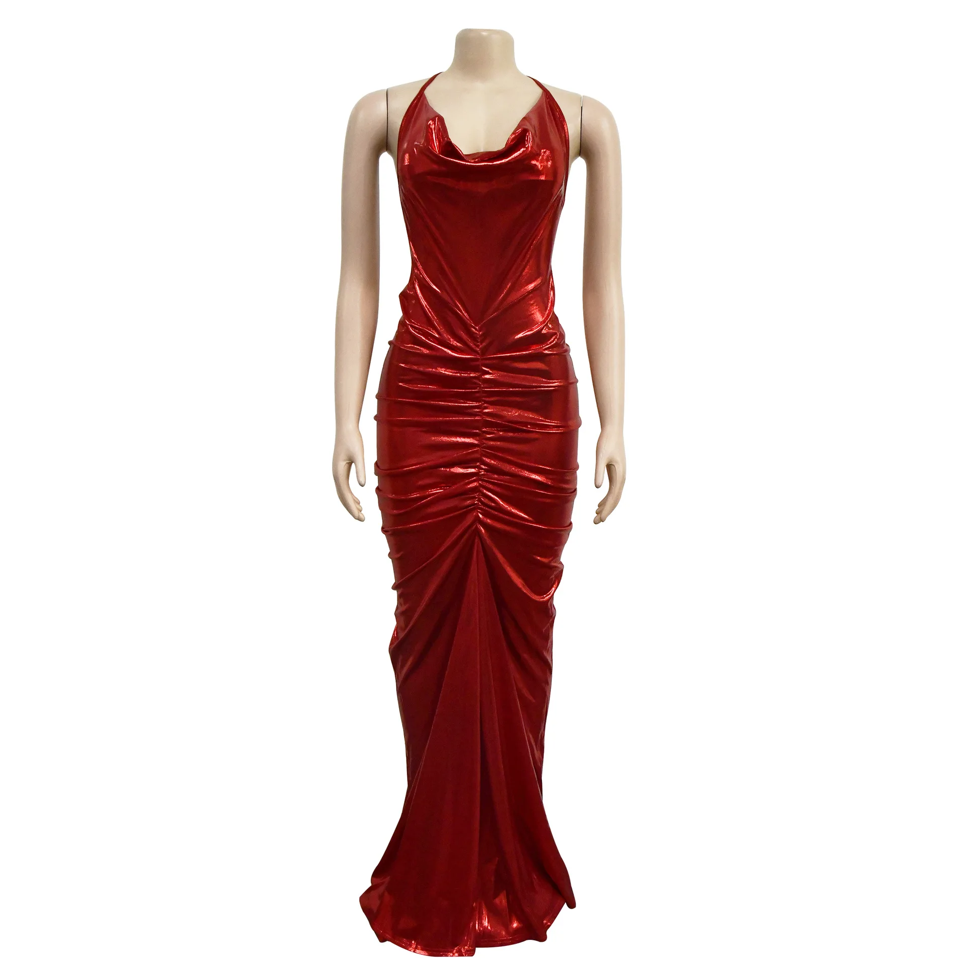D0411TA24 High Quality Party Sexy Backless Glossy Leather Floor Length Evening Dress For Women Sehe Fashion