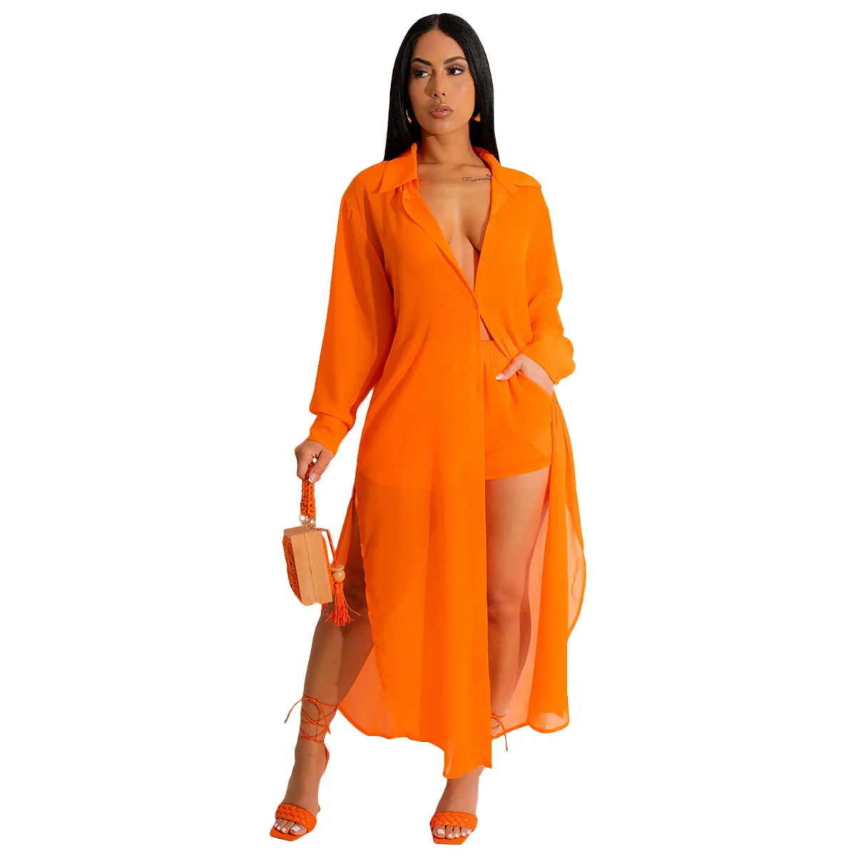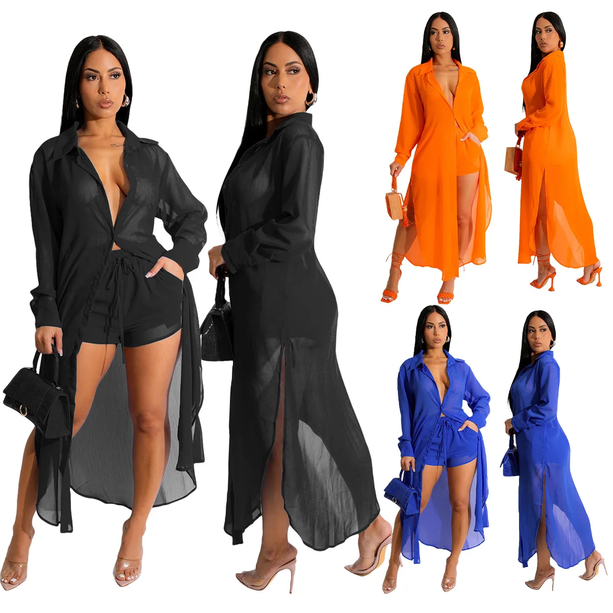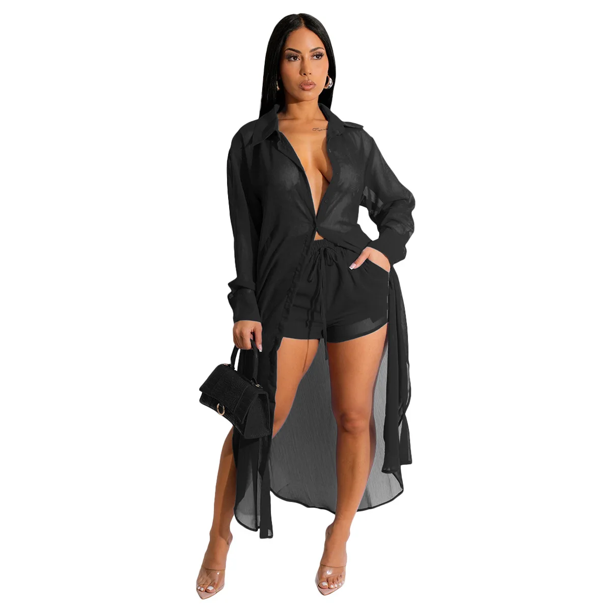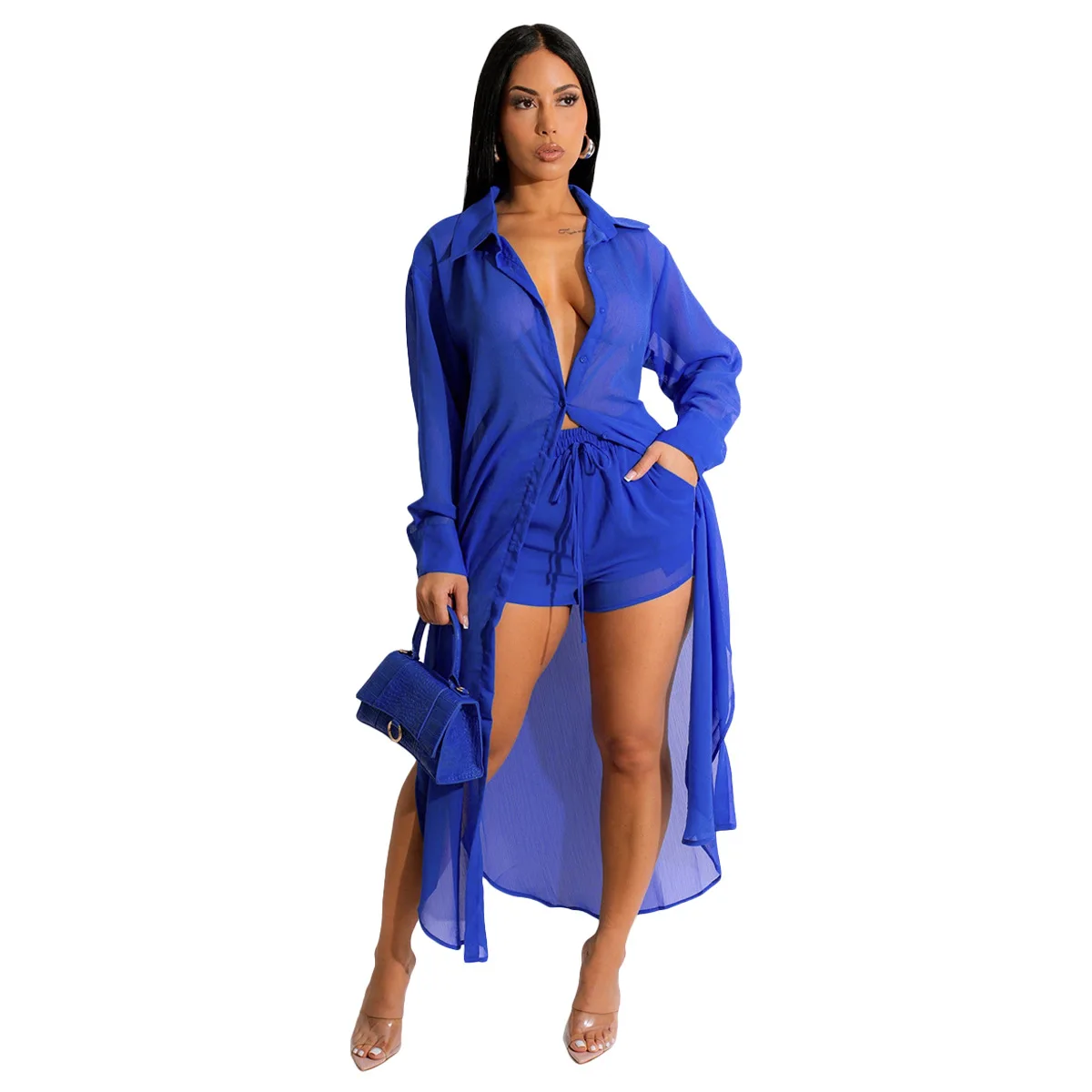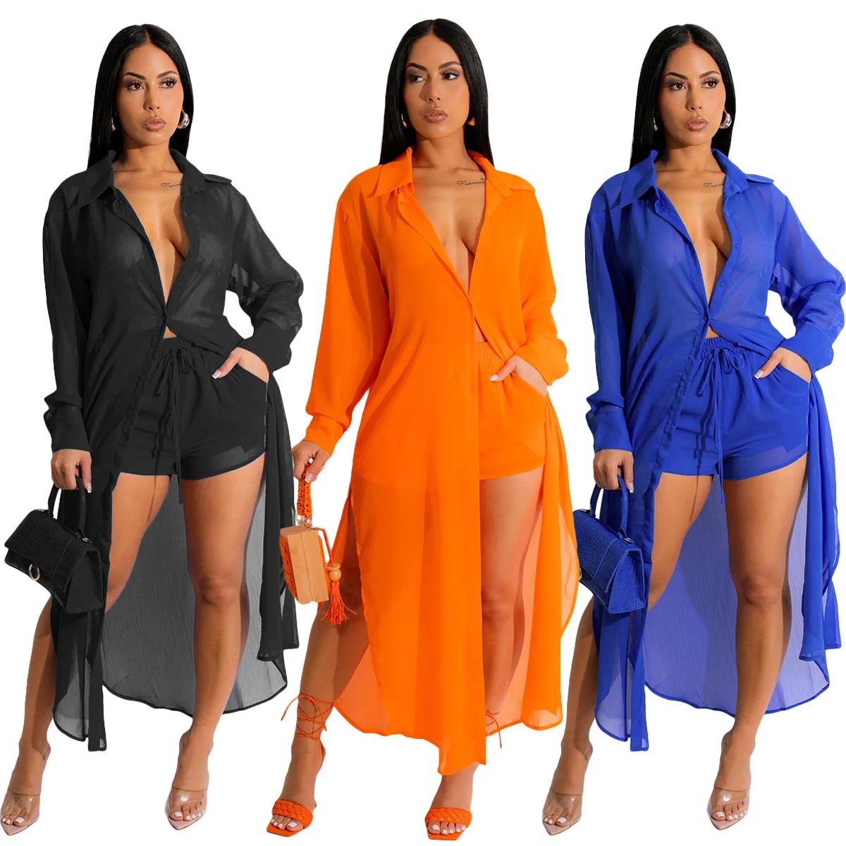 D0411TA47 New Design Casual Long Sleeve Cardigan Solid Color Two Piece Shorts Set Women Sehe Fashion