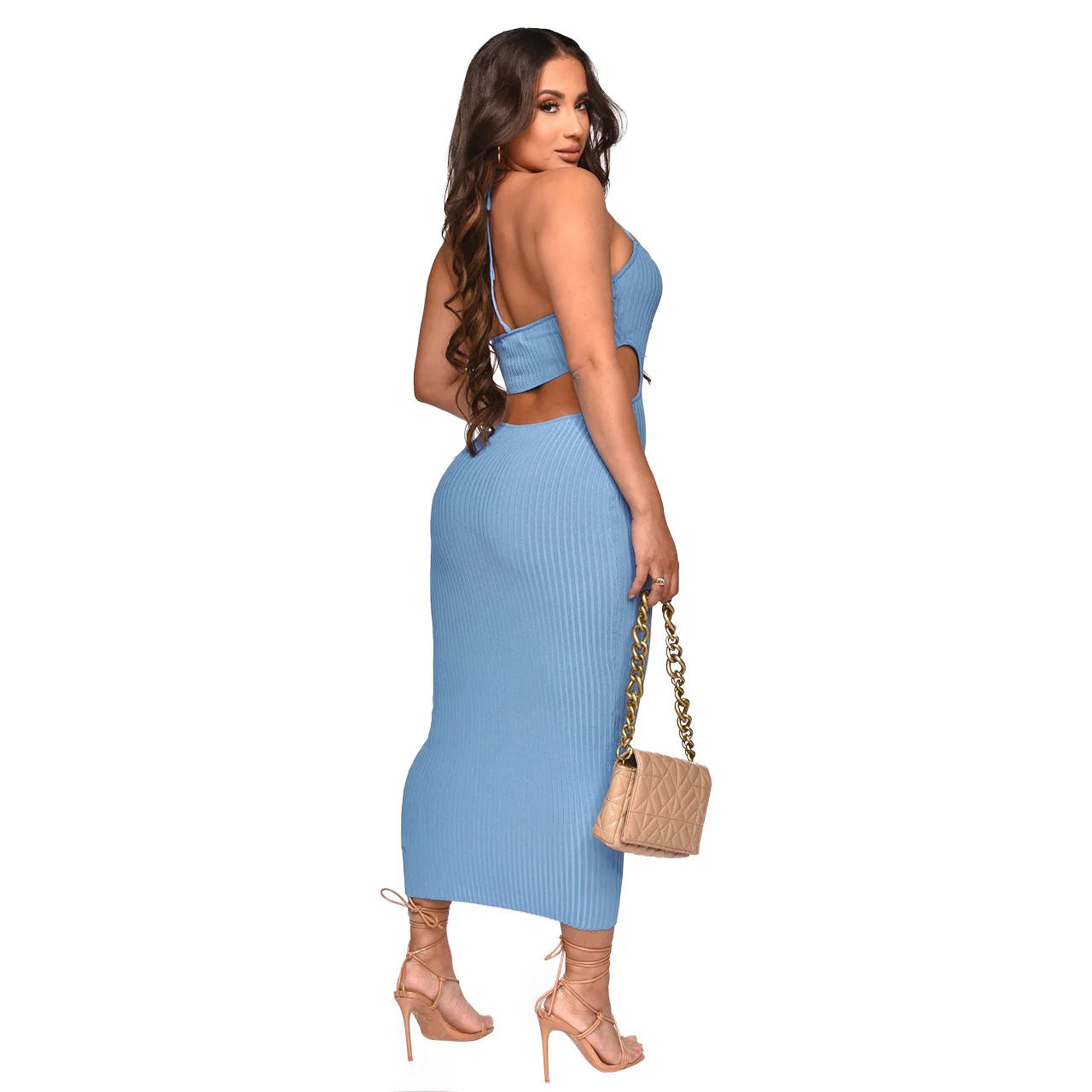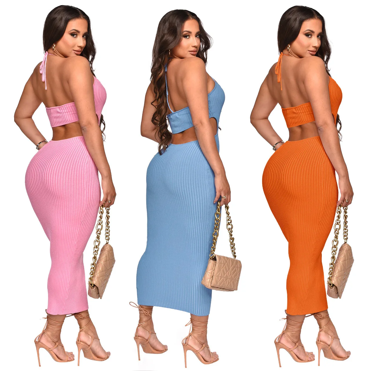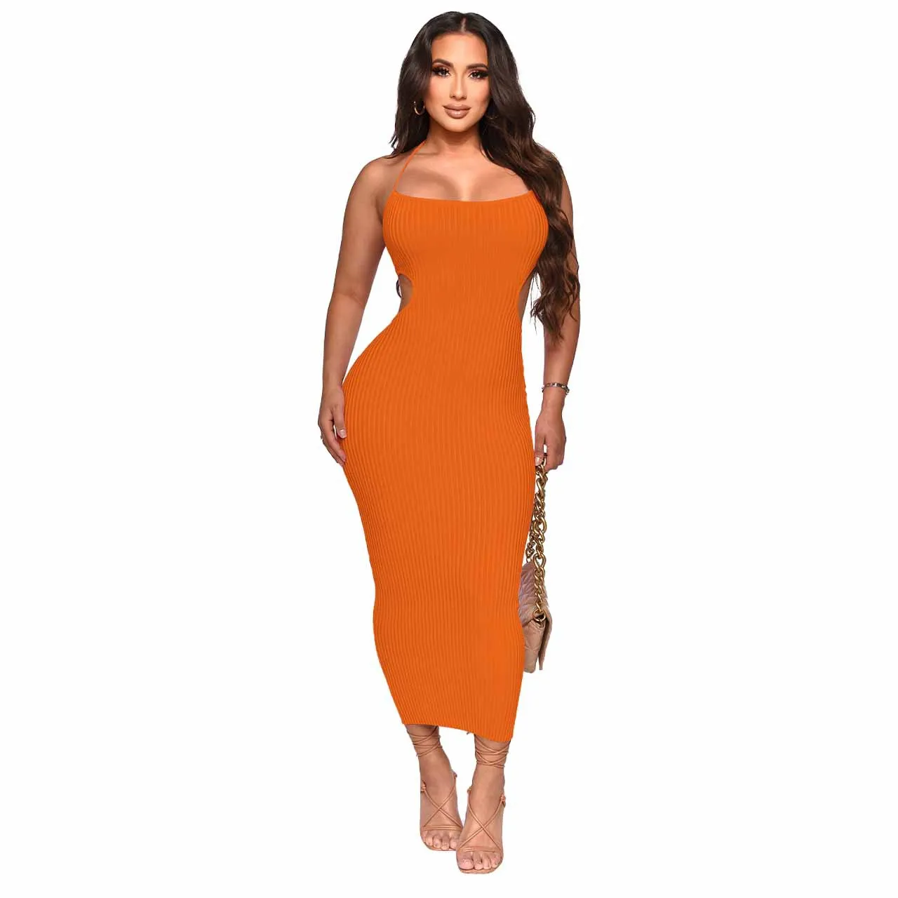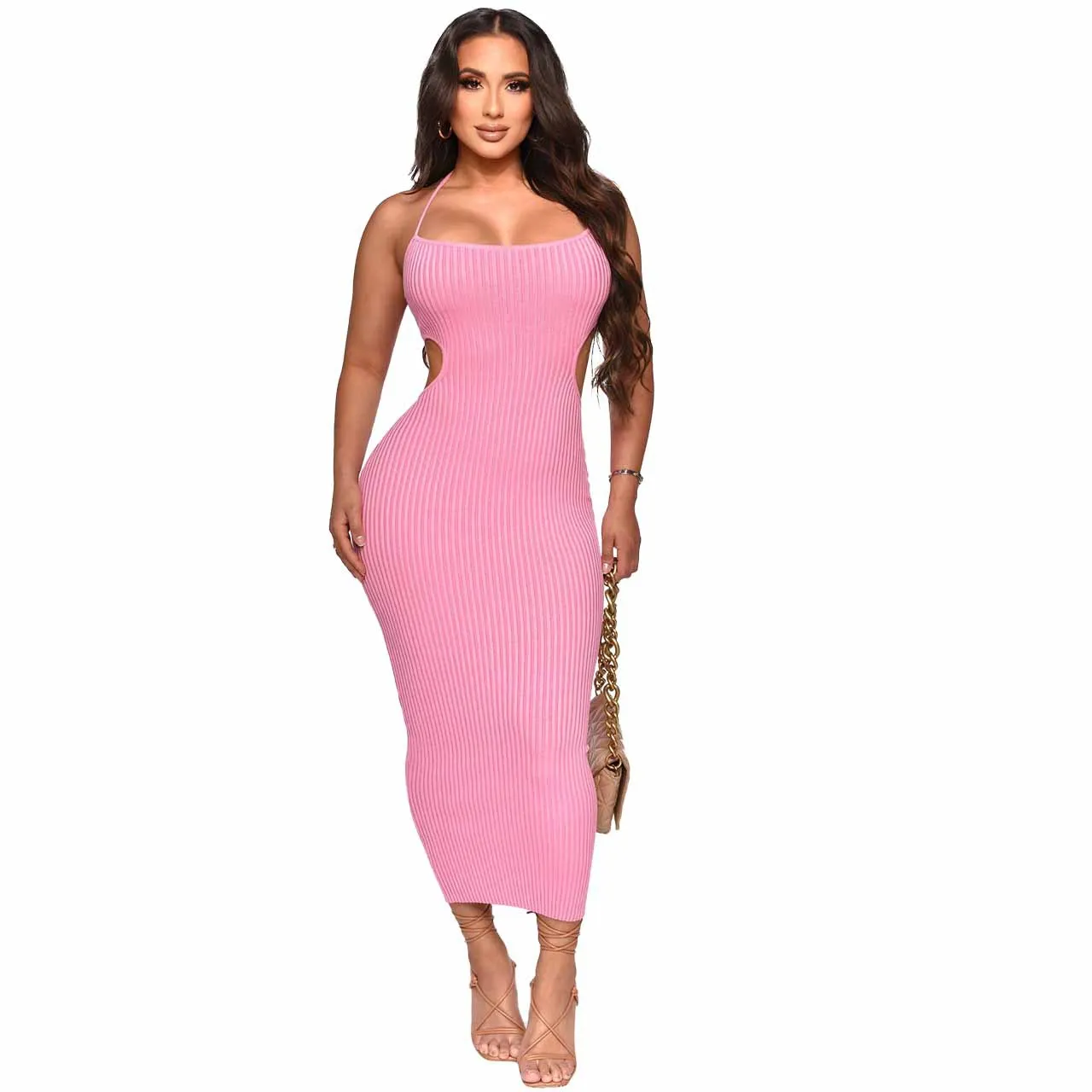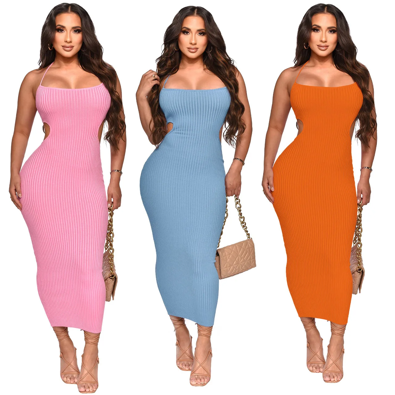 D0411TA74 Wholesale O-neck Long Bodycon Solid Color Hollow Out Dress Women Tie Dyed Sehe Fashion