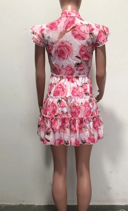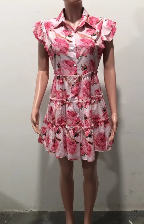 D0814TA10 Ready Stock Floral Print Turn Down Collar Sleeveless Small Ruffles Button Mini Dresses Sehe Fashion